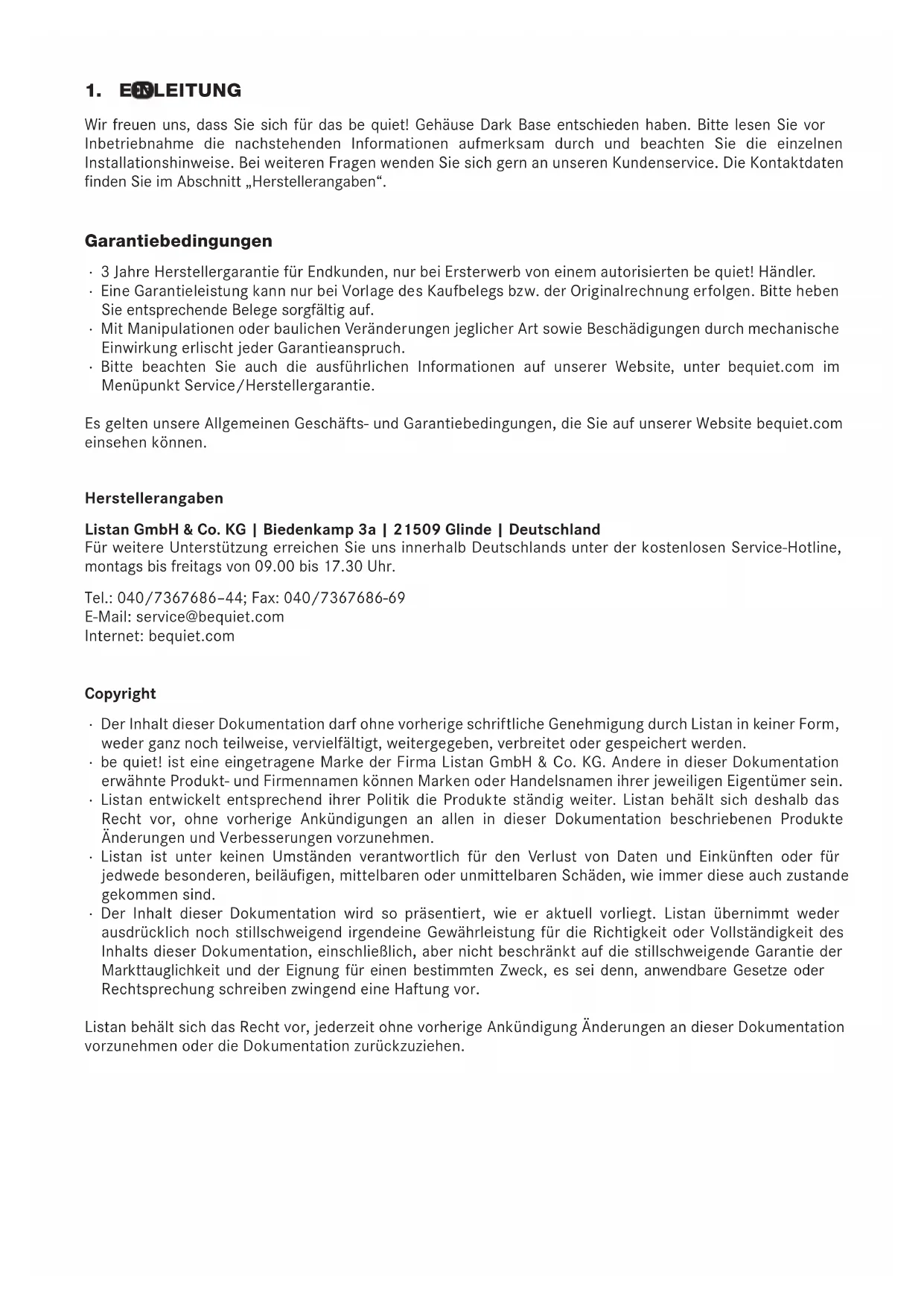 Wir freuen uns, dass Sie sich für das be quiet! Gehäuse Dark Base entschieden haben. Bitte lesen Sie vor Inbetriebnahme die nachstehenden Informationen aufmerksam durch und beachten Sie die einzelnen Installationshinweise. Bei weiteren Fragen wenden Sie sich gern an unseren Kundenservice. Die Kontaktdaten ndenSieimAbschnitt„Herstellerangaben“. Garantiebedingungen ∙ 3 Jahre Herstellergarantie für Endkunden, nur bei Ersterwerb von einem autorisierten be quiet! Händler. ∙ Eine Garantieleistung kann nur bei Vorlage des Kaufbelegs bzw. der Originalrechnung erfolgen. Bitte heben Sie entsprechende Belege sorgfältig auf. ∙ Mit Manipulationen oder baulichen Veränderungen jeglicher Art sowie Beschädigungen durch mechanische Einwirkung erlischt jeder Garantieanspruch. ∙ Bitte beachten Sie auch die ausführlichen Informationen auf unserer Website, unter bequiet.com im Menüpunkt Service/Herstellergarantie. Es gelten unsere Allgemeinen Geschäfts- und Garantiebedingungen, die Sie auf unserer Website bequiet.com einsehen können. Herstellerangaben Listan GmbH & Co. KG | Biedenkamp 3a | 21509 Glinde | Deutschland Für weitere Unterstützung erreichen Sie uns innerhalb Deutschlands unter der kostenlosen Service-Hotline, montags bis freitags von 09.00 bis 17.30 Uhr. Tel.: 040/7367686–44; Fax: 040/7367686-69 E-Mail: service@bequiet.com Internet: bequiet.com Copyright ∙ Der Inhalt dieser Dokumentation darf ohne vorherige schriftliche Genehmigung durch Listan in keiner Form, weder ganz noch teilweise, vervielfältigt, weitergegeben, verbreitet oder gespeichert werden. ∙ be quiet! ist eine eingetragene Marke der Firma Listan GmbH & Co. KG. Andere in dieser Dokumentation erwähnte Produkt- und Firmennamen können Marken oder Handelsnamen ihrer jeweiligen Eigentümer sein. ∙ Listan entwickelt entsprechend ihrer Politik die Produkte ständig weiter. Listan behält sich deshalb das Recht vor, ohne vorherige Ankündigungen an allen in dieser Dokumentation beschriebenen Produkte Änderungen und Verbesserungen vorzunehmen. ∙ Listan ist unter keinen Umständen verantwortlich für den Verlust von Daten und Einkünften oder für jedwedebesonderen,beiläugen,mittelbarenoderunmittelbarenSchäden,wieimmerdieseauchzustande gekommen sind. ∙ Der Inhalt dieser Dokumentation wird so präsentiert, wie er aktuell vorliegt. Listan übernimmt weder ausdrücklich noch stillschweigend irgendeine Gewährleistung für die Richtigkeit oder Vollständigkeit des Inhalts dieser Dokumentation, einschließlich, aber nicht beschränkt auf die stillschweigende Garantie der Markttauglichkeit und der Eignung für einen bestimmten Zweck, es sei denn, anwendbare Gesetze oder Rechtsprechung schreiben zwingend eine Haftung vor. Listan behält sich das Recht vor, jederzeit ohne vorherige Ankündigung Änderungen an dieser Dokumentation vorzunehmen oder die Dokumentation zurückzuziehen.12 13