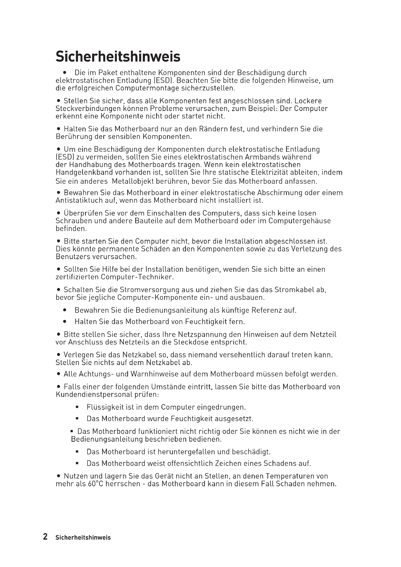 H310M PRO-M2 Mother- board entschieden haben. Dieses Handbuch gibt informationen über Motherboard-Layout, Komponenten- übersicht, BIOS-Setup und Softwareinstallation.2 Sicherheitshinweis Sicherheitshinweis y Die im Paket enthaltene Komponenten sind der Beschädigung durch elektrostatischen Entladung (ESD). Beachten Sie bitte die folgenden Hinweise, um die erfolgreichen Computermontage sicherzustellen. y Stellen Sie sicher, dass alle Komponenten fest angeschlossen sind. Lockere Steckverbindungen können Probleme verursachen, zum Beispiel: Der Computer erkennt eine Komponente nicht oder startet nicht. y Halten Sie das Motherboard nur an den Rändern fest, und verhindern Sie die Berührung der sensiblen Komponenten. y Um eine Beschädigung der Komponenten durch elektrostatische Entladung (ESD) zu vermeiden, sollten Sie eines elektrostatischen Armbands während der Handhabung des Motherboards tragen. Wenn kein elektrostatischen Handgelenkband vorhanden ist, sollten Sie Ihre statische Elektrizität ableiten, indem Sie ein anderes Metallobjekt berühren, bevor Sie das Motherboard anfassen. y Bewahren Sie das Motherboard in einer elektrostatische Abschirmung oder einem Antistatiktuch auf, wenn das Motherboard nicht installiert ist. y Überprüfen Sie vor dem Einschalten des Computers, dass sich keine losen Schrauben und andere Bauteile auf dem Motherboard oder im Computergehäuse befinden. y Bitte starten Sie den Computer nicht, bevor die Installation abgeschlossen ist. Dies könnte permanente Schäden an den Komponenten sowie zu das Verletzung des Benutzers verursachen. y Sollten Sie Hilfe bei der Installation benötigen, wenden Sie sich bitte an einen zertifizierten Computer-Techniker. y Schalten Sie die Stromversorgung aus und ziehen Sie das das Stromkabel ab, bevor Sie jegliche Computer-Komponente ein- und ausbauen. y Bewahren Sie die Bedienungsanleitung als künftige Referenz auf. y Halten Sie das Motherboard von Feuchtigkeit fern. y Bitte stellen Sie sicher, dass Ihre Netzspannung den Hinweisen auf dem Netzteil vor Anschluss des Netzteils an die Steckdose entspricht. y Verlegen Sie das Netzkabel so, dass niemand versehentlich darauf treten kann. Stellen Sie nichts auf dem Netzkabel ab. y Alle Achtungs- und Warnhinweise auf dem Motherboard müssen befolgt werden. y Falls einer der folgenden Umstände eintritt, lassen Sie bitte das Motherboard von Kundendienstpersonal prüfen: Flüssigkeit ist in dem Computer eingedrungen. Das Motherboard wurde Feuchtigkeit ausgesetzt. Das Motherboard funktioniert nicht richtig oder Sie können es nicht wie in der Bedienungsanleitung beschrieben bedienen. Das Motherboard ist heruntergefallen und beschädigt. Das Motherboard weist offensichtlich Zeichen eines Schadens auf. y Nutzen und lagern Sie das Gerät nicht an Stellen, an denen Temperaturen von mehr als 60°C herrschen - das Motherboard kann in diesem Fall Schaden nehmen.3 Sicherheitshinweis Spezifikationen Spezifikationen CPU Unterstützt Intel