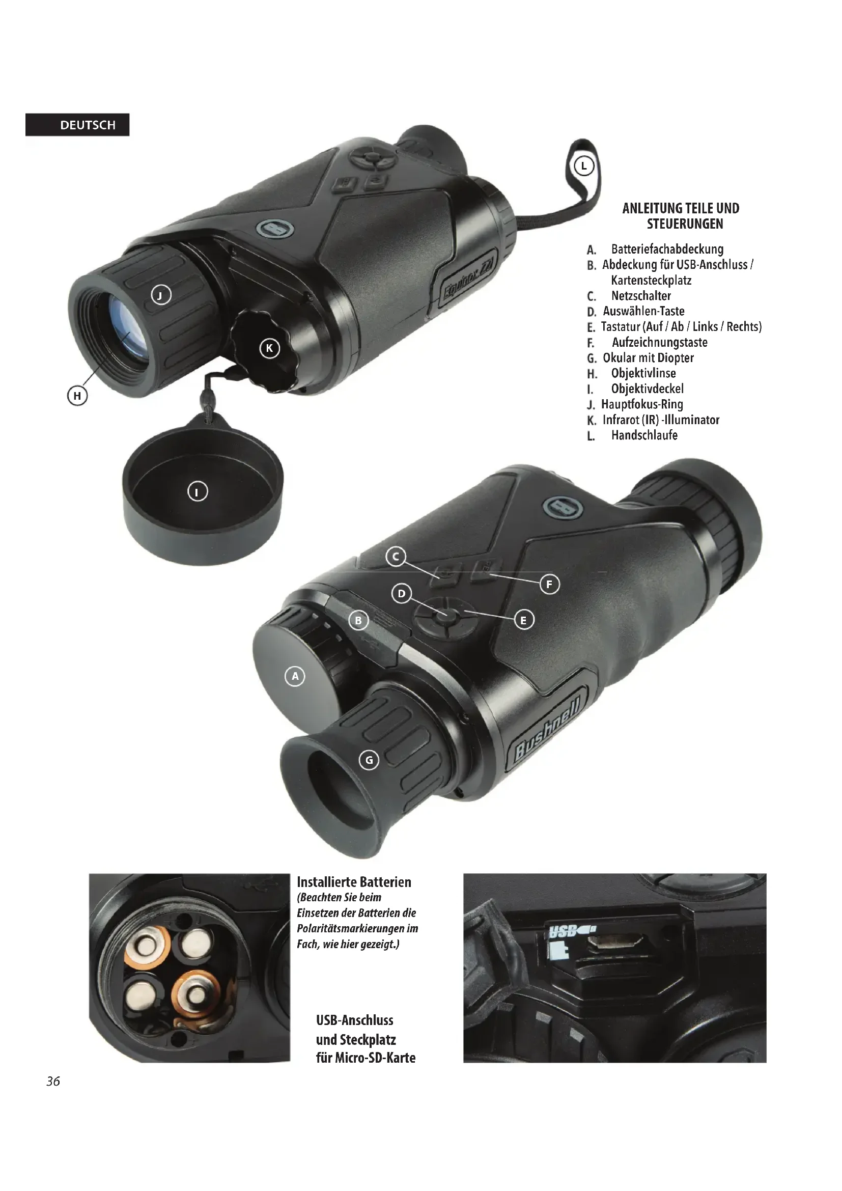 DEUTSCH37 ÜBER BUSHNELL® EQUINOX Z2™ DIGITAL NIGHT VISION Herzlichen Glückwunsch zum Kauf Ihres Bushnell® Equinox Z2™ Digital Night Vision. Das Bushnell Equinox Z2 ist ein digitales, tragbares Nachtsichtsystem, das aus hochwertiger Elektronik und Optik besteht und einen infrarotemp ndlichen CMOS-Sensor verwendet, der eine Rand-zu-Rand-Au ösung und eine hervorragende Bildqualität bietet. Eine vollständig mehrfachvergütete Optik erhöht die Lichtdurchlässigkeit und verringert Blendung. Die Equinox Z2 3x30, 4,5x40 und 6x50 Digital Night Vision-Monokulare sind vielseitig genug für viele Anwendungen, darunter Jagd, Camping, Bootfahren / Angeln, Höhlenforschung, Paintball, Sternengucken, Rettung / Bergung, Sicherheitsüberwachung, Strafverfolgung und Videoaufzeichnung bei ständig sich ändernden Lichtbedingungen – vom Morgengrauen bis zur absoluten Dunkelheit. Sie können Ihr Motiv nicht nur nachts anzeigen, sondern auch als Standbild oder Videoclip aufnehmen und auf einer Micro-SD-Karte speichern.
