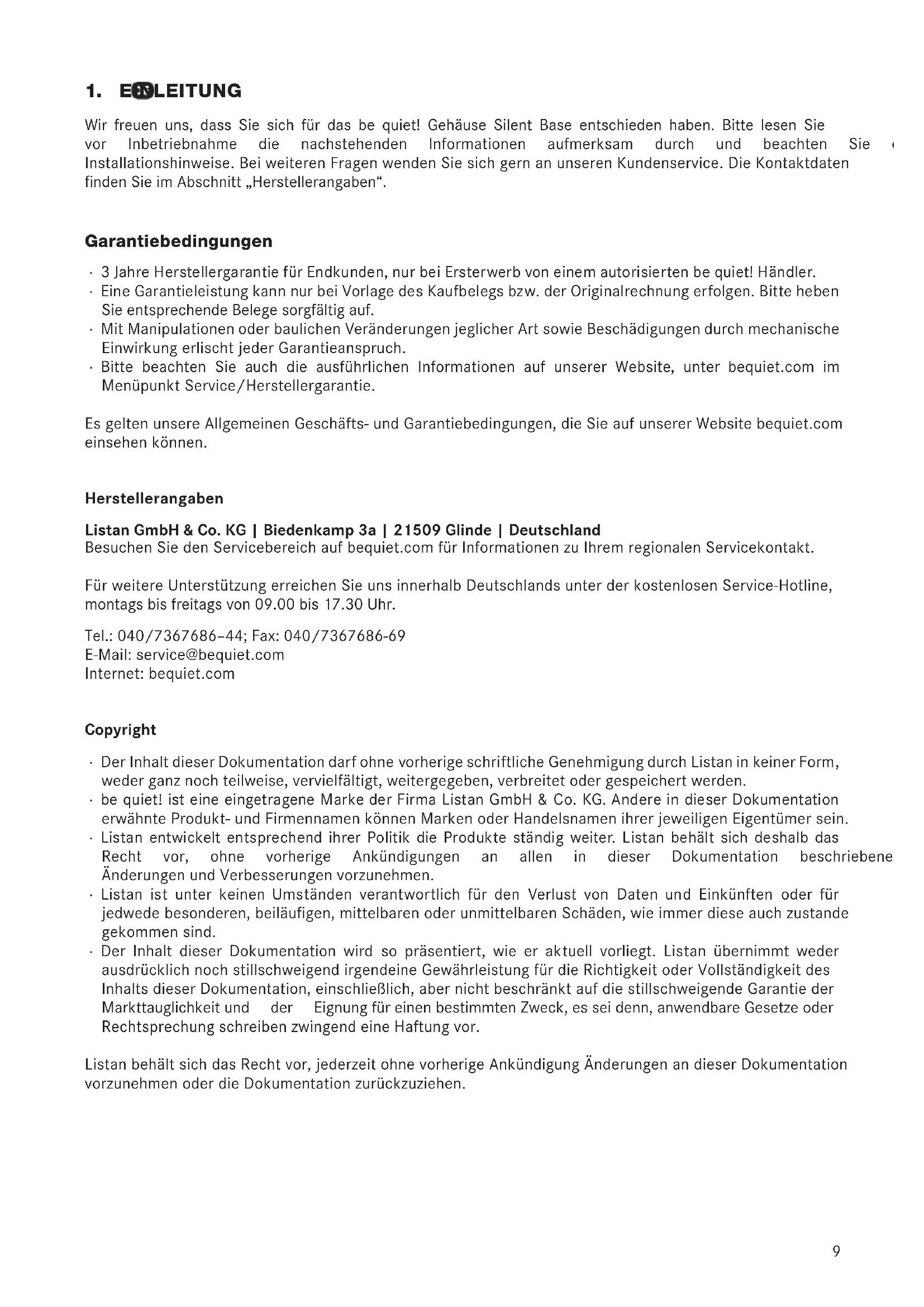 Wir freuen uns, dass Sie sich für das be quiet! Gehäuse Silent Base entschieden haben. Bitte lesen Sie vor Inbetriebnahme die nachstehenden Informationen aufmerksam durch und beachten Sie die einzelnen Installationshinweise.BeiweiterenFragenwendenSiesichgernanunserenKundenservice.DieKontaktdaten ndenSieimAbschnitt„Herstellerangaben“. Garantiebedingungen ∙ 3JahreHerstellergarantiefürEndkunden,nurbeiErsterwerbvoneinemautorisiertenbequiet!Händler. ∙ EineGarantieleistungkannnurbeiVorlagedesKaufbelegsbzw.derOriginalrechnungerfolgen.Bitteheben Sie entsprechende Belege sorgfältig auf. ∙ Mit Manipulationen oder baulichen Veränderungen jeglicher Art sowie Beschädigungen durch mechanische EinwirkungerlischtjederGarantieanspruch. ∙ Bitte beachten Sie auch die ausführlichen Informationen auf unserer Website, unter bequiet.com im MenüpunktService/Herstellergarantie. Es gelten unsere Allgemeinen Geschäfts- und Garantiebedingungen, die Sie auf unserer Website bequiet.com einsehenkönnen. Herstellerangaben Listan GmbH & Co. KG | Biedenkamp 3a | 21509 Glinde | Deutschland BesuchenSiedenServicebereichaufbequiet.comfürInformationenzuIhremregionalenServicekontakt. FürweitereUnterstützungerreichenSieunsinnerhalbDeutschlandsunterderkostenlosenService-Hotline, montags bis freitags von 09.00 bis 17.30 Uhr. Tel.: 040/7367686–44; Fax: 040/7367686-69 E-Mail: service@bequiet.com Internet: bequiet.com Copyright ∙ DerInhaltdieserDokumentationdarfohnevorherigeschriftlicheGenehmigungdurchListaninkeinerForm, weder ganz noch teilweise, vervielfältigt, weitergegeben, verbreitet oder gespeichert werden. ∙ bequiet!isteineeingetrageneMarkederFirmaListanGmbH&Co.KG.AndereindieserDokumentation erwähnteProdukt-undFirmennamenkönnenMarkenoderHandelsnamenihrerjeweiligenEigentümersein. ∙ Listanentwickelt entsprechend ihrer Politikdie Produkteständigweiter. Listan behältsich deshalbdas Recht vor, ohne vorherige Ankündigungen an allen in dieser Dokumentation beschriebenen Produkte Änderungen und Verbesserungen vorzunehmen. ∙ Listan ist unter keinen Umständen verantwortlich für den Verlust von Daten und Einkünften oder für jedwedebesonderen,beiläugen,mittelbarenoderunmittelbarenSchäden,wieimmerdieseauchzustande gekommensind. ∙ Der Inhalt dieser Dokumentation wird so präsentiert, wie er aktuell vorliegt. Listan übernimmt weder ausdrücklichnochstillschweigendirgendeineGewährleistungfürdieRichtigkeitoderVollständigkeitdes InhaltsdieserDokumentation,einschließlich,abernichtbeschränktaufdiestillschweigendeGarantieder Markttauglichkeitund der EignungfüreinenbestimmtenZweck,esseidenn,anwendbareGesetzeoder Rechtsprechung schreiben zwingend eine Haftung vor. ListanbehältsichdasRechtvor,jederzeitohnevorherigeAnkündigungÄnderungenandieserDokumentation vorzunehmenoderdieDokumentationzurückzuziehen.10 11