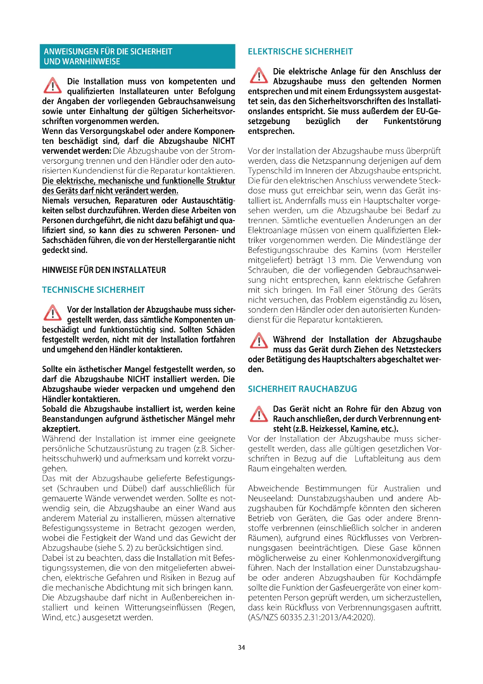 steht (z.B. Heizkessel, Kamine, etc.). Vor der Installation der Abzugshaube muss sicher- gestellt werden, dass alle gültigen gesetzlichen Vor- schriften in Bezug auf die Luftableitung aus dem Raum eingehalten werden. Abweichende Bestimmungen für Australien und Neuseeland: Dunstabzugshauben und andere Ab- zugshauben für Kochdämpfe könnten den sicheren Betrieb von Geräten, die Gas oder andere Brenn- stoffe verbrennen (einschließlich solcher in anderen Räumen), aufgrund eines Rückflusses von Verbren- nungsgasen beeinträchtigen. Diese Gase können möglicherweise zu einer Kohlenmonoxidvergiftung führen. Nach der Installation einer Dunstabzugshau- be oder anderen Abzugshauben für Kochdämpfe sollte die Funktion der Gasfeuergeräte von einer kom- petenten Person geprüft werden, um sicherzustellen, dass kein Rückfluss von Verbrennungsgasen auftritt.