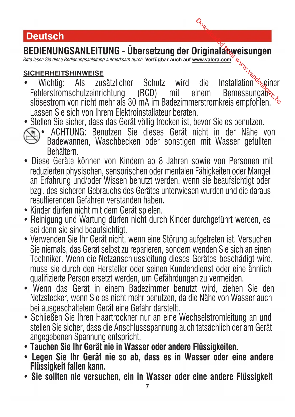 Vor der Säuberung des Gerätes stets erst den Netzstecker ziehen! Sie können das Gerät mit einem feuchten Tuch abwischen. Das Gerät sollte jedoch niemals in Wasser oder einer anderen Flüssigkeit gespült werden! Schützen Sie Ihr Gerät vor Staub. Wenn nötig, ist das Luftauslassgitter mit einer Bürste oder einem Pinsel zu säubern. ACHTUNG: Die Reinigung der Haartrockner mit Reinigern, Lösungsmitteln, Alkohol und sonstigen Chemikalien ist streng verboten. Änderungen vorbehalten Downloaded from www.vandenborre.be10 Français MODE D’EMPLOI - Traductions à partir des instructions d'origine Lire attentivement ce mode d’emploi. Disponible aussi sur www.valera.com