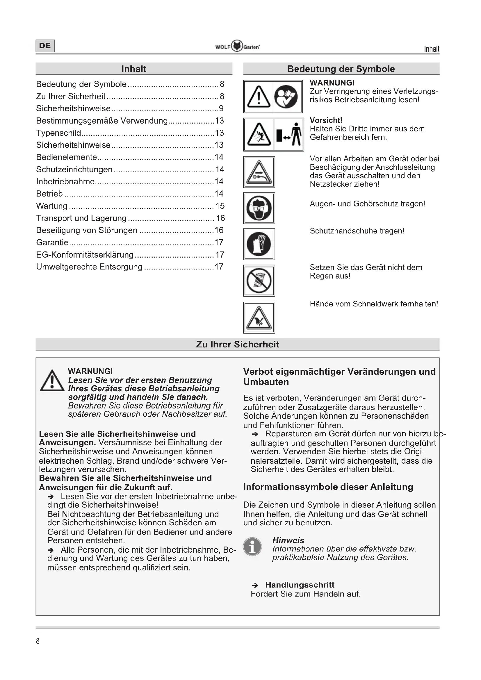 - Umweltgerechte Entsorgung Bedeutung der Symbole WARNUNG! Zur Verringerung eines Verletzungs- risikos Betriebsanleitung lesen! Vorsicht! Halten Sie Dritte immer aus dem Gefahrenbereich fern. Vor allen Arbeiten am Gerät oder bei Beschädigung der Anschlussleitung das Gerät ausschalten und den Netzstecker ziehen! Augen- und Gehörschutz tragen! Schutzhandschuhe tragen! Setzen Sie das Gerät nicht dem Regen aus! Hände vom Schneidwerk fernhalten! Zu Ihrer Sicherheit WARNUNG! Lesen Sie vor der ersten Benutzung Ihres Gerätes diese Betriebsanleitung sorgfältig und handeln Sie danach. Bewahren Sie diese Betriebsanleitung für späteren Gebrauch oder Nachbesitzer auf. Lesen Sie alle Sicherheitshinweise und Anweisungen. Versäumnisse bei Einhaltung der Sicherheitshinweise und Anweisungen können elektrischen Schlag, Brand und/oder schwere Ver- letzungen verursachen. Bewahren Sie alle Sicherheitshinweise und Anweisungen für die Zukunft auf. Î Lesen Sie vor der ersten Inbetriebnahme unbe- dingt die Sicherheitshinweise! Bei Nichtbeachtung der Betriebsanleitung und der Sicherheitshinweise können Schäden am Gerät und Gefahren für den Bediener und andere Personen entstehen. Î Alle Personen, die mit der Inbetriebnahme, Be- dienung und Wartung des Gerätes zu tun haben, müssen entsprechend qualiziert sein. Verbot eigenmächtiger Veränderungen und Umbauten Es ist verboten, Veränderungen am Gerät durch- zuführen oder Zusatzgeräte daraus herzustellen. Solche Änderungen können zu Personenschäden und Fehlfunktionen führen. Î Reparaturen am Gerät dürfen nur von hierzu be- auftragten und geschulten Personen durchgeführt werden. Verwenden Sie hierbei stets die Origi- nalersatzteile. Damit wird sichergestellt, dass die Sicherheit des Gerätes erhalten bleibt. Informationssymbole dieser Anleitung Die Zeichen und Symbole in dieser Anleitung sollen Ihnen helfen, die Anleitung und das Gerät schnell und sicher zu benutzen. Hinweis Informationen über die eektivste bzw. praktikabelste Nutzung des Gerätes. Î Handlungsschritt Fordert Sie zum Handeln auf.Zu Ihrer Sicherheit p. 17