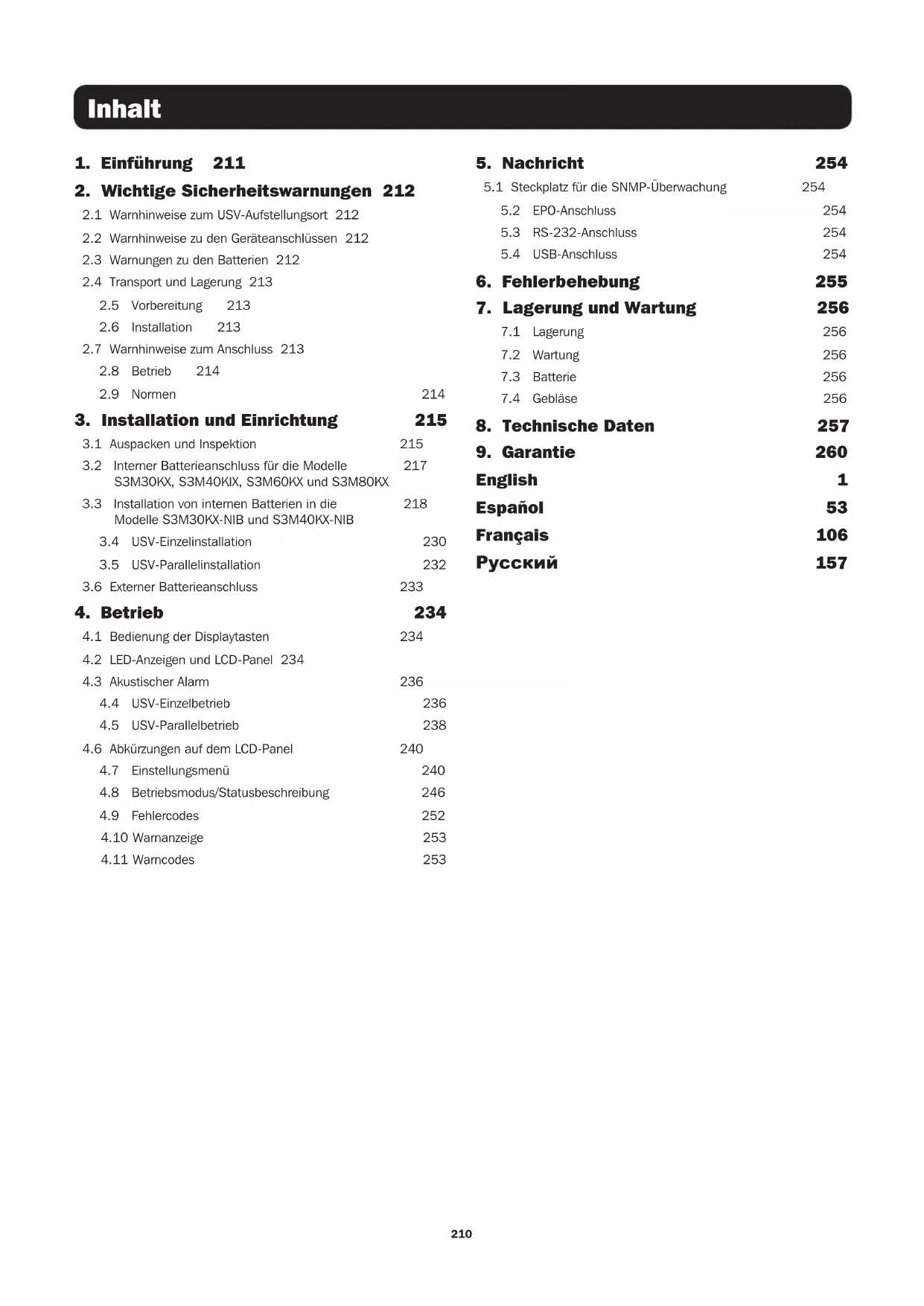 - Die Batterie darf nur von einem autorisierten Servicemitarbeiter gegen eine Batterie mit demselben Anschlusswert und Typ (versiegelter Bleiakku) ausgewechselt werden. WARNHINWEIS: Um lebensgefährliche Bedingungen bei der USV-Installation und -Wartung zu vermeiden, dürfen diese Aufgaben nur von qualifizierten und erfahrenen Elektrikern durchgeführt werden. Bitte lesen Sie dieses Bedienungshandbuch und die Sicherheitsanweisungen aufmerksam, bevor Sie die Einheit installieren oder verwenden.213