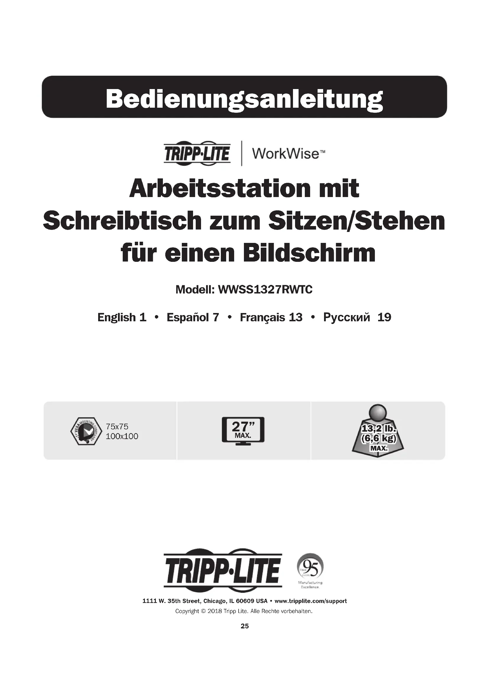 - В случае возникновения каких-либо вопросов приглашаем вас посетить страницу www.tripplite.com/support.25 Bedienungsanleitung Arbeitsstation mit Schreibtisch zum Sitzen/Stehen für einen Bildschirm Modell: WWSS1327RWTC English 1 • Español 7 • Français 13 • Русский 19 1111 W. 35th Street, Chicago, IL 60609 USA • www.tripplite.com/supportCopyright © 2018 Tripp Lite. Alle Rechte vorbehalten. 75x75 100x100 27” MAX. 13,2 lb. (6,6 kg) MAX.26 Wichtige Sicherheitshinweise Garantie HINWEIS: Lesen Sie das gesamte Handbuch, bevor Sie mit der Installation und Montage beginnen. ACHTUNG