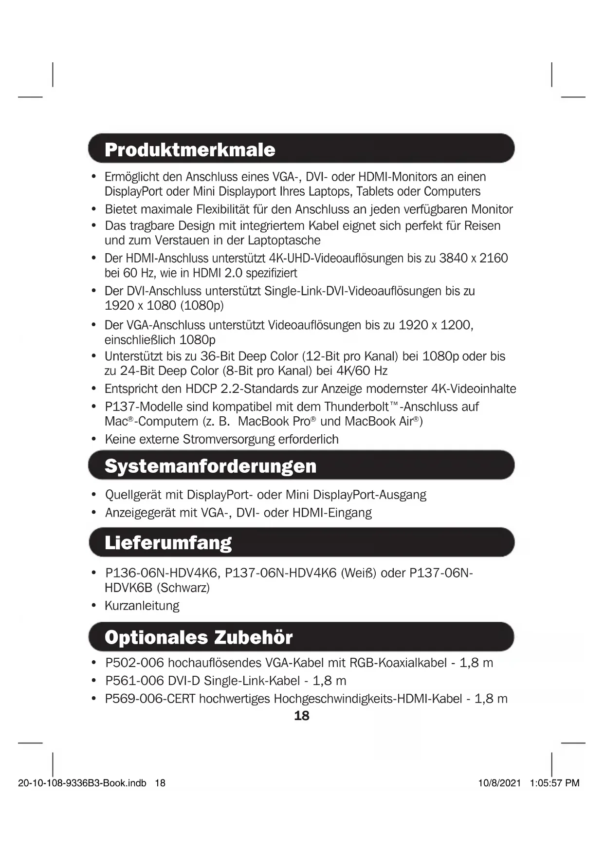 - P569-006-CERT hochwertiges Hochgeschwindigkeits-HDMI-Kabel - 1,8 m 20-10-108-9336B3-Book.indb 1820-10-108-9336B3-Book.indb 18 10/8/2021 1:05:57 PM10/8/2021 1:05:57 PM19 Technische Daten Eingangssignal Displayport 1.2 oder Mini Displayport 1.2 Ausgangssignal VGA, DVI und HDMI Vertikaler Frequenzbereich 50/60 Hz Maximale HDMI-Auflösung 3840 x 2160 bei 60 Hz (4K x 2K) Maximale DVI-Auflösung 1920 x 1080 (1080p) Maximale VGA-Auflösung 1920 x 1200, einschließlich 1080p Maximale Kabellänge 1,8 m für DVI und HDMI 3 m für VGA Betriebstemperatur 0 bis 45 °C Luftfeuchtigkeit bei Betrieb 10 % bis 85 % rF, nicht kondensierend Lagertemperatur -10 bis 70 °C Feuchtebereich für die Lagerung 5 % bis 90 % rF, nicht kondensierend Maximaler Stromverbrauch 400mA Installation Hinweise: