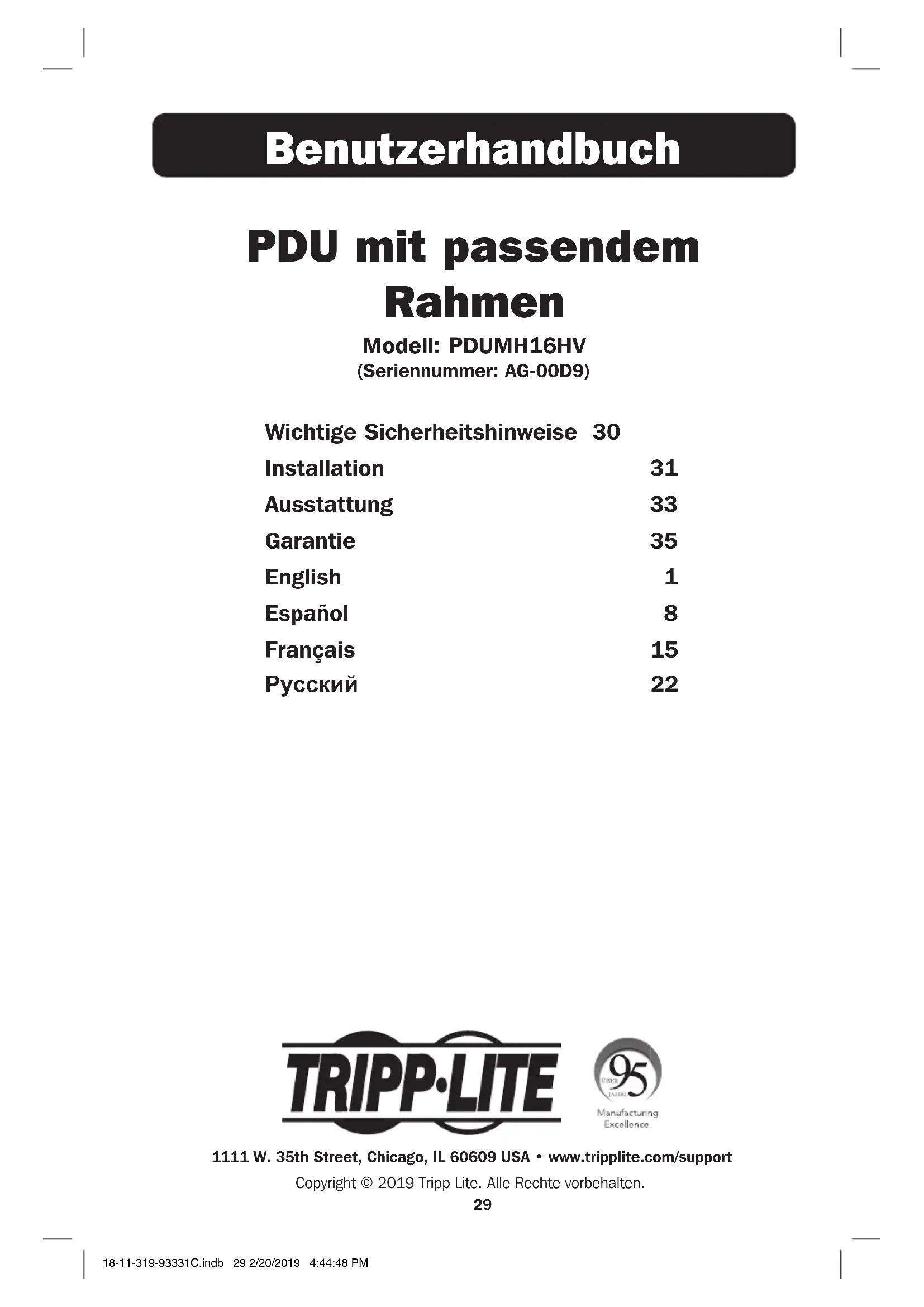 - Rücksendung der neuen Geräte zum Recycling, wenn ihr Lebenszyklus abgelaufen ist Tripp Lite verfolgt den Grundsatz, sich kontinuierlich zu verbessern. Produktspezifikationen können ohne Ankündigung geändert werden. 18-11-319-93331C.indb 35 2/20/2019 4:44:50 PM36 1111 W. 35th Street, Chicago, IL 60609 USA • www.tripplite.com/support 18-11-319 93-331C_revB 18-11-319-93331C.indb 36 2/20/2019 4:44:50 PM