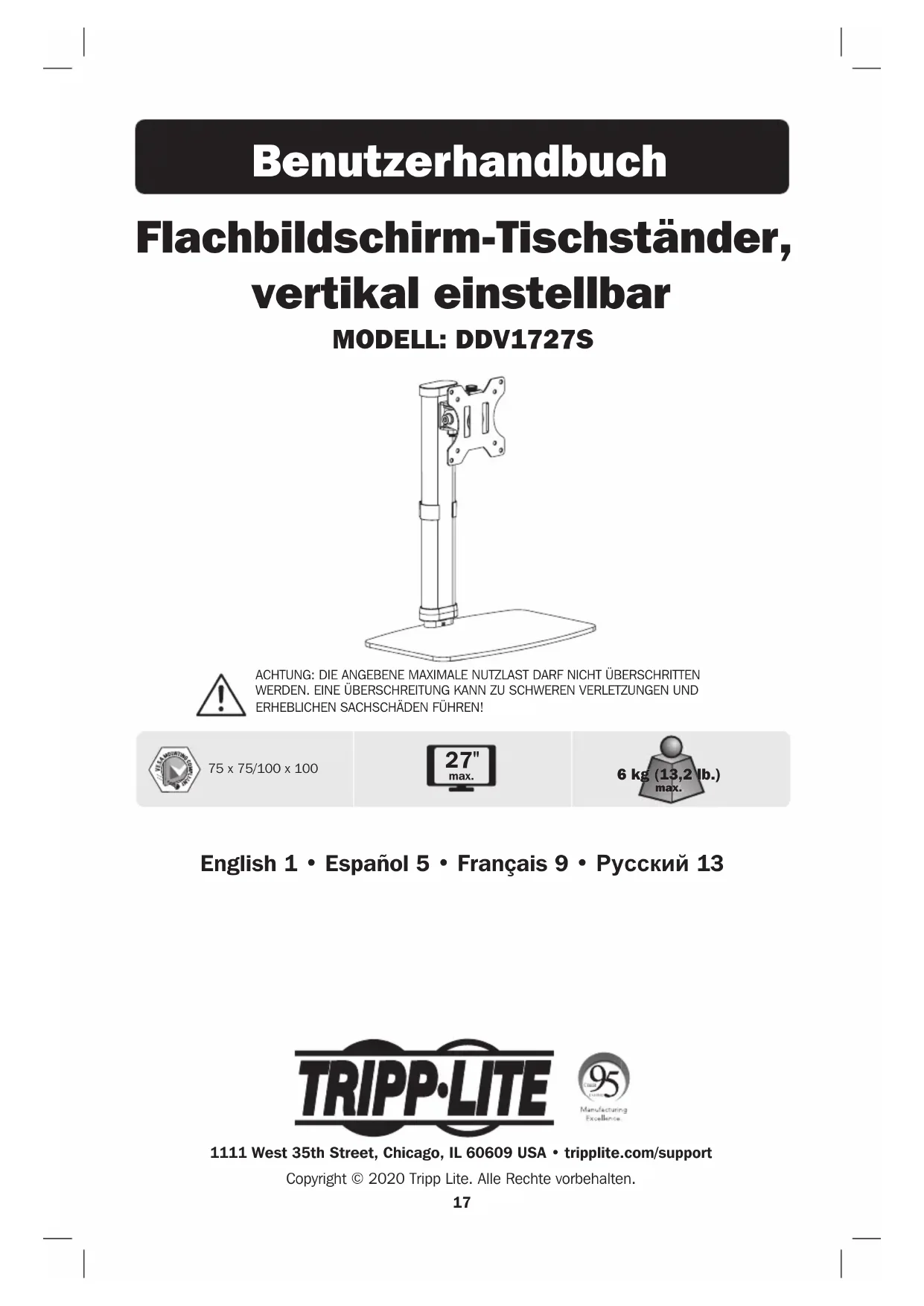 ACHTUNG: DIE ANGEBENE MAXIMALE NUTZLAST DARF NICHT ÜBERSCHRITTEN WERDEN. EINE ÜBERSCHREITUNG KANN ZU SCHWEREN VERLETZUNGEN UND ERHEBLICHEN SACHSCHÄDEN FÜHREN! 75 x 75/100 x 100 27″ max. 6 kg (13,2 lb.) 6 kg (13,2 lb.) max. max. Benutzerhandbuch 1111 West 35th Street, Chicago, IL 60609 USA • tripplite.com/support Copyright © 2020 Tripp Lite. Alle Rechte vorbehalten. English 1 • Español 5 • Français 9 • Русский 1318 HINWEIS: Lesen Sie das gesamte Handbuch, bevor Sie mit der Installation und Montage beginnen. Garantie WARNUNG