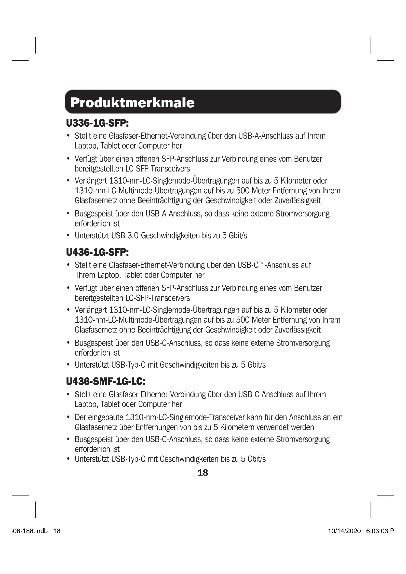 - Unterstützt USB 3.0-Geschwindigkeiten bis zu 5 Gbit/s U436-1G-SFP: