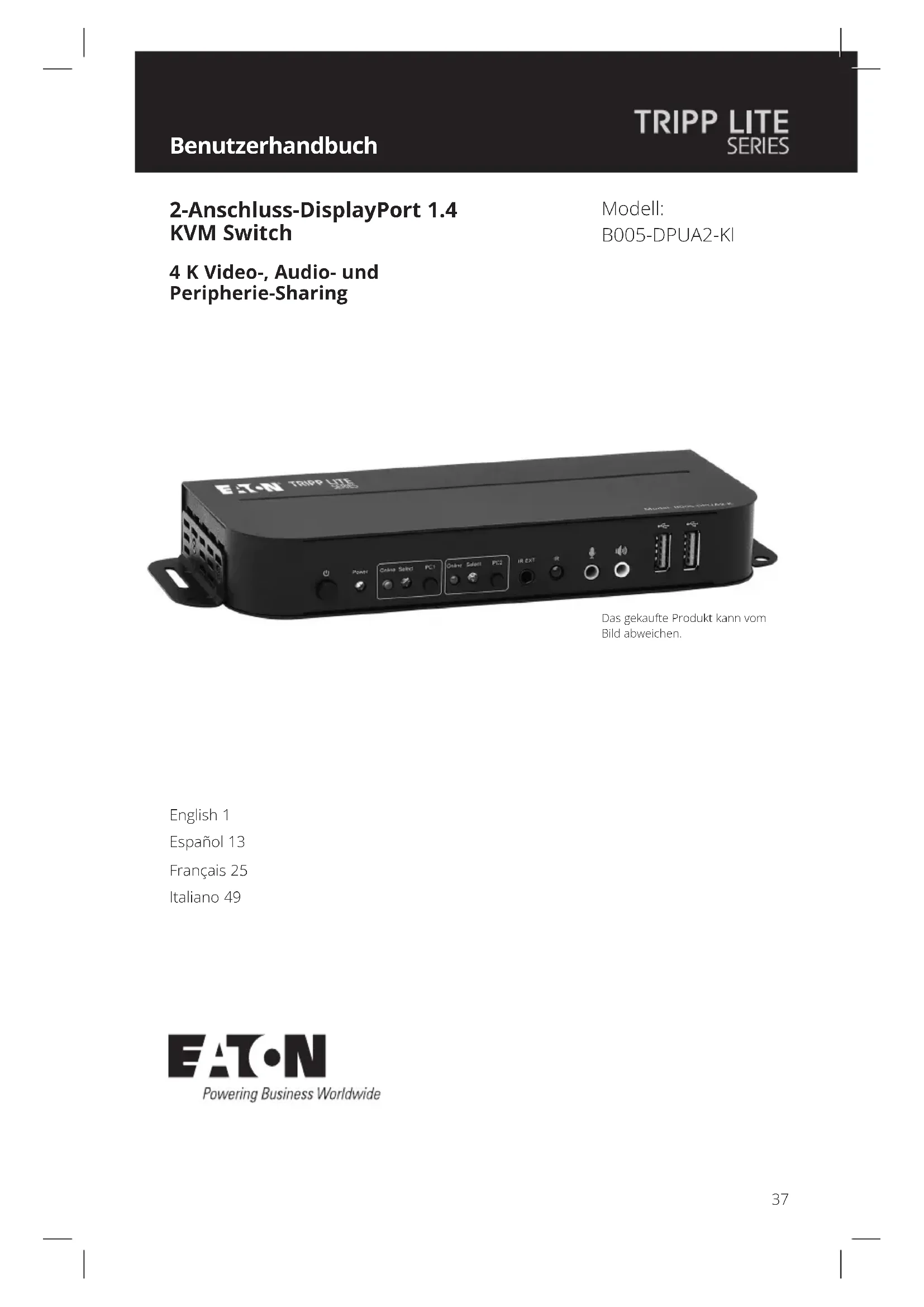 Dieser Modus bezieht sich nur auf die Hotkey-Funktionen Nr. 4 und Nr. 6.46 Technische Daten Anschlüsse KVM-Anschlüsse (Buchse) USB 3.2 Gen 1-B x2 (Rückseite) DisplayPort x2 (Rückseite) 3,5 mm Stereo x2 (Grün, Rückseite) 3,5 mm Stereo x2 (Rosa, Rückseite) Konsolenanschlüsse (Buchse) USB 2.0-A x2 (Rückseite) DisplayPort x1 (Rückseite) HDMI x1 (Rückseite) 3,5 mm Stereo x2 (Grün, 1 Vorderseite, 1 Rückseite) 3,5 mm Stereo x2 (Rosa, 1 Vorderseite, 1 Rückseite) USB Hub-Anschlüsse (Buchse) USB 3.2 Gen 1-A x2 (Vorderseite) Videoauösung MaximaleAuösung 4 K x 2 K bei 60 Hz (4K-UHD) Betriebsbandbreite HDMI-Bandbreite 18 GBit DisplayPort-Bandbreite 32,4 GBit Umgebungsinformationen Betriebstemperaturbereich 32 °F ~ 113 °F (0 °C ~ 45 °C) Luftfeuchtigkeit bei Betrieb 10 % ~ 85 % rF (Keine Kondensation) Lagertemperaturbereich 14 °F ~ 176 °F (–10 °C ~ +80 °C) Feuchtebereich für die Lagerung 5 % ~ 90 % rF (Keine Kondensation) Strombedarf Externe Stromversorgung DC 5 V/3 A Stromverbrauch (max.) 12 W ESD-Schutz Human Body Model +/- 8 kV (Luftspaltentladung) +/- 4 kV (Kontaktentladung)47 Garantie 3Jahre eingeschränkte Garantie Wir garantieren, dass unsere Produkte frei von Material- und Verarbeitungsfehlern sind, und zwarfüreinenZeitraumvondrei(3)JahrenabdemDatumdesErstkaufs.UnsereVerpichtung im Rahmen dieser Garantie beschränkt sich auf die Reparatur oder den Ersatz (nach eigenem Ermessen) der fehlerhaften Produkte. Besuchen Sie Tripplite.Eaton.com/support/product- returns bevor Sie Geräte zur Reparatur zurücksenden. Diese Garantie gilt nicht für Geräte, die durch Unfall, Fahrlässigkeit oder falsche Anwendung beschädigt wurden oder in irgendeiner Weisegeändertodermodiziertwurden. MIT AUSNAHME DER HIERIN ENTHALTENEN BESTIMMUNGEN GEBEN WIR KEINE GARANTIEN, WEDER AUSDRÜCKLICH NOCH STILLSCHWEIGEND, EINSCHLIESSLICH GARANTIEN DER MARKTGÄNGIGKEIT UND EIGNUNG FÜR EINEN BESTIMMTEN ZWECK. Einige Staaten gestatten keine Beschränkung oder keinen Ausschluss stillschweigender Gewährleistungen; daher kann es sein, dass die oben genannten Beschränkungen oder Ausschlüsse auf den Käufer nicht zutreen. MITAUSNAHMEDEROBIGENBESTIMMUNGENSINDWIRUNTERKEINENUMSTÄNDEN HAFTBAR FÜR DIREKTE, INDIREKTE, SPEZIELLE, ZUFÄLLIGE ODER FOLGESCHÄDEN, DIE SICH AUS DER VERWENDUNG DIESES PRODUKTES ERGEBEN, SELBST WENN AUF DIE MÖGLICHKEIT SOLCHER SCHÄDEN HINGEWIESEN WURDE. Insbesondere haften wir nicht für Kosten, wie entgangene Gewinne oder Einnahmen, Verlust von Geräten, Verlust der Nutzung von Geräten, Verlust von Software, Datenverlust, Kosten für Ersatzprodukte, Ansprüche Dritter oder anderes. EatonverfolgteinePolitikderkontinuierlichenVerbesserung.Spezikationenkönnenohne Ankündigung geändert werden.48 Eaton 1000 Eaton Boulevard Cleveland, OH 44122 United States Eaton.com © 2023 Eaton Alle Rechte vorbehalten. Veröffentlichung Nr. 23-08-243 / 93-3C24_RevB Dezember 2023 Eaton ist eine eingetragene Marke. Alle Marken sind Eigentum der jeweiligen Inhaber.49 Manuale d'uso Modello: