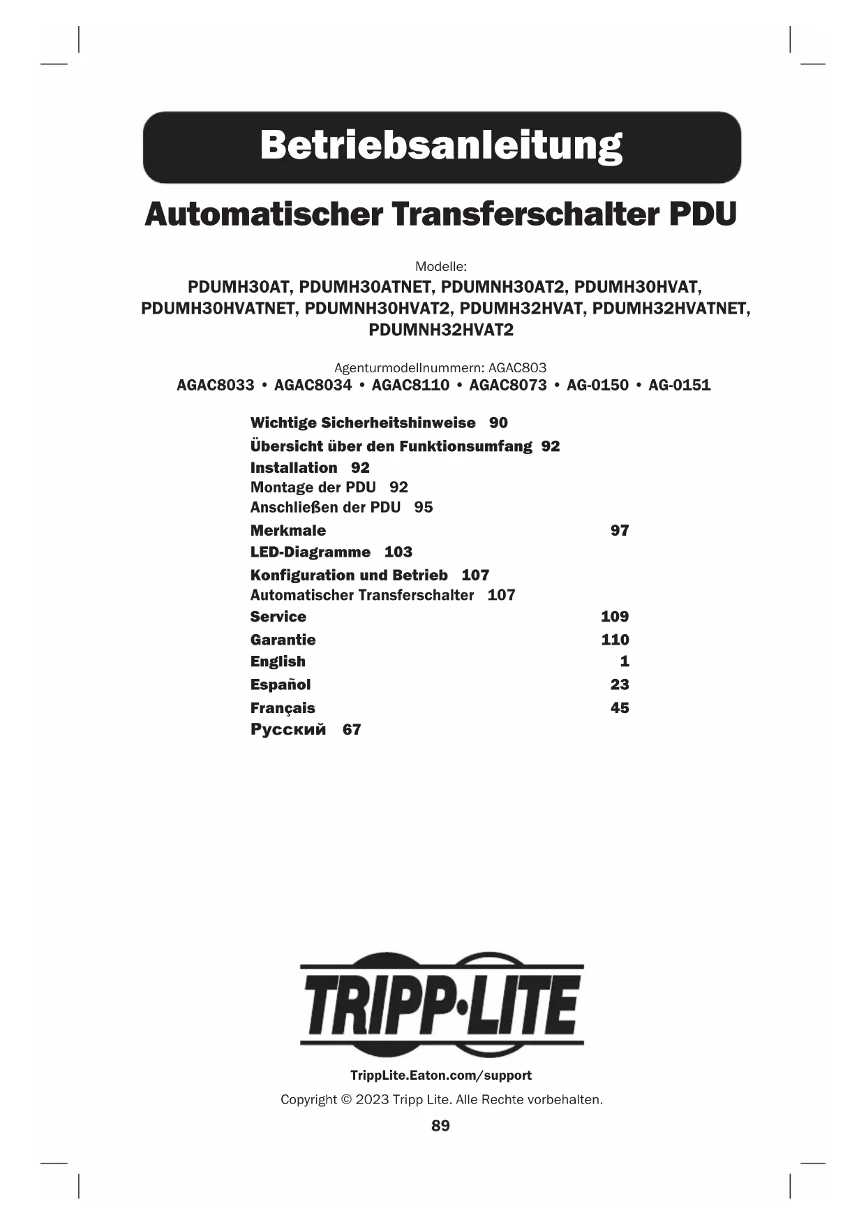LED-Diagramme 103 Konfiguration und Betrieb 107 Automatischer Transferschalter 107 Service 109 Garantie 110 English 1 Español 23 Français 45 Русский 67 TrippLite.Eaton.com/support Copyright © 2023 Tripp Lite. Alle Rechte vorbehalten.90 Wichtige Sicherheitshinweise Dieses Handbuch enthält Informationen zur ordnungsgemäßen Installation und Verwendung der Rackmount-Steckdosenleisten von Tripp Lite. BITTE BEWAHREN SIE DIESE ANLEITUNG AUF. Schließen Sie Ihre Steckdosenleiste nicht an eine ungeerdete Steckdose an. Verwenden Sie sie nicht mit Verlängerungskabeln oder Adaptern, die die Verbindung zur Erdung aufheben. Ihre Steckdosenleiste ist ausschließlich für den Gebrauch in Innenräumen bestimmt. Installieren Sie sie entfernt von wärmeabgebenden Geräten wie Heizkörpern und Heizregistern. Bringen Sie sie nicht an Stellen an, an denen übermäßige Feuchtigkeit oder andere leitfähige Verunreinigungen vorhanden sind. Installieren Sie Elektrokabel niemals während eines Gewitters. Der Strombedarf jedes Geräts, das an eine Steckdose Ihrer Steckdosenleiste angeschlossen ist, darf die Ausgangsnennleistung Ihrer Steckdosenleiste nicht überschreiten (siehe Spezifikationen). Der Gesamtstrombedarf aller an Ihre Steckdosenleiste angeschlossenen Geräte darf die maximale Belastbarkeit Ihrer Steckdosenleiste nicht überschreiten (siehe Spezifikationen). VORSICHT Nur Personen, die für die Verwendung dieses Geräts entsprechend geschult oder qualifiziert sind, sollten dies tun. Personen, die nicht geschult oder qualifiziert sind, sollten dieses Gerät nicht verwenden, es sei denn, es steht unter der Aufsicht einer Person, die dafür ordnungsgemäß geschult oder qualifiziert ist. Kinder sind zu beaufsichtigen, um sicherzustellen, dass sie das Gerät nicht als Spielzeug verwenden. Benutzen Sie das Gerät niemals, wenn Kabel und Stecker beschädigt sind; Wenn es nicht richtig funktioniert, heruntergefallen oder beschädigt ist, bringen Sie es zur Inspektion und Reparatur zu einem autorisierten Servicecenter. Wenn das Netzkabel beschädigt ist, muss es vom Hersteller, seinem autorisierten Servicepartner oder von qualifiziertem Personal ersetzt werden, um Gefahren zu vermeiden.