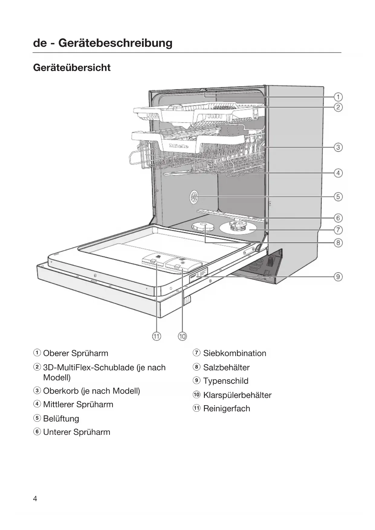 Höhe Einbaugerät 805mm (verstellbar + 65mm 845mm (verstellbar + 65mm Höhe der Einbaunische ab 805mm (verstellbar + 65mm ab 845mm (verstellbar + 65mm Breite 598mm 598mm Breite der Einbaunische 600mm 600mm Tiefe Standgerät 600mm - Tiefe Einbaugerät 570mm 570mm Gewicht max. 60kg max. 52kg Spannung Anschlusswert Absicherung siehe Typenschild siehe Typenschild Leistungsaufnahme im Aus-Zu- stand 0,4W 0,4W Leistungsaufnahme im unausge- schalteten Zustand 5,0W 5,0W Network Standby 0,9W 0,9W Frequenzband 2,4000 - 2,4835GHz 2,4000 - 2,4835GHz Maximale Sendeleistung < 100mW < 100mW Wasseranschlussdruck 50 - 1.000kPa 50 - 1.000kPa Kalt- oder Warmwasseran- schluss bis max. 60°C bis max. 60°C Rohwasserhärte max. 36°dH max. 36°dH Abpumphöhe max. 1,0m max. 1,0m Abpumplänge max. 4,0m max. 4,0m Umgebungstemperatur 5°C bis 40°C 5°C bis 40°C Relative Luftfeuchte maximal linear abnehmend bis 80% für Temperaturen bis 31°C 50% für Temperaturen bis 40°C Netzanschlusskabel ca. 1,7m ca. 1,7m Fassungsvermögen 13/14 Maßgedecke 14 Maßgedecke Geräuschemissionswerte Schallleistungspegel LwA Schalldruckpegel LpA 46dB (A) 34,1dB (A) 45dB (A) 32,5dB (A) Erteilte Prüfzeichen VDE, EMC Funkschutz CE-Kennzeichnung 2006/42/EG Maschinenrichtlinie Herstelleradresse Miele & Cie. KG, Carl-Miele-Straße 29, 33332 Gütersloh, Germanyen - Contents
