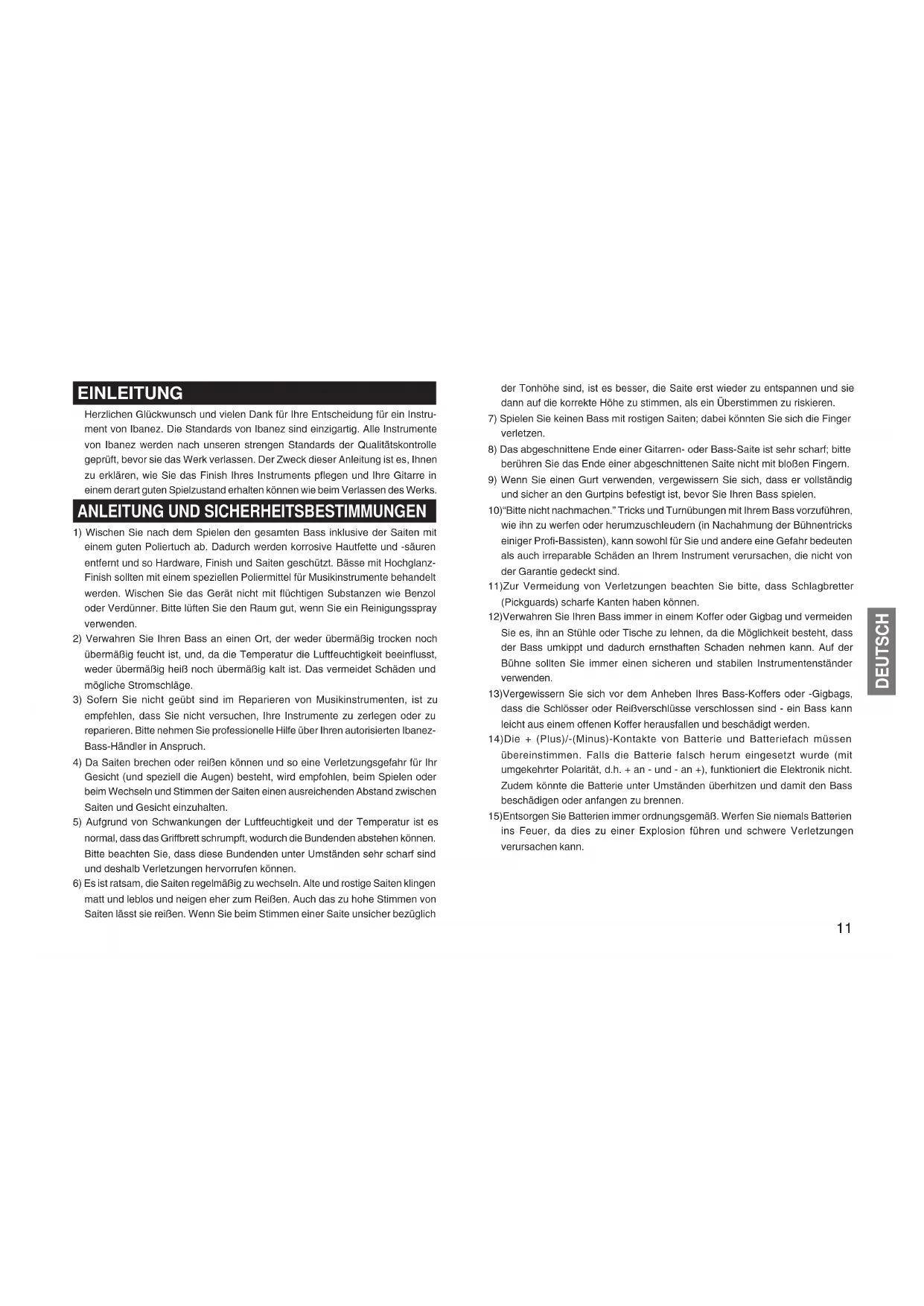 empfehlen, dass Sie nicht versuchen, Ihre Instrumente zu zerlegen oder zu reparieren. Bitte nehmen Sie professionelle Hilfe über Ihren autorisierten Ibanez- Bass-Händler in Anspruch.
