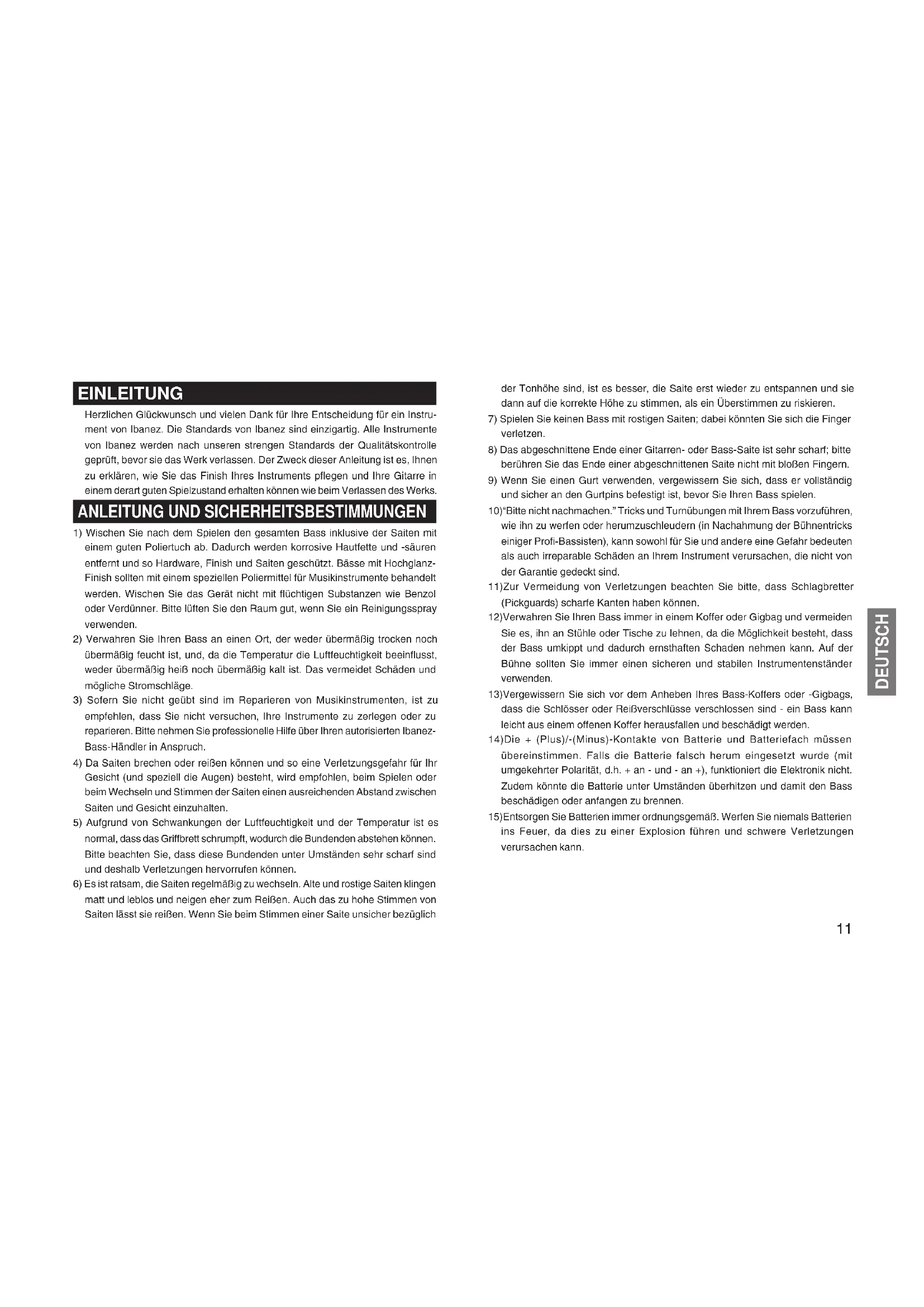 empfehlen, dass Sie nicht versuchen, Ihre Instrumente zu zerlegen oder zu reparieren. Bitte nehmen Sie professionelle Hilfe über Ihren autorisierten Ibanez- Bass-Händler in Anspruch.