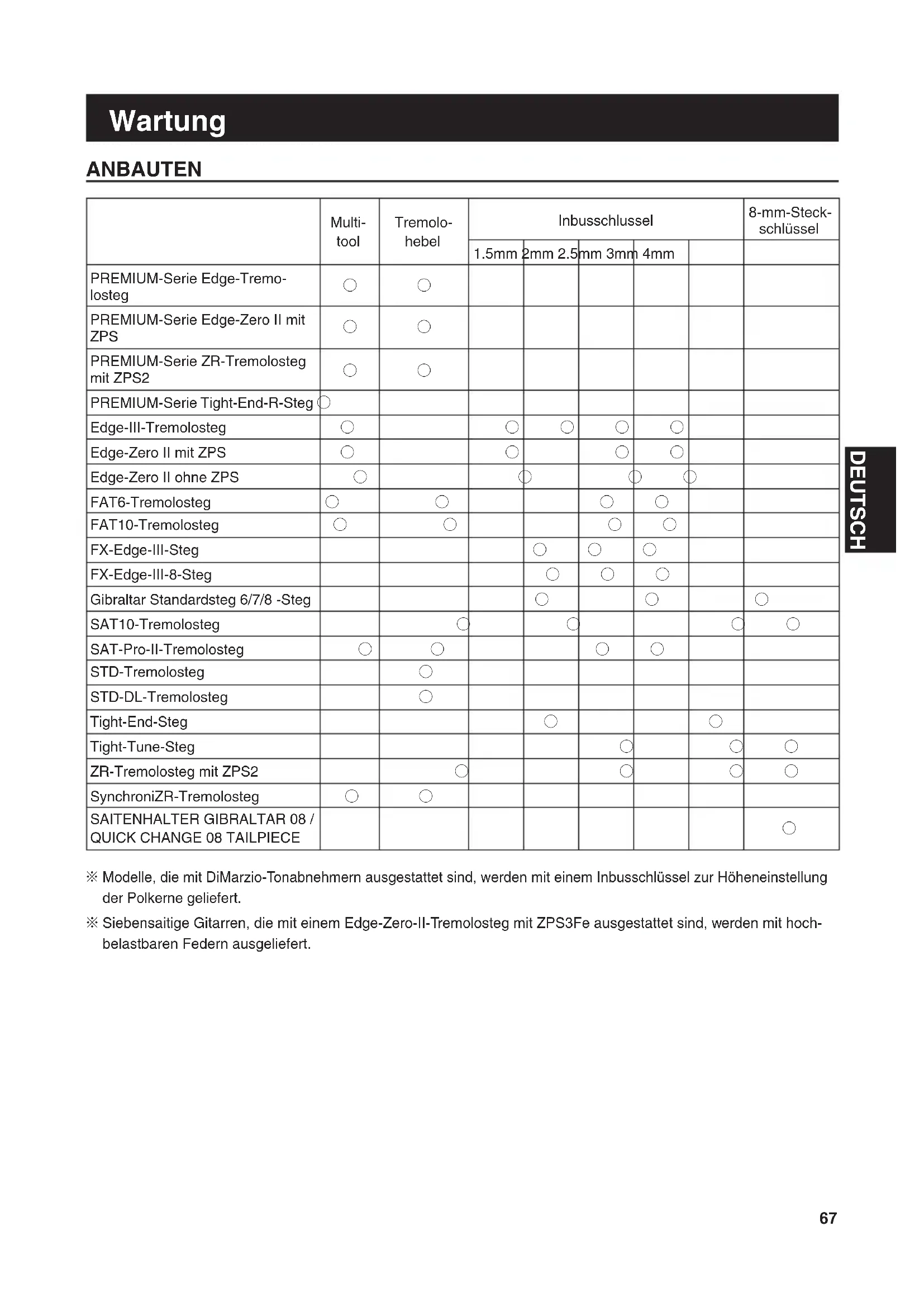 Modelle, die mit DiMarzio-Tonabnehmern ausgestattet sind, werden mit einem Inbusschlüssel zur Höheneinstellung ※ der Polkerne geliefert. Siebensaitige Gitarren, die mit einem Edge-Zero-II-Tremolosteg mit ZPS3Fe ausgestattet sind, werden mit hoch- ※ belastbaren Federn ausgeliefert.