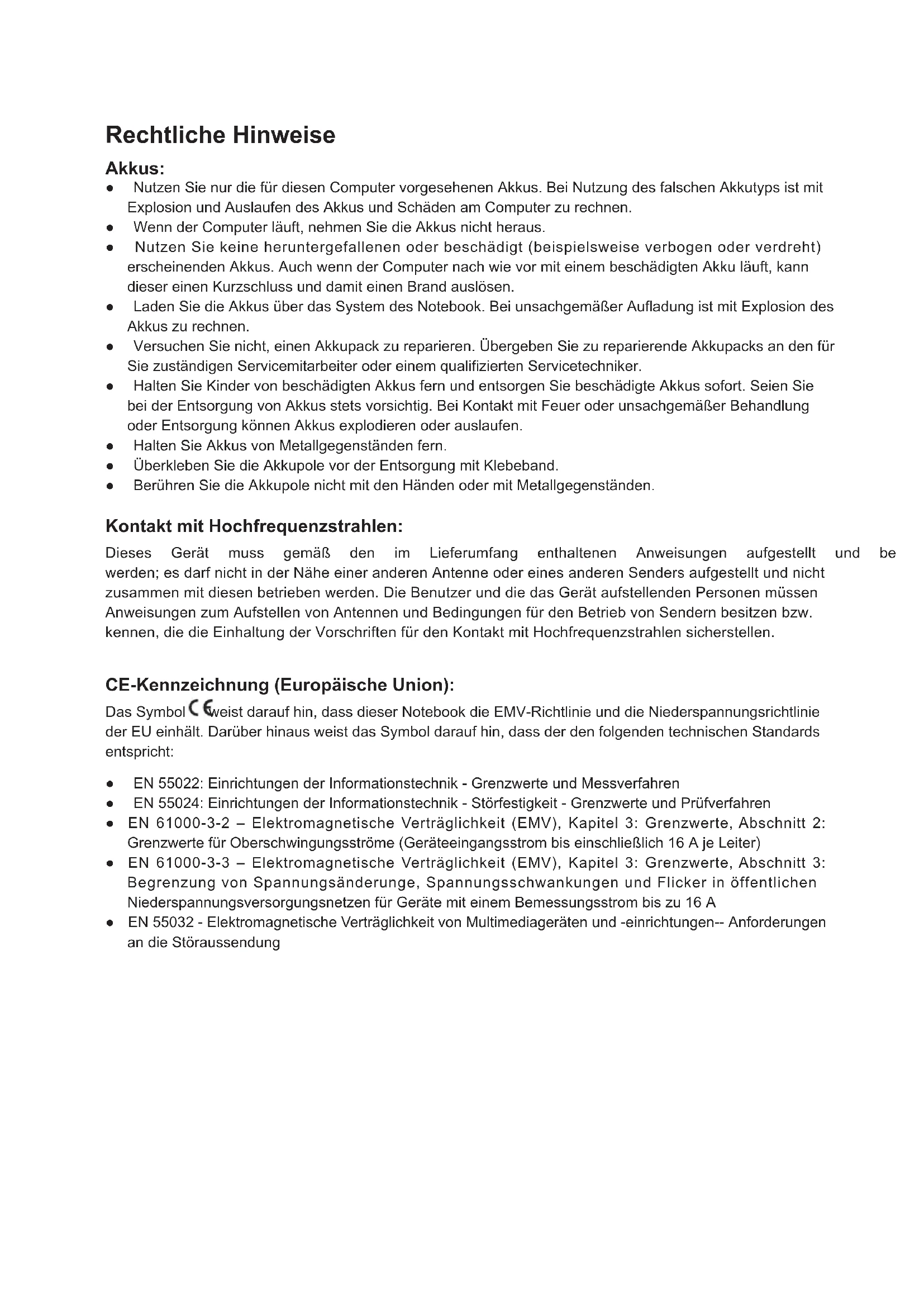 - If you happen to leave your battery pack to go through an extended period of self-discharge, say more than three months, the battery voltage level will become too low and needs to be Pre-Charged (to bring the battery voltage level high enough) before it automatically resumes its normal Fast Charge. Pre-Charge may take 30 minutes. Fast Charge usually takes 2~3 hours.Low Battery State : Whenthebatterylevelislow,anotificationmessageappears.Ifyoudonotrespondtothelowbattery message,thebatterycontinuestodischargeuntilitistoolowtooperate.Whenthishappens,yourNotebook goesintoSuspendmode.ThereisnoguaranteeyourdatawillbesavedoncetheNotebookreachesthispoint. CAUTION:ToprotectyourNotebookfromdamage,useonlythepoweradapterthatcamewithit becauseeachpoweradapterhasitsownpoweroutputrating. OnceyourNotebookgoesintosuspendmodeasaresultofadeadbattery,youwillbeunabletoresume operationuntilyouprovideasourceofpowereitherfromanadapterorachargedbattery.Onceyouhave providedpower,youcanpresstheSuspend/Resumebuttontoresumeoperation.InSuspendmode,your dataismaintainedforsometime,butifapowersourceisnotprovidedpromptly,thepowerindicatorstops flashingandthengoesout,inwhichcaseyouhavelostthedatathatwasnotsaved.Onceyouprovide power,youcancontinuetouseyourcomputerwhileanadapterchargesthebattery. Storage : ● Chargeordischargethebatterytoapproximately50%ofcapacitybeforestorage. ● Chargethebatterytoapproximately50%ofcapacityatleastonceeverythreemonths. ● RemovethebatteryandstoreitseparatelyfromtheNotebook. ● Storethebatteryattemperaturesbetween5°Cand20°C(41°Fand68°F). CAUTION:Thebatteryself-dischargesduringstorage.Highertemperatures(above20°Cor 68°F)reducethebatterystoragelife. Handling Precautions : ● Donotdisassemble,crush,orpunctureabattery. ● Donotshorttheexternalcontactsonabattery. ● Donotdisposeofabatteryinreorwater. ● Donotexposeabatterytotemperaturesabove60°C(140°F). ● Keepthebatteryawayfromchildren. ● Avoidexposingthebatterytoexcessiveshockorvibration. ● Donotuseadamagedbattery. ● Ifabatterypackhasleakinguids,donottouchanyuids.Disposeofaleakingbatterypack(see DisposalandRecyclingsection).Incaseofeyecontactwithuid,donotrubeyes.Immediatelyusheyes thoroughlywithwaterforatleast15minutes,liftingupperandlowerlids,untilnoevidenceoftheuid remains.Seekmedicalattention. Transportation : Alwayscheckallapplicablelocal,national,andinternationalregulationsbeforetransportingaRechargeable Li-Polymerbattery.Transportinganend-of-life,damaged,orrecalledbatterymay,incertaincases,be specicallylimitedorprohibited. Disposal and Recycling : RechargeableLi-Polymerbatteriesaresubjecttodisposalandrecyclingregulationsthatvarybycountryand region.Alwayscheckandfollowyourapplicableregulationsbeforedisposingofanybattery.Contactyour localbatteryrecyclingorganization.Manycountriesprohibitthedisposalofwasteelectronicequipmentin standardwastereceptacles.Placeonlydischargedbatteriesinabatterycollectioncontainer.Useelectrical tapeorotherapprovedcoveringoverthebatteryconnectionpointstopreventshortcircuits. Thesymbolofthecrossedoutwheeledbinindicatesthattheproduct(electricalandelectronicequipment) shouldnotbeplacedinmunicipalwaste.Pleasechecklocalregulationsfordisposalofelectronicproducts.Rechtliche Hinweise Akkus: ● NutzenSienurdiefürdiesenComputervorgesehenenAkkus.BeiNutzungdesfalschenAkkutypsistmit ExplosionundAuslaufendesAkkusundSchädenamComputerzurechnen. ● WennderComputerläuft,nehmenSiedieAkkusnichtheraus. ● NutzenSiekeineheruntergefallenenoderbeschädigt(beispielsweiseverbogenoderverdreht) erscheinendenAkkus.AuchwennderComputernachwievormiteinembeschädigtenAkkuläuft,kann diesereinenKurzschlussunddamiteinenBrandauslösen. ● LadenSiedieAkkusüberdasSystemdesNotebook.BeiunsachgemäßerAuadungistmitExplosiondes Akkuszurechnen. ● VersuchenSienicht,einenAkkupackzureparieren.ÜbergebenSiezureparierendeAkkupacksandenfür SiezuständigenServicemitarbeiterodereinemqualiziertenServicetechniker. ● HaltenSieKindervonbeschädigtenAkkusfernundentsorgenSiebeschädigteAkkussofort.SeienSie beiderEntsorgungvonAkkusstetsvorsichtig.BeiKontaktmitFeueroderunsachgemäßerBehandlung oderEntsorgungkönnenAkkusexplodierenoderauslaufen. ● HaltenSieAkkusvonMetallgegenständenfern. ● ÜberklebenSiedieAkkupolevorderEntsorgungmitKlebeband. ● BerührenSiedieAkkupolenichtmitdenHändenodermitMetallgegenständen. Kontakt mit Hochfrequenzstrahlen: Dieses Gerät muss gemäß den im Lieferumfang enthaltenen Anweisungen aufgestellt und betrieben werden;esdarfnichtinderNäheeineranderenAntenneodereinesanderenSendersaufgestelltundnicht zusammenmitdiesenbetriebenwerden.DieBenutzerunddiedasGerätaufstellendenPersonenmüssen AnweisungenzumAufstellenvonAntennenundBedingungenfürdenBetriebvonSendernbesitzenbzw. kennen,diedieEinhaltungderVorschriftenfürdenKontaktmitHochfrequenzstrahlensicherstellen. CE-Kennzeichnung (Europäische Union): DasSymbol weistdaraufhin,dassdieserNotebookdieEMV-RichtlinieunddieNiederspannungsrichtlinie derEUeinhält.DarüberhinausweistdasSymboldaraufhin,dassderdenfolgendentechnischenStandards entspricht: ● EN55022:EinrichtungenderInformationstechnik-GrenzwerteundMessverfahren ● EN55024:EinrichtungenderInformationstechnik-Störfestigkeit-GrenzwerteundPrüfverfahren ● EN61000-3-2–ElektromagnetischeVerträglichkeit(EMV),Kapitel3:Grenzwerte,Abschnitt2: GrenzwertefürOberschwingungsströme(Geräteeingangsstrombiseinschließlich16AjeLeiter) ● EN61000-3-3–ElektromagnetischeVerträglichkeit(EMV),Kapitel3:Grenzwerte,Abschnitt3: BegrenzungvonSpannungsänderunge,SpannungsschwankungenundFlickerinöffentlichen NiederspannungsversorgungsnetzenfürGerätemiteinemBemessungsstrombiszu16A ● EN55032-ElektromagnetischeVerträglichkeitvonMultimediagerätenund-einrichtungen--Anforderungen andieStöraussendungHinweise zum Umgang mit Akkus VorderNutzungdesNotebookunterwegsmussderAkkupackaufgeladenwerden.DieAufladungdes Akkupacksbeginnt,sobaldderNotebooküberseinNetzteilmitdemStromnetzverbundenist.Vorderersten NutzungdesNot