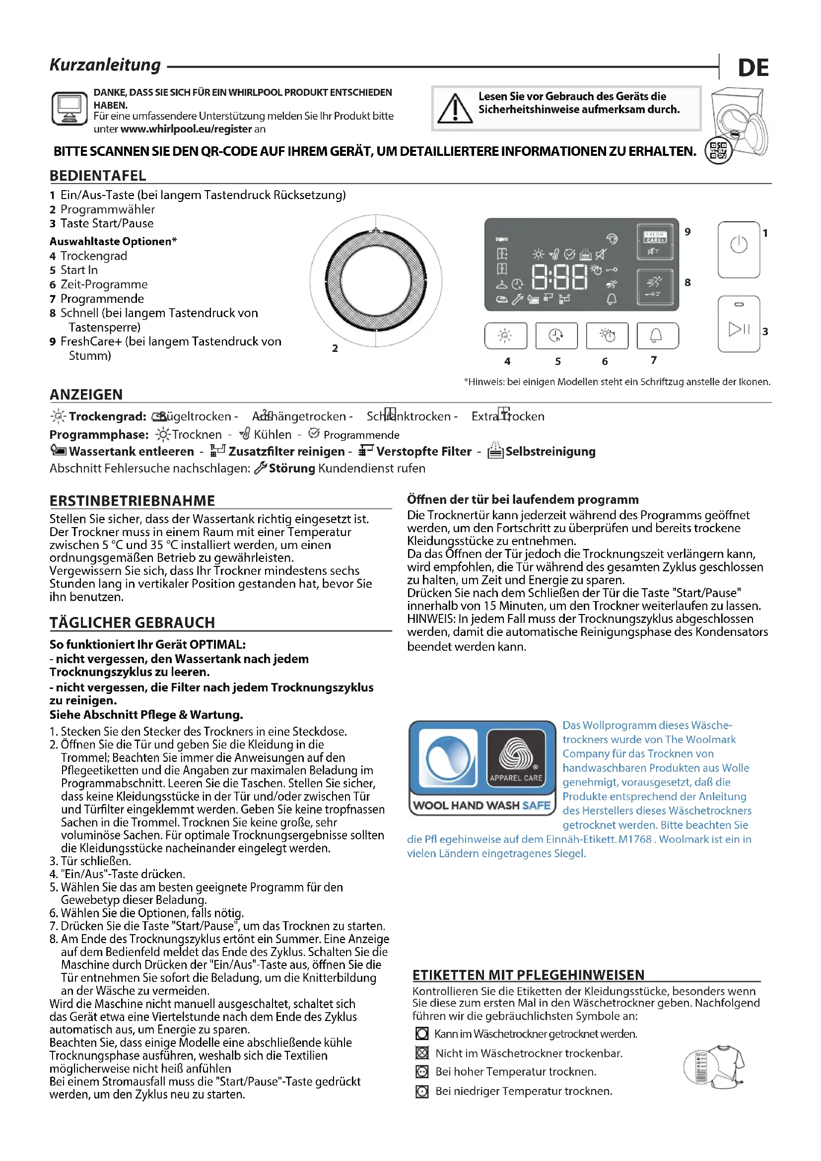 bzw. eingesetzt sind.FEHLERSUCHE DE Im Störungsfall bitte die nachstehende Tabelle prüfen, bevor Sie den Kundendienst rufen. Funktionsstörungen sind oft nur geringfügig und können in wenigen Minuten behoben werden. Störung Mögliche Ursache Abhilfe Die Trockenzeiten sind sehr lang. Es wurde keine ausreichende Wartung vorgenommen. Den Abschnitt Reí nigung und Wartung nachschlagen und die dort beschriebenen Arbeitsgänge ausführen. Die Wäsche bleibt zu nass. Nach dem Waschen in der Waschmaschine mit höherer Drehzahl schleudern, um so viel Wasser wie möglich zu beseitigen. Raumtemperatur.Die Trockenzeit kann länger ausfallen, wenn die Raumtemperatur außerhalb des Bereichs von 14–30°C liegt.Eingestelltes Programm, Dauer und/oder Trockengrad sind für die Art oder die Menge der in den Trockner eingeführten Ladung nicht geeignet. Das richtige Programm und die richtigen Optionen im Abschnitt Programme und Optionen nachschlagen.Der Trockner ist möglicherweise überlastet.Die maximale Ladung für die einzelnen Programme im Abschnitt Programme nachschlagen. Der Wäschetrockner lässt sich nicht einschalten. Die Ein/Aus Taste wurde nicht gedrückt. Drücken Sie die Ein/Aus Taste. Der Stecker wurde nicht in die Steckdose gesteckt. Den Stecker in die Steckdose stecken.Die Steckdose ist defekt.Als Gegenprobe ein anderes Haushaltsgerät an die gleiche Steckdose anschließen. Für den Anschluss am Stromnetz keine Zwischenelemente wie Adapter oder Verlängerungskabel verwenden. Die Stromversorgung ist ausgefallen.Warten Sie, bis die Stromversorgung wiederhergestellt ist und schalten Sie die Sicherung wieder ein, falls nötig. Der Wäschetrockner läuft nicht an. Die Tür hat sich nicht richtig geschlossen. Die Tür schließen. Es wurde eine spätere Startzeit des Programms eingestellt.Bei Maschinen, die mit dieser Funktion ausgestattet sind: abwarten, bis die eingestellte Verzögerungszeit abgelaufen ist oder die Maschine abschalten, um sie zurückzusetzen. Die Optionen-Auswahl kontrollieren. Die Taste Start/Pause zum Starten des Programms wurde nicht gedrückt. Die Taste Start/Pause drücken.Bei Maschinen mit Tastensperre wurde diese Option eingeschaltet.Siehe Abschnitt Optionen. Wenn Tastensperre. gewählt wurde, diese deaktivieren. Das Ausschalten der Maschine deaktiviert diese Option nicht.Kleidungsstücke sind bei Programmende feucht.Kleine Wäschemenge.Das Automatikprogramm hat die erforderliche Endfeuchtigkeit nicht erfasst. Der Trockner beendet das Programm und stoppt. In diesem Fall einfach ein weiteres kurzes Trockenprogramm starten oder die Option Extra Dry auswählen, falls verfügbar. Große Beladungen oder schwerere Sto e. Die Trockengrade können auf die spezi sche gewünschte Trockenheit geändert werden. Extra trocken wird für Stücke empfohlen, die sofort getragen werden. Der Trocknungszyklus wurde unterbrochen und nicht innerhalb von 15 Minuten wieder aktiviert, so dass sich das Gerät ausgeschaltet hat. Der Trocknungszyklus muss erneut eingestellt und neu gestartet werden.Es könnte ein Stromausfall aufgetreten sein, der das Gerät ausgeschaltet hat.Der Trocknungszyklus muss erneut eingestellt und neu gestartet werden. Leuchten oder Blinken der Anzeigen Wassertank Der Wassertank ist voll. Den Wassertank entleeren. Den Abschnitt Reí nigung und Wartung nachschlagen. Tür lter Störung des für den Betrieb der Maschine notwendigen Luftstroms. Den Tür lter kontrollieren, sodass das Gitter der Belüftungsö nung wieder frei ist. Wenn diese Vorgänge nicht ordnungsgemäß ausgeführt werden, könnte der Wäschetrockner Schaden nehmen. Den Abschnitt Reí nigung und Wartung nachschlagen. Boden lter*Der Boden lter muss gereinigt werden.Den Boden lter reinigen. Den Abschnitt Reí nigung und Wartung nachschlagen.Das Symbol des Schraubenschlüs-sels weist auf eine Störung hin.Die Sensoren der Maschine haben eine Störung festgestellt. Den Trockner abschalten und vom Stromnetz trennen. Sofort die Tür ö nen und die Wäsche herausnehmen, damit die Hitze entweichen kann. Circa 15 Minuten warten. Den Trockner wieder an das Stromnetz anschließen, die Wäsche einfüllen und das Programm starten.Sollte das Problem weiter bestehen bleiben, den Kundendienst rufen und diesem die Buchstaben und Zi ern mitteilen, die am Display blinken. z.B. F3 und E2. *Hinweis: einige Modelle sind selbstreinigend, nicht mit dem Boden lter ausgestattet. Abschnitt Reí nigung und Wartung nachschlagen. DANKE, DASS SIE SICH FÜR EIN WHIRLPOOL PRODUKT ENTSCHIEDEN HABEN. Für eine umfassendere Unterstützung melden Sie Ihr Produkt bitte unter www.whirlpool.eu/register an Firmenrichtlinien, Standarddokumentation, Ersatzteilbestellung und zusätzliche Produktinformationen nden Sie unter:• QR-Code-Verwendung bei Ihrem Gerät