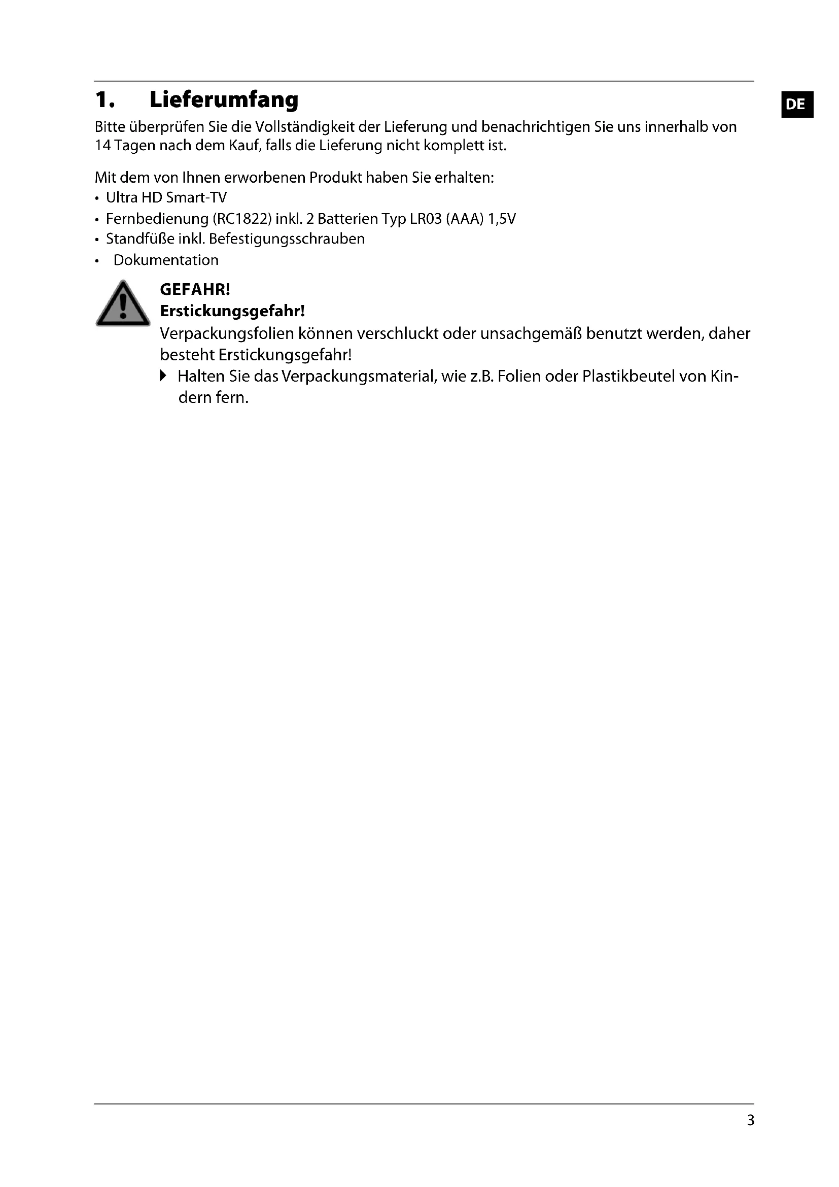 - Bewahren Sie das Verpackungsmaterial bitte gut auf und benutzen Sie ausschließlich dieses, um den Fernseher zu transportieren. GEFAHR! Erstickungsgefahr! Verpackungsfolien können verschluckt oder unsachgemäß benutzt werden, daher besteht Erstickungsgefahr! Halten Sie das Verpackungsmaterial, wie z.B. Folien oder Plastikbeutel von Kin- dern fern.