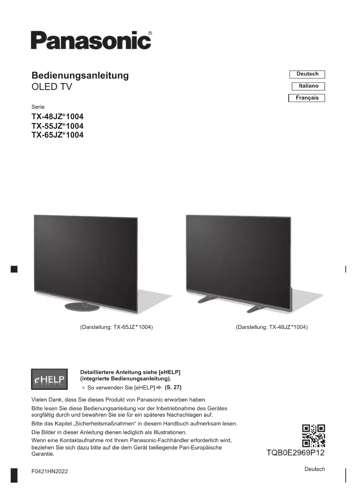Vielen Dank, dass Sie dieses Produkt von Panasonic erworben haben. Bitte lesen Sie diese Bedienungsanleitung vor der Inbetriebnahme des Gerätes sorgfältig durch und bewahren Sie sie für ein späteres Nachschlagen auf. Bitte das Kapitel „Sicherheitsmaßnahmen“ in diesem Handbuch aufmerksam lesen. Die Bilder in dieser Anleitung dienen lediglich als Illustrationen. Wenn eine Kontaktaufnahme mit Ihrem Panasonic-Fachhändler erforderlich wird, beziehen Sie sich dazu bitte auf die dem Gerät beiliegende Pan-Europäische Garantie. F0421HN2022 Deutsch Bedienungsanleitung OLED TV Detailliertere Anleitung siehe [eHELP] (integrierte Bedienungsanleitung).
