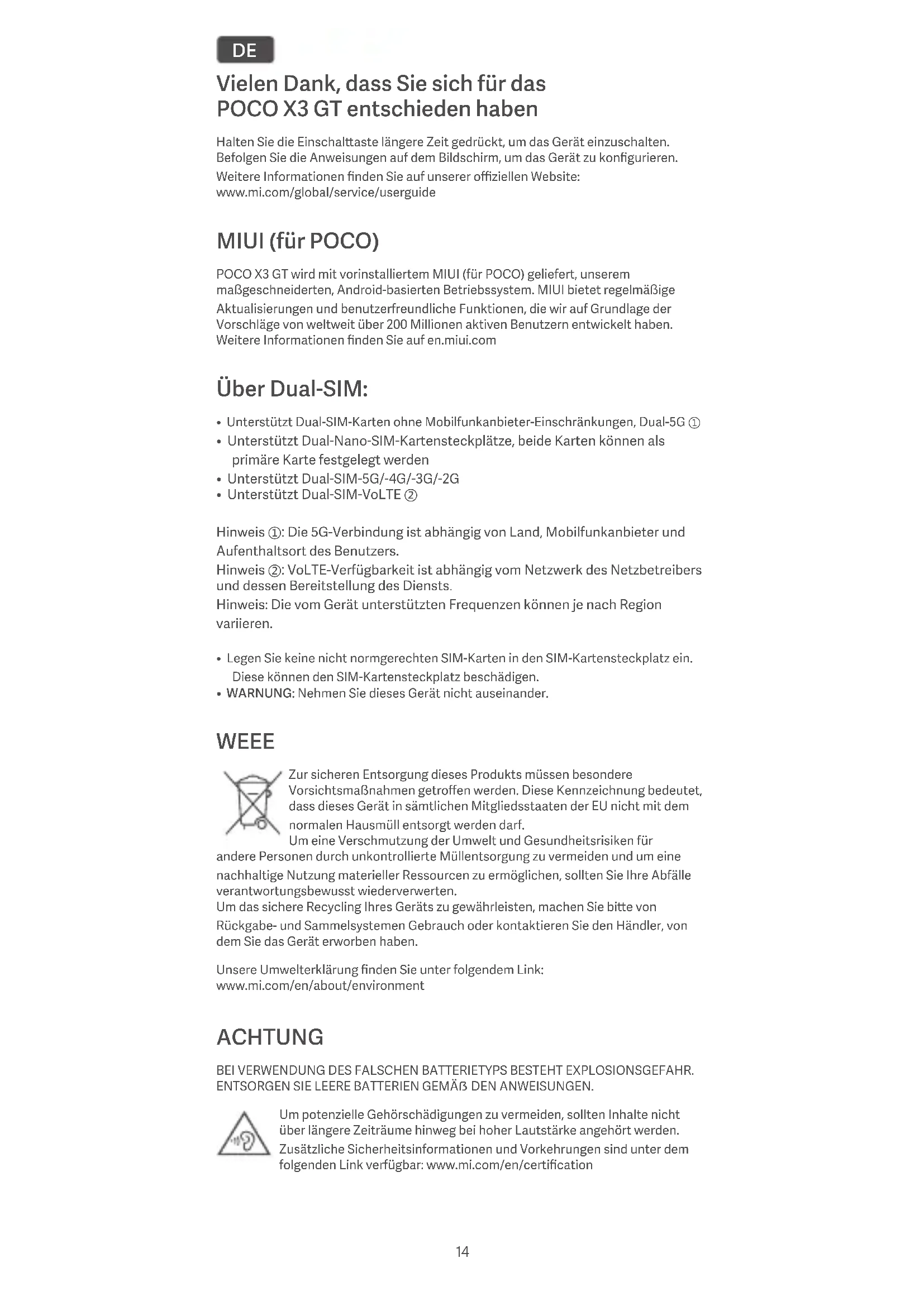 - WARNUNG: Nehmen Sie dieses Gerät nicht auseinander. WEEE Zur sicheren Entsorgung dieses Produkts müssen besondere Vorsichtsmaßnahmen getroffen werden. Diese Kennzeichnung bedeutet, dass dieses Gerät in sämtlichen Mitgliedsstaaten der EU nicht mit dem normalen Hausmüll entsorgt werden darf. Um eine Verschmutzung der Umwelt und Gesundheitsrisiken für andere Personen durch unkontrollierte Müllentsorgung zu vermeiden und um eine nachhaltige Nutzung materieller Ressourcen zu ermöglichen, sollten Sie Ihre Abfälle verantwortungsbewusst wiederverwerten. Um das sichere Recycling Ihres Geräts zu gewährleisten, machen Sie bie von Rückgabe- und Sammelsystemen Gebrauch oder kontaktieren Sie den Händler, von dem Sie das Gerät erworben haben. Unsere Umwelterklärung finden Sie unter folgendem Link: www.mi.com/en/about/environment ACHTUNG BEI VERWENDUNG DES FALSCHEN BATTERIETYPS BESTEHT EXPLOSIONSGEFAHR. ENTSORGEN SIE LEERE BATTERIEN GEMÄẞ DEN ANWEISUNGEN. Um potenzielle Gehörschädigungen zu vermeiden, sollten Inhalte nicht über längere Zeiträume hinweg bei hoher Lautstärke angehört werden. Zusätzliche Sicherheitsinformationen und Vorkehrungen sind unter dem folgenden Link verfügbar: www.mi.com/en/certification 14Wichtige Sicherheitsinformationen Lesen Sie die untenstehenden Sicherheitsinformationen durch, bevor Sie das Gerät benutzen: