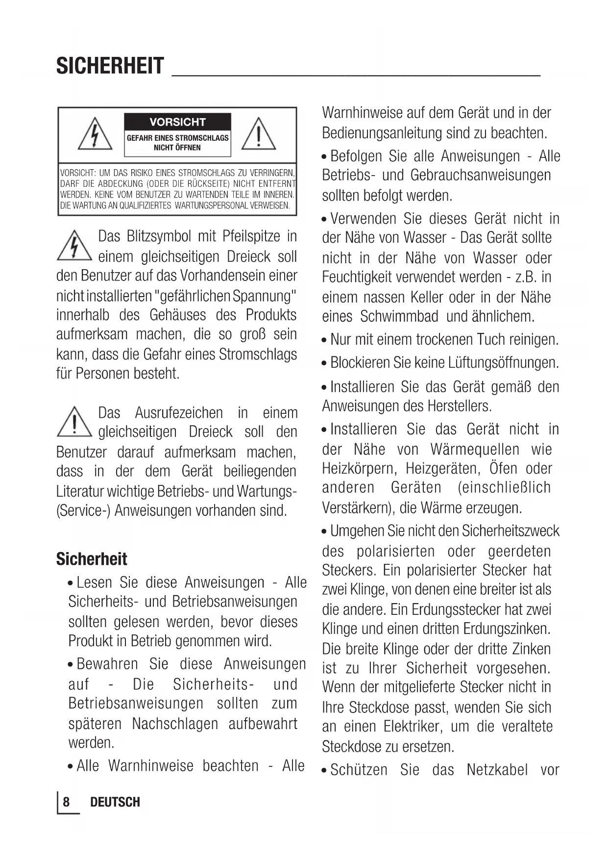 - Schützen Sie das Netzkabel vor VORSICHT VORSICHT: UM DAS RISIKO EINES STROMSCHLAGS ZU VERRINGERN, DARF DIE ABDECKUNG (ODER DIE RÜCKSEITE) NICHT ENTFERNT WERDEN. KEINE VOM BENUTZER ZU WARTENDEN TEILE IM INNEREN. DIE WARTUNG AN QUALIFIZIERTES WARTUNGSPERSONAL VERWEISEN.GEFAHR EINES STROMSCHLAGS NICHT ÖFFNEN9 DEUTSCH SICHERHEIT ________________________________ dem Betreten oder Einklemmen, insbesondere an Steckern, Steckdosen und der Stelle, an der sie aus dem Gerät austreten.