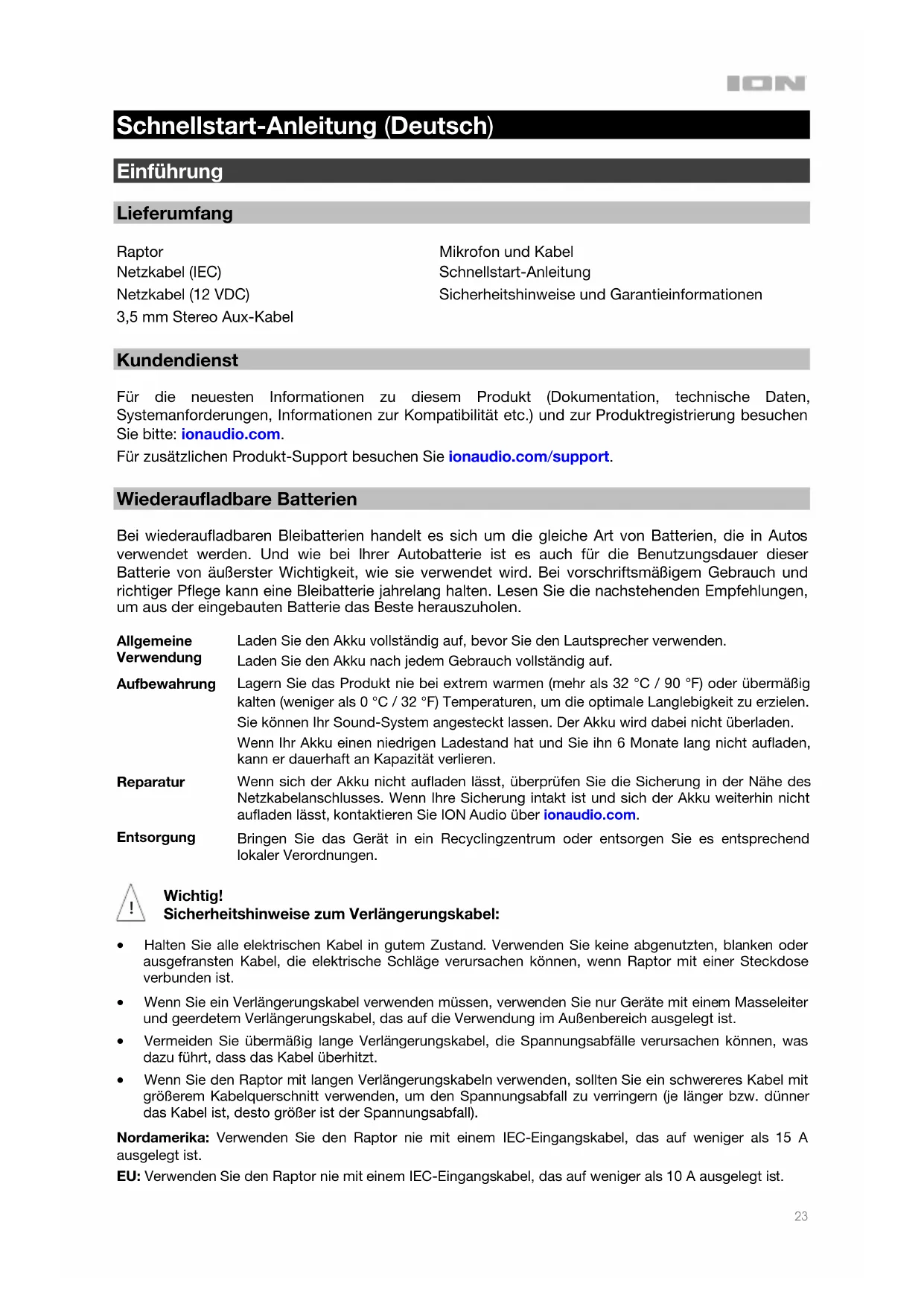 Schnellstart-Anleitung (Deutsch) Einführung Lieferumfang Raptor Netzkabel (IEC) Netzkabel (12 VDC) 3,5 mm Stereo Aux-Kabel Mikrofon und Kabel Schnellstart-Anleitung Sicherheitshinweise und Garantieinformationen Kundendienst Für die neuesten Informationen zu diesem Produkt (Dokumentation, technische Daten, Systemanforderungen, Informationen zur Kompatibilität etc.) und zur Produktregistrierung besuchen Sie bitte: ionaudio.com. Für zusätzlichen Produkt-Support besuchen Sie ionaudio.com/support. Wiederaufladbare Batterien Bei wiederaufladbaren Bleibatterien handelt es sich um die gleiche Art von Batterien, die in Autos verwendet werden. Und wie bei Ihrer Autobatterie ist es auch für die Benutzungsdauer dieser Batterie von äußerster Wichtigkeit, wie sie verwendet wird. Bei vorschriftsmäßigem Gebrauch und richtiger Pflege kann eine Bleibatterie jahrelang halten. Lesen Sie die nachstehenden Empfehlungen, um aus der eingebauten Batterie das Beste herauszuholen. Allgemeine Verwendung Laden Sie den Akku vollständig auf, bevor Sie den Lautsprecher verwenden. Laden Sie den Akku nach jedem Gebrauch vollständig auf. Aufbewahrung Lagern Sie das Produkt nie bei extrem warmen (mehr als 32 °C / 90 °F) oder übermäßig kalten (weniger als 0 °C / 32 °F) Temperaturen, um die optimale Langlebigkeit zu erzielen. Sie können Ihr Sound-System angesteckt lassen. Der Akku wird dabei nicht überladen. Wenn Ihr Akku einen niedrigen Ladestand hat und Sie ihn 6 Monate lang nicht aufladen, kann er dauerhaft an Kapazität verlieren. Reparatur Wenn sich der Akku nicht aufladen lässt, überprüfen Sie die Sicherung in der Nähe des Netzkabelanschlusses. Wenn Ihre Sicherung intakt ist und sich der Akku weiterhin nicht aufladen lässt, kontaktieren Sie ION Audio über ionaudio.com. Entsorgung Bringen Sie das Gerät in ein Recyclingzentrum oder entsorgen Sie es entsprechend lokaler Verordnungen. Wichtig! Sicherheitshinweise zum Verlängerungskabel: