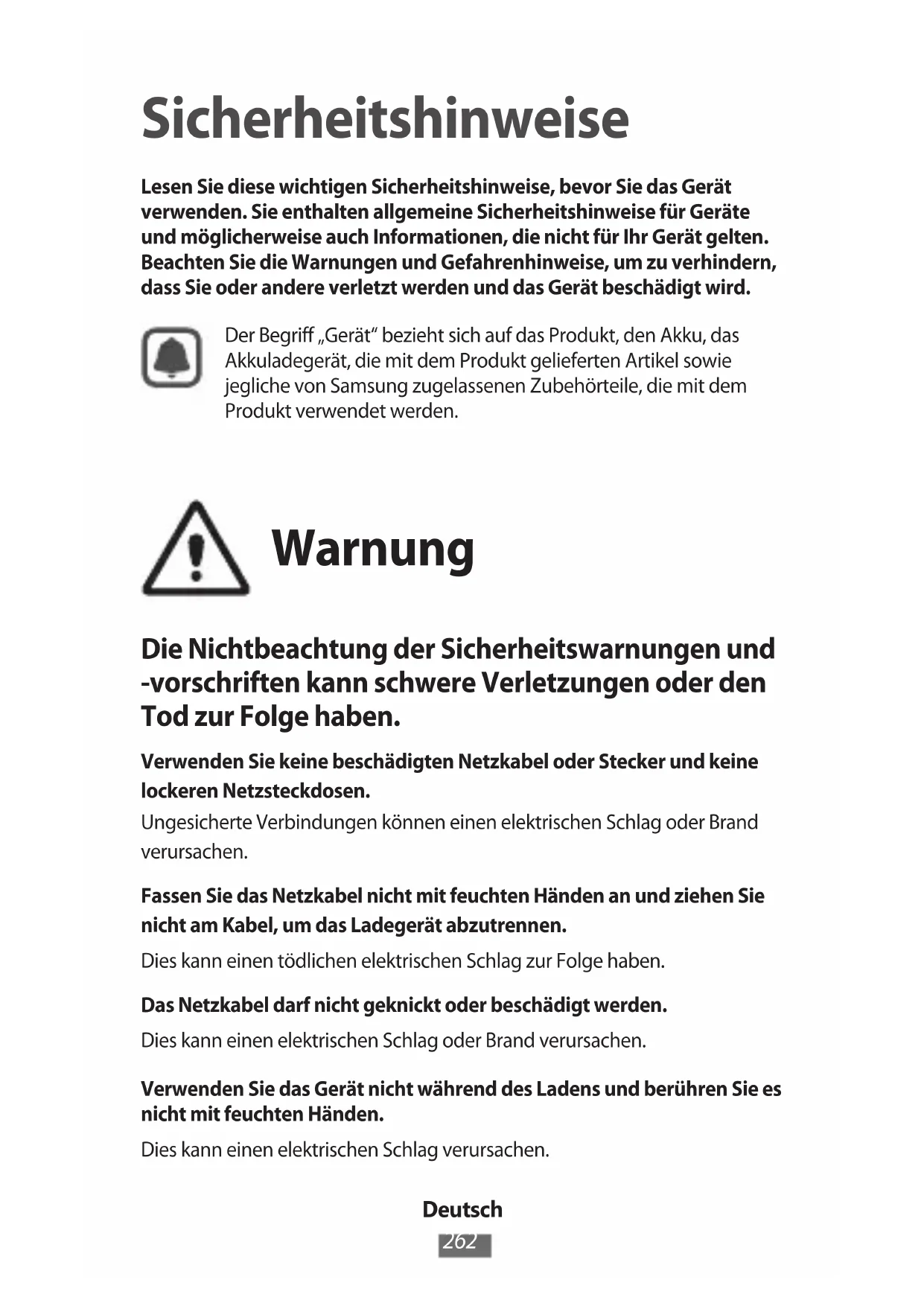 Sicherheitshinweise Lesen Sie diese wichtigen Sicherheitshinweise, bevor Sie das Gerät verwenden. Sie enthalten allgemeine Sicherheitshinweise für Geräte und möglicherweise auch Informationen, die nicht für Ihr Gerät gelten. Beachten Sie die Warnungen und Gefahrenhinweise, um zu verhindern, dass Sie oder andere verletzt werden und das Gerät beschädigt wird.Der Begriff „Gerät“ bezieht sich auf das Produkt, den Akku, das Akkuladegerät, die mit dem Produkt gelieferten Artikel sowie jegliche von Samsung zugelassenen Zubehörteile, die mit dem Produkt verwendet werden. Warnung Die Nichtbeachtung der Sicherheitswarnungen und -vorschriften kann schwere Verletzungen oder den Tod zur Folge haben. Verwenden Sie keine beschädigten Netzkabel oder Stecker und keine lockeren Netzsteckdosen.Ungesicherte Verbindungen können einen elektrischen Schlag oder Brand verursachen.Fassen Sie das Netzkabel nicht mit feuchten Händen an und ziehen Sie nicht am Kabel, um das Ladegerät abzutrennen.Dies kann einen tödlichen elektrischen Schlag zur Folge haben.Das Netzkabel darf nicht geknickt oder beschädigt werden.Dies kann einen elektrischen Schlag oder Brand verursachen.Verwenden Sie das Gerät nicht während des Ladens und berühren Sie es nicht mit feuchten Händen.Dies kann einen elektrischen Schlag verursachen.Deutsch