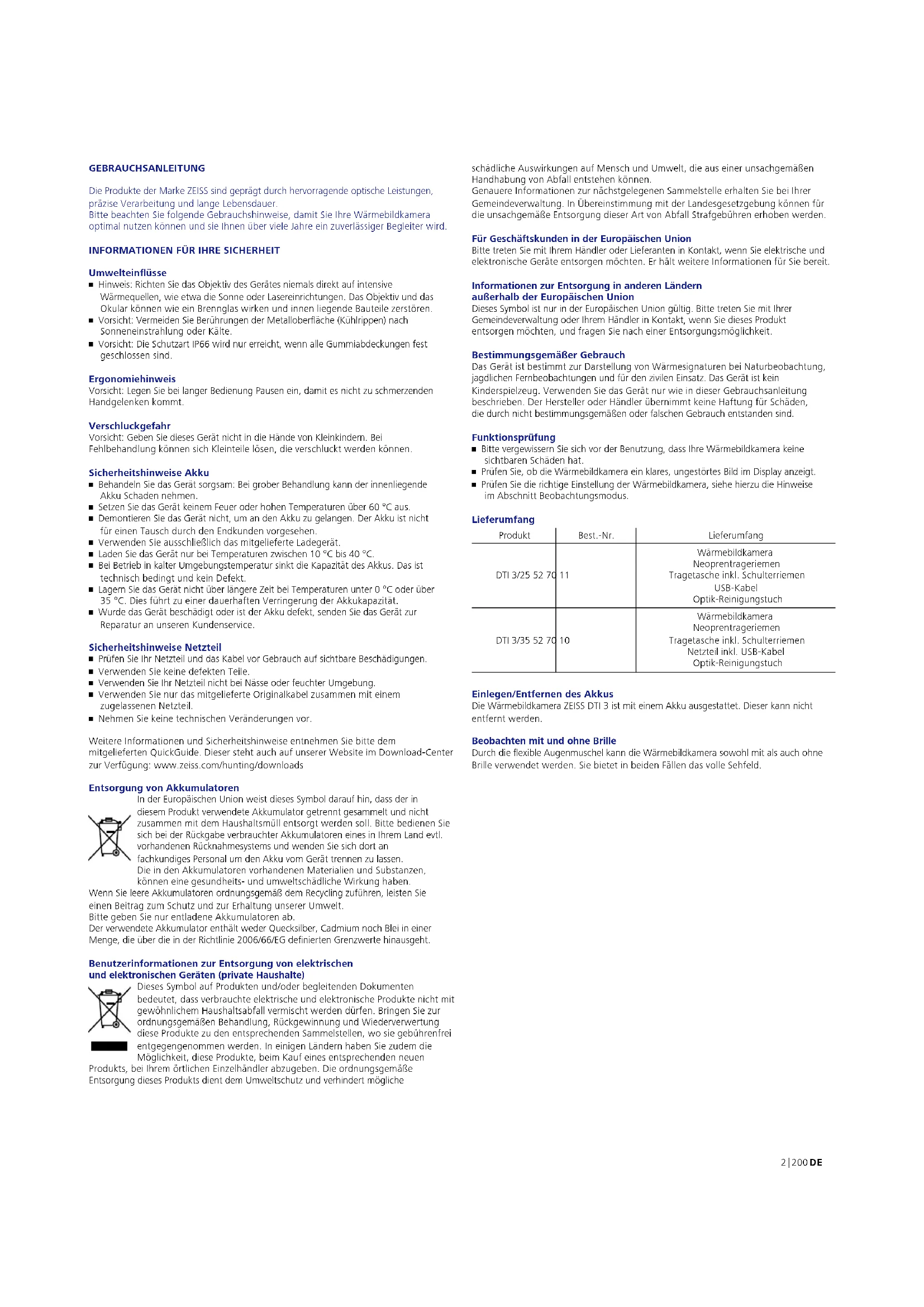 - Nehmen Sie keine technischen Veränderungen vor. Weitere Informationen und Sicherheitshinweise entnehmen Sie bitte dem mitgelieferten QuickGuide. Dieser steht auch auf unserer Website im Download-Center zur Verfügung: www.zeiss.com/hunting/downloads Entsorgung von Akkumulatoren In der Europäischen Union weist dieses Symbol darauf hin, dass der in diesem Produkt verwendete Akkumulator getrennt gesammelt und nicht zusammen mit dem Haushaltsmüll entsorgt werden soll. Bitte bedienen Sie sich bei der Rückgabe verbrauchter Akkumulatoren eines in Ihrem Land evtl. vorhandenen Rücknahmesystems und wenden Sie sich dort an fachkundiges Personal um den Akku vom Gerät trennen zu lassen. Die in den Akkumulatoren vorhandenen Materialien und Substanzen, können eine gesundheits- und umweltschädliche Wirkung haben. Wenn Sie leere Akkumulatoren ordnungsgemäß dem Recycling zuführen, leisten Sie einen Beitrag zum Schutz und zur Erhaltung unserer Umwelt. Bitte geben Sie nur entladene Akkumulatoren ab. Der verwendete Akkumulator enthält weder Quecksilber, Cadmium noch Blei in einer Menge, die über die in der Richtlinie 2006/66/EG denierten Grenzwerte hinausgeht. Benutzerinformationen zur Entsorgung von elektrischen und elektronischen Geräten (private Haushalte) Dieses Symbol auf Produkten und/oder begleitenden Dokumenten bedeutet, dass verbrauchte elektrische und elektronische Produkte nicht mit gewöhnlichem Haushaltsabfall vermischt werden dürfen. Bringen Sie zur ordnungsgemäßen Behandlung, Rückgewinnung und Wiederverwertung diese Produkte zu den entsprechenden Sammelstellen, wo sie gebührenfrei entgegengenommen werden. In einigen Ländern haben Sie zudem die Möglichkeit, diese Produkte, beim Kauf eines entsprechenden neuen Produkts, bei Ihrem örtlichen Einzelhändler abzugeben. Die ordnungsgemäße Entsorgung dieses Produkts dient dem Umweltschutz und verhindert mögliche schädliche Auswirkungen auf Mensch und Umwelt, die aus einer unsachgemäßen Handhabung von Abfall entstehen können. Genauere Informationen zur nächstgelegenen Sammelstelle erhalten Sie bei Ihrer Gemeindeverwaltung. In Übereinstimmung mit der Landesgesetzgebung können für die unsachgemäße Entsorgung dieser Art von Abfall Strafgebühren erhoben werden. Für Geschäftskunden in der Europäischen Union Bitte treten Sie mit Ihrem Händler oder Lieferanten in Kontakt, wenn Sie elektrische und elektronische Geräte entsorgen möchten. Er hält weitere Informationen für Sie bereit. Informationen zur Entsorgung in anderen Ländern außerhalb der Europäischen Union Dieses Symbol ist nur in der Europäischen Union gültig. Bitte treten Sie mit Ihrer Gemeindeverwaltung oder Ihrem Händler in Kontakt, wenn Sie dieses Produkt entsorgen möchten, und fragen Sie nach einer Entsorgungsmöglichkeit. Bestimmungsgemäßer Gebrauch Das Gerät ist bestimmt zur Darstellung von Wärmesignaturen bei Naturbeobachtung, jagdlichen Fernbeobachtungen und für den zivilen Einsatz. Das Gerät ist kein Kinderspielzeug. Verwenden Sie das Gerät nur wie in dieser Gebrauchsanleitung beschrieben. Der Hersteller oder Händler übernimmt keine Haftung für Schäden, diedurch nicht bestimmungsgemäßen oder falschen Gebrauch entstanden sind. Funktionsprüfung