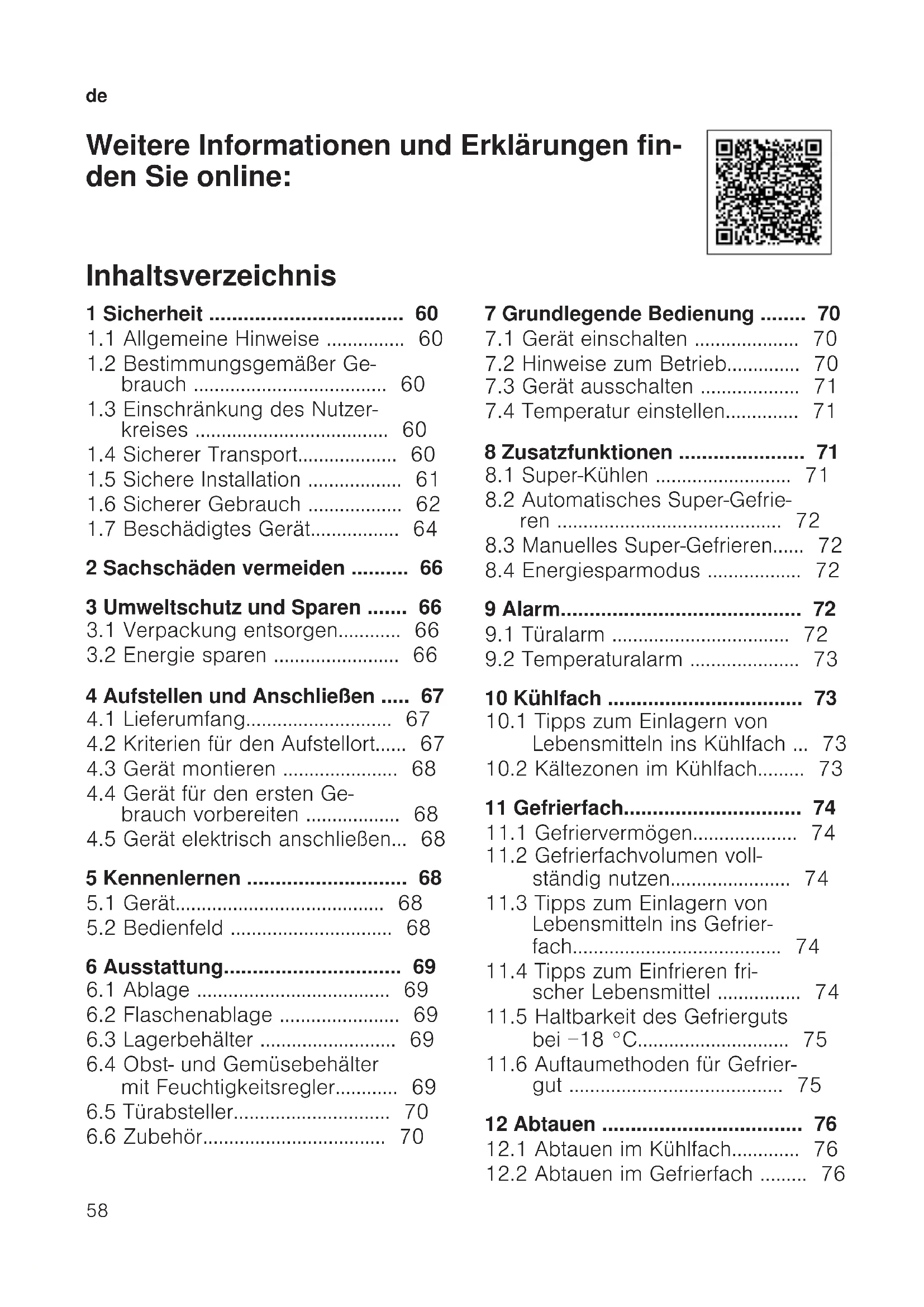 Weitere Informationen und Erklärungen fin- den Sie online: Inhaltsverzeichnis 1 Sicherheit ..................................60