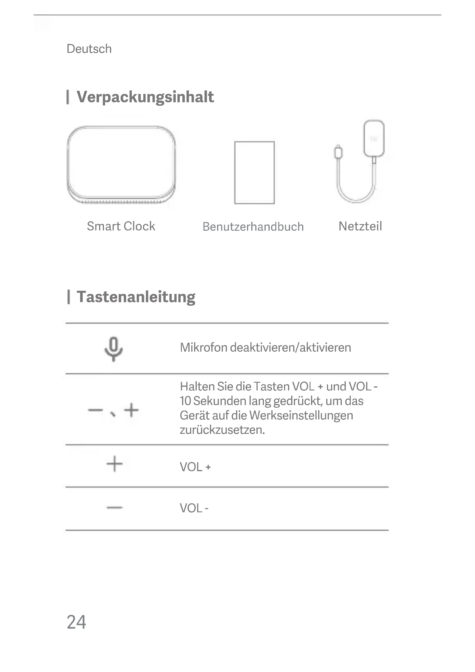 Netzteil Benutzerhandbuch SmartClock Verpackungsinhalt Tastenanleitung Mikrofon deaktivieren/aktivieren Deutsch Halten Sie die Tasten VOL+ und VOL- 10Sekunden lang gedrückt, um das Gerät auf die Werkseinstellungen zurückzusetzen. VOL+ VOL-25 Ihre MiSmartClock Was Sie brauchen, um loszulegen Erste Schrie