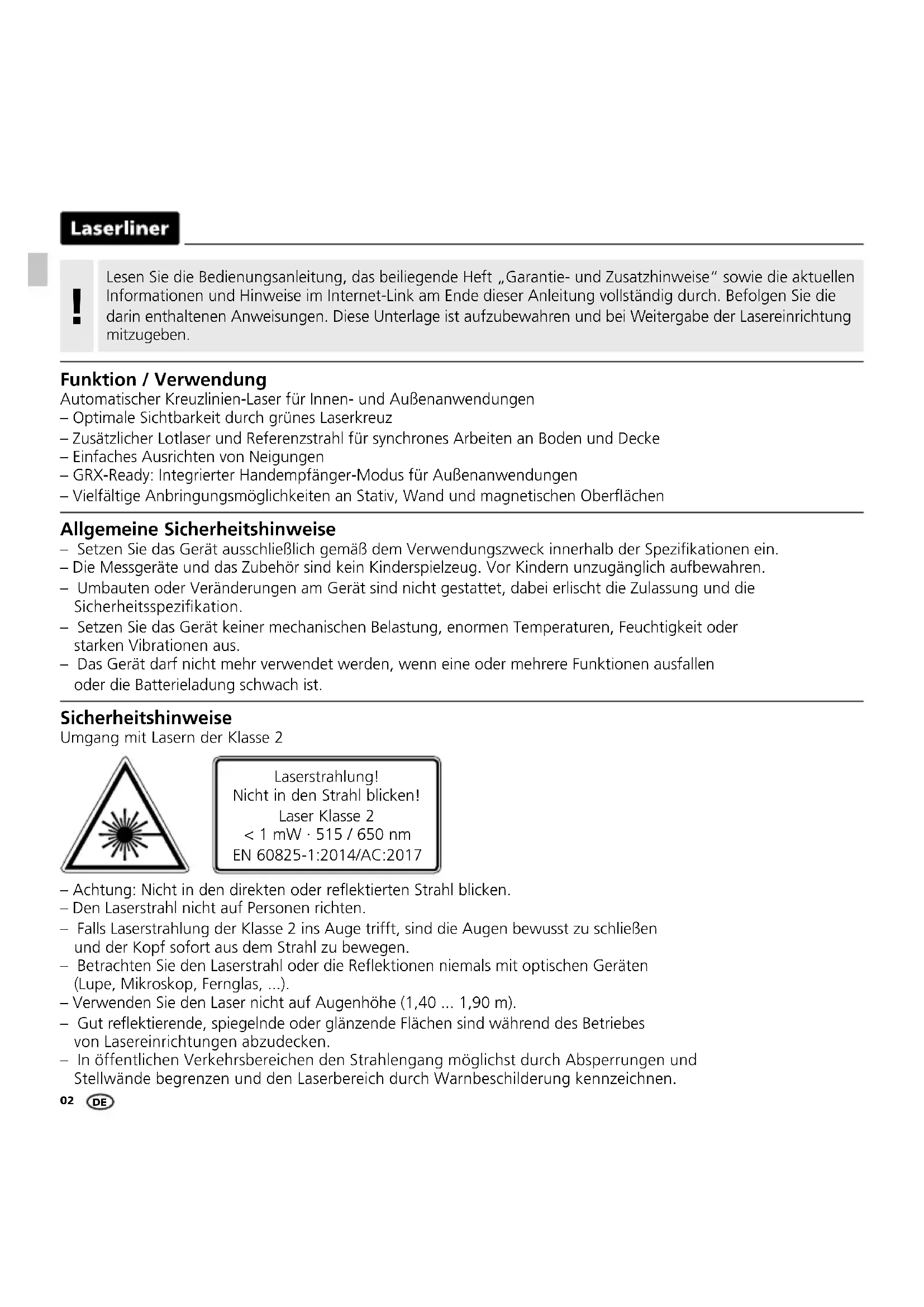 Allgemeine Sicherheitshinweise – Setzen Sie das Gerät ausschließlich gemäß dem Verwendungszweck innerhalb der Spezikationen ein. – Die Messgeräte und das Zubehör sind kein Kinderspielzeug. Vor Kindern unzugänglich aufbewahren. – Umbauten oder Veränderungen am Gerät sind nicht gestattet, dabei erlischt die Zulassung und die Sicherheitsspezikation. – Setzen Sie das Gerät keiner mechanischen Belastung, enormen Temperaturen, Feuchtigkeit oder starken Vibrationen aus. – Das Gerät darf nicht mehr verwendet werden, wenn eine oder mehrere Funktionen ausfallen oder die Batterieladung schwach ist. Sicherheitshinweise Umgang mit Lasern der Klasse 2 – Achtung: Nicht in den direkten oder reektierten Strahl blicken. – Den Laserstrahl nicht auf Personen richten. – Falls Laserstrahlung der Klasse 2 ins Auge trifft, sind die Augen bewusst zu schließen und der Kopf sofort aus dem Strahl zu bewegen. – Betrachten Sie den Laserstrahl oder die Reektionen niemals mit optischen Geräten (Lupe, Mikroskop, Fernglas, ...). – Verwenden Sie den Laser nicht auf Augenhöhe (1,40 ... 1,90 m). – Gut reektierende, spiegelnde oder glänzende Flächen sind während des Betriebes von Lasereinrichtungen abzudecken. – In öffentlichen Verkehrsbereichen den Strahlengang möglichst durch Absperrungen und Stellwände begrenzen und den Laserbereich durch Warnbeschilderung kennzeichnen. Laserstrahlung! Nicht in den Strahl blicken! Laser Klasse 2 < 1 mW · 515 / 650 nm EN 60825-1:2014/AC:2017 Funktion / Verwendung Automatischer Kreuzlinien-Laser für Innen- und Außenanwendungen – Optimale Sichtbarkeit durch grünes Laserkreuz – Zusätzlicher Lotlaser und Referenzstrahl für synchrones Arbeiten an Boden und Decke – Einfaches Ausrichten von Neigungen – GRX-Ready: Integrierter Handempfänger-Modus für Außenanwendungen – Vielfältige Anbringungsmöglichkeiten an Stativ, Wand und magnetischen Oberächen DESuperCross-Laser 2GP