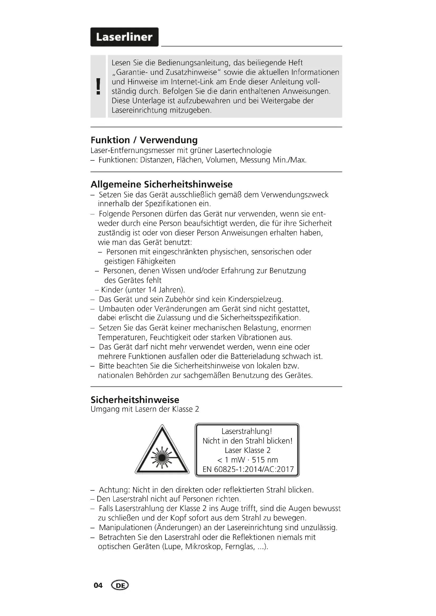 Allgemeine Sicherheitshinweise – Setzen Sie das Gerät ausschließlich gemäß dem Verwendungszweck innerhalb der Spezikationen ein. – Folgende Personen dürfen das Gerät nur verwenden, wenn sie ent- weder durch eine Person beaufsichtigt werden, die für ihre Sicherheit zuständig ist oder von dieser Person Anweisungen erhalten haben, wie man das Gerät benutzt: – Personen mit eingeschränkten physischen, sensorischen oder geistigen Fähigkeiten – Personen, denen Wissen und/oder Erfahrung zur Benutzung des Gerätes fehlt – Kinder (unter 14 Jahren). – Das Gerät und sein Zubehör sind kein Kinderspielzeug. – Umbauten oder Veränderungen am Gerät sind nicht gestattet, dabei erlischt die Zulassung und die Sicherheitsspezikation. – Setzen Sie das Gerät keiner mechanischen Belastung, enormen Temperaturen, Feuchtigkeit oder starken Vibrationen aus. – Das Gerät darf nicht mehr verwendet werden, wenn eine oder mehrere Funktionen ausfallen oder die Batterieladung schwach ist. – Bitte beachten Sie die Sicherheitshinweise von lokalen bzw. nationalen Behörden zur sachgemäßen Benutzung des Gerätes. Sicherheitshinweise Umgang mit Lasern der Klasse 2 Laserstrahlung! Nicht in den Strahl blicken! Laser Klasse 2 < 1 mW · 635 nm EN 60825-1:2014 Funktion / Verwendung Laser-Entfernungsmesser mit grüner Lasertechnologie – Funktionen: Distanzen, Flächen, Volumen, Messung Min./Max. – Achtung: Nicht in den direkten oder reektierten Strahl blicken. – Den Laserstrahl nicht auf Personen richten. – Falls Laserstrahlung der Klasse 2 ins Auge trifft, sind die Augen bewusst zu schließen und der Kopf sofort aus dem Strahl zu bewegen. – Manipulationen (Änderungen) an der Lasereinrichtung sind unzulässig. – Betrachten Sie den Laserstrahl oder die Reektionen niemals mit optischen Geräten (Lupe, Mikroskop, Fernglas, ...).