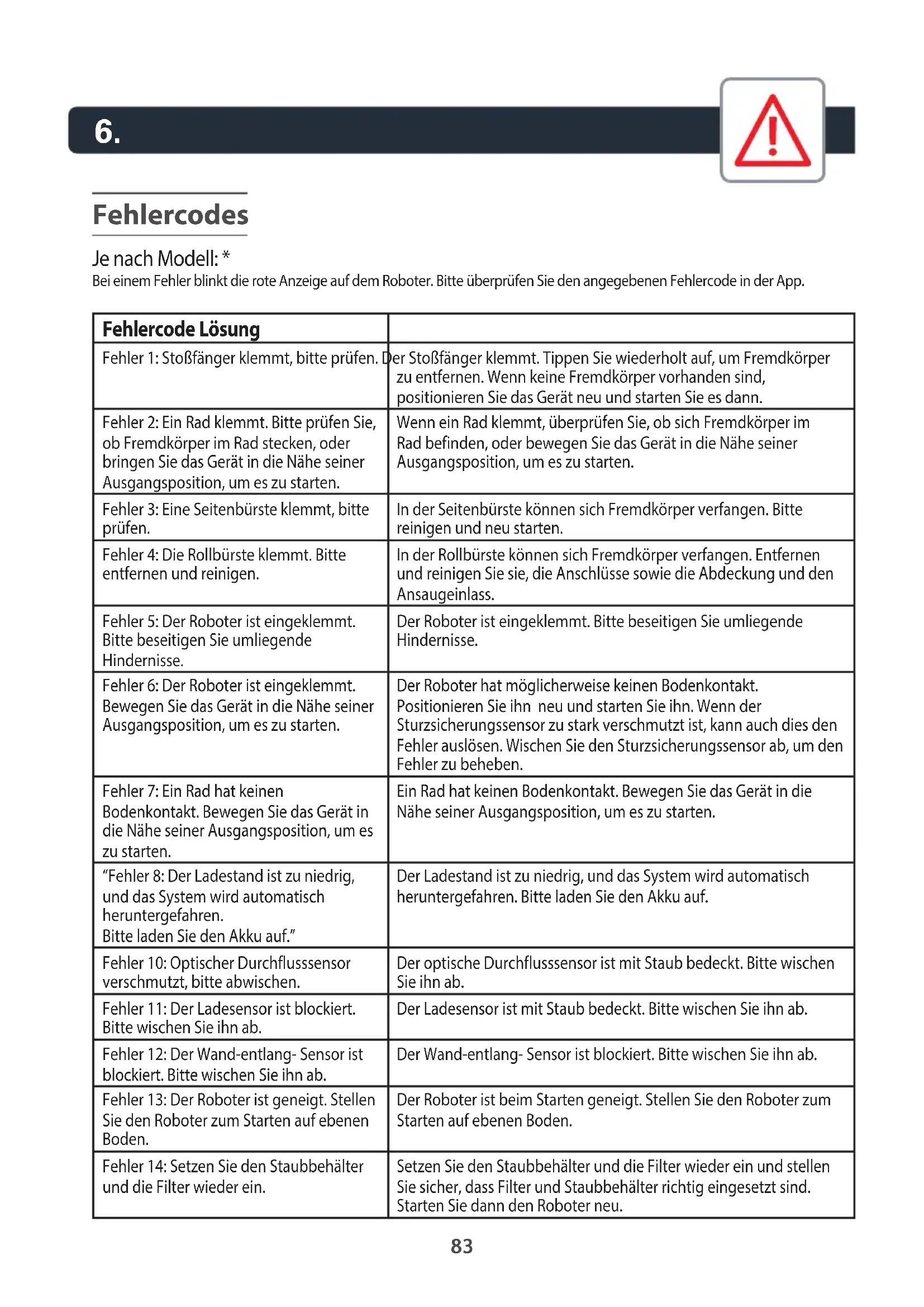 Fehlercodes Je nach Modell: * Bei einem Fehler blinkt die rote Anzeige auf dem Roboter. Bitte überprüfen Sie den angegebenen Fehlercode in der App. Fehlercode Lösung Fehler1: Stoßfänger klemmt, bitte prüfen. Der Stoßfänger klemmt. Tippen Sie wiederholt auf, um Fremdkörper zu entfernen. Wenn keine Fremdkörper vorhanden sind, positionieren Sie das Gerät neu und starten Sie es dann. Fehler2: Ein Rad klemmt. Bitte prüfen Sie, ob Fremdkörper im Rad stecken, oder bringen Sie das Gerät in die Nähe seiner Ausgangsposition, um es zu starten. Wenn ein Rad klemmt, überprüfen Sie, ob sich Fremdkörper im Rad befinden, oder bewegen Sie das Gerät in die Nähe seiner Ausgangsposition, um es zu starten. Fehler3: Eine Seitenbürste klemmt, bitte prüfen. In der Seitenbürste können sich Fremdkörper verfangen. Bitte reinigen und neu starten. Fehler4: Die Rollbürste klemmt. Bitte entfernen und reinigen. In der Rollbürste können sich Fremdkörper verfangen. Entfernen und reinigen Sie sie, die Anschlüsse sowie die Abdeckung und den Ansaugeinlass. Fehler5: Der Roboter ist eingeklemmt. Bitte beseitigen Sie umliegende Hindernisse. Der Roboter ist eingeklemmt. Bitte beseitigen Sie umliegende Hindernisse. Fehler6: Der Roboter ist eingeklemmt. Bewegen Sie das Gerät in die Nähe seiner Ausgangsposition, um es zu starten. Der Roboter hat möglicherweise keinen Bodenkontakt. Positionieren Sie ihn neu und starten Sie ihn. Wenn der Sturzsicherungssensor zu stark verschmutzt ist, kann auch dies den Fehler auslösen. Wischen Sie den Sturzsicherungssensor ab, um den Fehler zu beheben. Fehler7: Ein Rad hat keinen Bodenkontakt. Bewegen Sie das Gerät in die Nähe seiner Ausgangsposition, um es zu starten. Ein Rad hat keinen Bodenkontakt. Bewegen Sie das Gerät in die Nähe seiner Ausgangsposition, um es zu starten. “Fehler8: Der Ladestand ist zu niedrig, und das System wird automatisch heruntergefahren. Bitte laden Sie den Akku auf.” Der Ladestand ist zu niedrig, und das System wird automatisch heruntergefahren. Bitte laden Sie den Akku auf. Fehler10: Optischer Durchflusssensor verschmutzt, bitte abwischen. Der optische Durchflusssensor ist mit Staub bedeckt. Bitte wischen Sie ihn ab. Fehler11: Der Ladesensor ist blockiert. Bitte wischen Sie ihn ab. Der Ladesensor ist mit Staub bedeckt. Bitte wischen Sie ihn ab. Fehler12: Der Wand-entlang- Sensor ist blockiert. Bitte wischen Sie ihn ab. Der Wand-entlang- Sensor ist blockiert. Bitte wischen Sie ihn ab. Fehler13: Der Roboter ist geneigt. Stellen Sie den Roboter zum Starten auf ebenen Boden. Der Roboter ist beim Starten geneigt. Stellen Sie den Roboter zum Starten auf ebenen Boden. Fehler14: Setzen Sie den Staubbehälter und die Filter wieder ein. Setzen Sie den Staubbehälter und die Filter wieder ein und stellen Sie sicher, dass Filter und Staubbehälter richtig eingesetzt sind. Starten Sie dann den Roboter neu.84