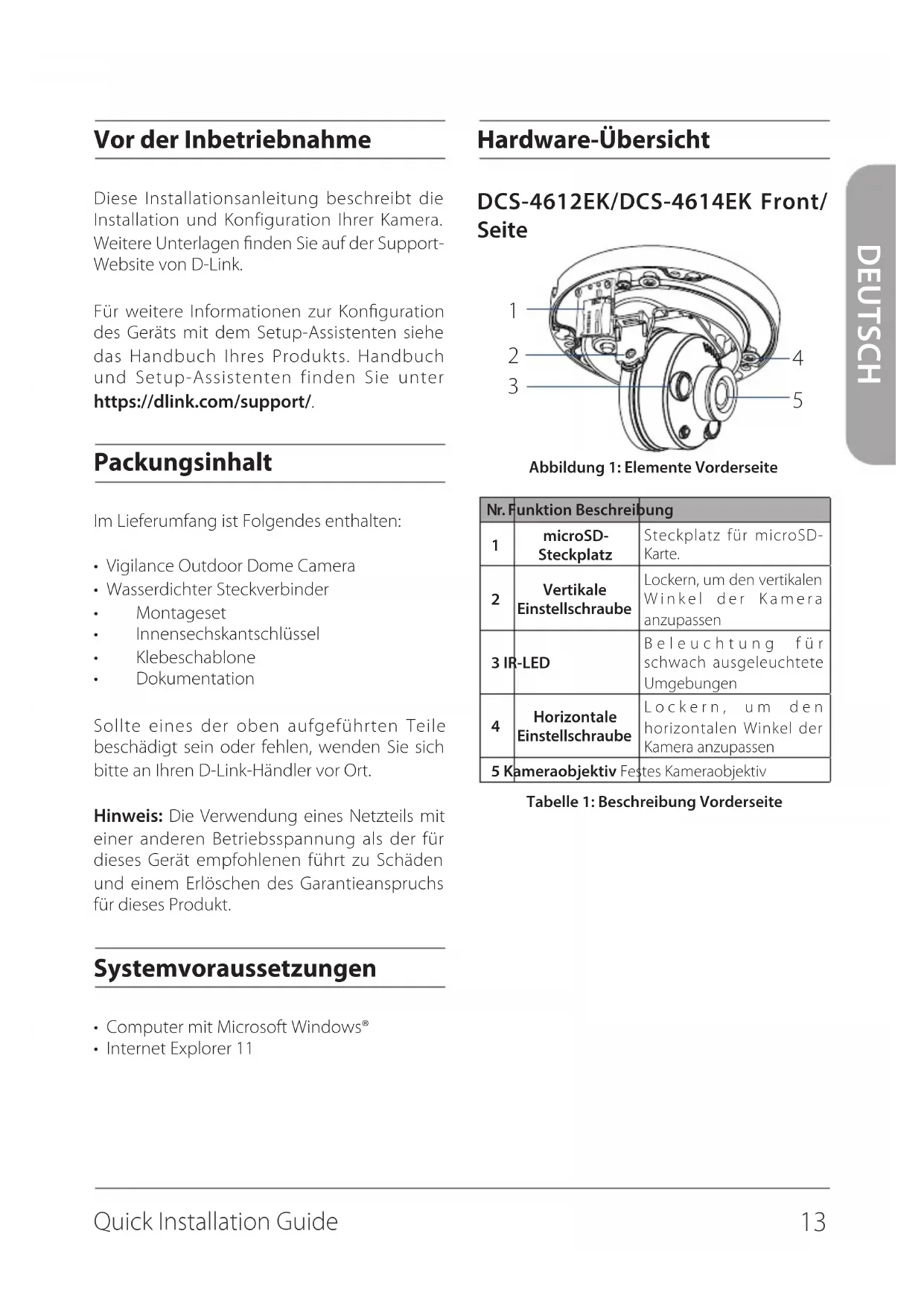Quick Installation Guide ENGLISH TECHNICAL SUPPORT dlink.com/support Additional Information If you are encountering problems setting up your network, please refer to the user manual. Product specifications, size and shape are subject to change without notice, and actual product appearance may differ from that depicted on the packaging. Visit your local D-Link website for technical support details. Additional help is available online. To find out more about D-Link products or marketing information, please visit the D-Link support website at http://dlink.com/support/. Warranty Information Please visit http://warranty.dlink.com/ for warranty information for your region. Installation InformationHardware-Übersicht DCS-4612EK/DCS-4614EK Front/ Seite Abbildung 1: Elemente VorderseiteNr. Funktion Beschreibung microSD-SteckplatzSteckplatz für microSD-Karte. Vertikale EinstellschraubeLockern, um den vertikalen Winkel der Kamera anzupassen3 IR-LEDBeleuchtung für schwach ausgeleuchtete Umgebungen Horizontale EinstellschraubeLockern, um den horizontalen Winkel der Kamera anzupassen5 Kameraobjektiv Festes KameraobjektivTabelle 1: Beschreibung Vorderseite Vor der Inbetriebnahme Diese Installationsanleitung beschreibt die Installation und Konfiguration Ihrer Kamera. Weitere Unterlagen finden Sie auf der Support- Website von D-Link. Für weitere Informationen zur Konfiguration des Geräts mit dem Setup-Assistenten siehe das Handbuch Ihres Produkts. Handbuch und Setup-Assistenten finden Sie unter https://dlink.com/support/. Packungsinhalt Im Lieferumfang ist Folgendes enthalten: