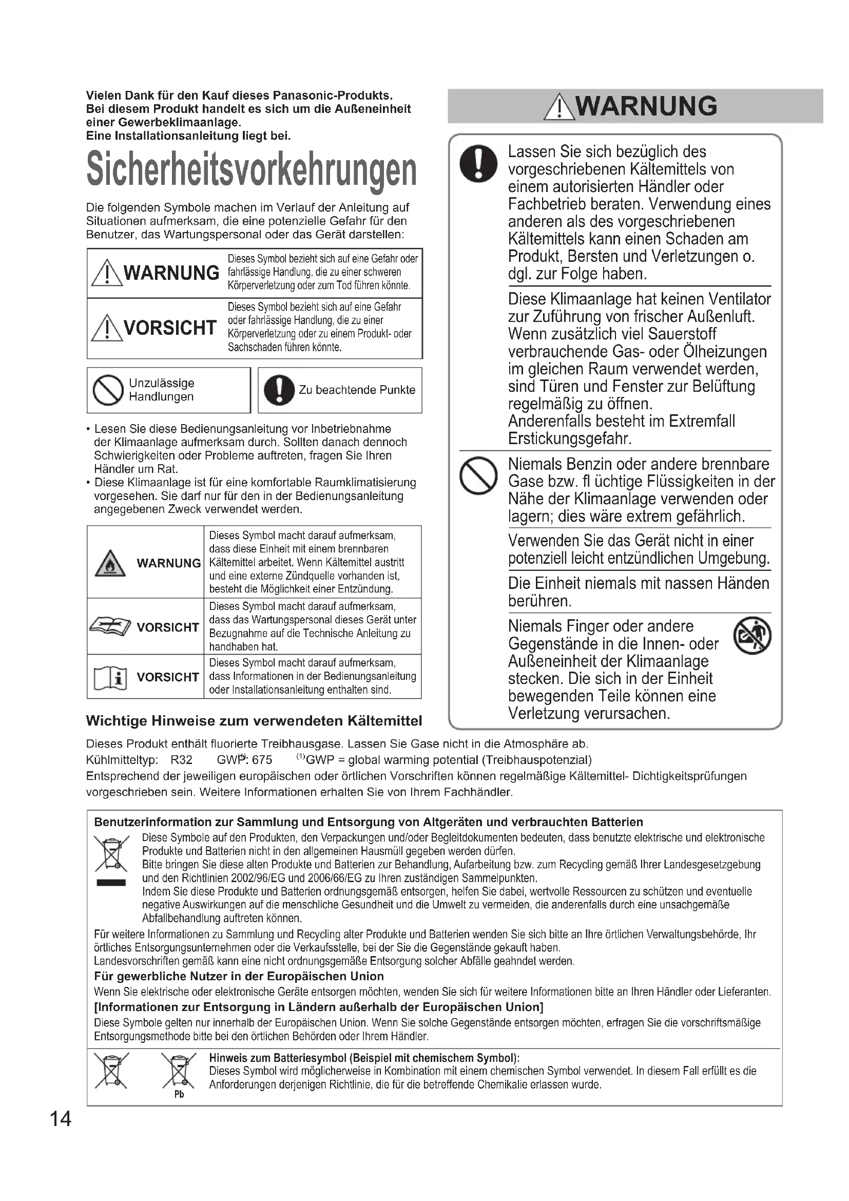 01320982all.indb1301320982all.indb13 2020/06/2911:10:582020/06/2911:10:5814 Vielen Dank für den Kauf dieses Panasonic-Produkts.Bei diesem Produkt handelt es sich um die Außeneinheit einer Gewerbeklimaanlage.Eine Installationsanleitung liegt bei. Sicherheitsvorkehrungen Die folgenden Symbole machen im Verlauf der Anleitung auf Situationen aufmerksam, die eine potenzielle Gefahr für den Benutzer, das Wartungspersonal oder das Gerät darstellen: WARNUNG Dieses Symbol bezieht sich auf eine Gefahr oder fahrlässige Handlung, die zu einer schweren Körperverletzung oder zum Tod führen könnte. VORSICHT Dieses Symbol bezieht sich auf eine Gefahr oder fahrlässige Handlung, die zu einer Körperverletzung oder zu einem Produkt- oder Sachschaden führen könnte.Unzulässige HandlungenZu beachtende Punkte Lesen Sie diese Bedienungsanleitung vor Inbetriebnahme der Klimaanlage aufmerksam durch. Sollten danach dennoch Schwierigkeiten oder Probleme auftreten, fragen Sie Ihren Händler um Rat. Diese Klimaanlage ist für eine komfortable Raumklimatisierung vorgesehen. Sie darf nur für den in der Bedienungsanleitung angegebenen Zweck verwendet werden. Lassen Sie sich bezüglich des vorgeschriebenen Kältemittels von einem autorisierten Händler oder Fachbetrieb beraten. Verwendung eines anderen als des vorgeschriebenen Kältemittels kann einen Schaden am Produkt, Bersten und Verletzungen o. dgl. zur Folge haben. Diese Klimaanlage hat keinen Ventilator zur Zuführung von frischer Außenluft. Wenn zusätzlich viel Sauerstoff verbrauchende Gas- oder Ölheizungen im gleichen Raum verwendet werden, sind Türen und Fenster zur Belüftung regelmäßig zu öffnen. Anderenfalls besteht im Extremfall Erstickungsgefahr. Niemals Benzin oder andere brennbare Gase bzw. fl üchtige Flüssigkeiten in der Nähe der Klimaanlage verwenden oder lagern; dies wäre extrem gefährlich. Verwenden Sie das Gerät nicht in einer potenziell leicht entzündlichen Umgebung. Die Einheit niemals mit nassen Händen berühren. Niemals Finger oder andere Gegenstände in die Innen- oder Außeneinheit der Klimaanlage stecken. Die sich in der Einheit bewegenden Teile können eine Verletzung verursachen. WARNUNG WARNUNGDieses Symbol macht darauf aufmerksam, dass diese Einheit mit einem brennbaren Kältemittel arbeitet. Wenn Kältemittel austritt und eine externe Zündquelle vorhanden ist, besteht die Möglichkeit einer Entzündung.VORSICHTDieses Symbol macht darauf aufmerksam, dass das Wartungspersonal dieses Gerät unter Bezugnahme auf die Technische Anleitung zu handhaben hat.VORSICHTDieses Symbol macht darauf aufmerksam, dass Informationen in der Bedienungsanleitung oder Installationsanleitung enthalten sind.Wichtige Hinweise zum verwendeten KältemittelDieses Produkt enthält fluorierte Treibhausgase. Lassen Sie Gase nicht in die Atmosphäre ab.Kühlmitteltyp: R32 GWP (1) : 675 (1) GWP = global warming potential (Treibhauspotenzial) Entsprechend der jeweiligen europäischen oder örtlichen Vorschriften können regelmäßige Kältemittel- Dichtigkeitsprüfungen vorgeschrieben sein. Weitere Informationen erhalten Sie von Ihrem Fachhändler.Benutzerinformation zur Sammlung und Entsorgung von Altgeräten und verbrauchten Batterien