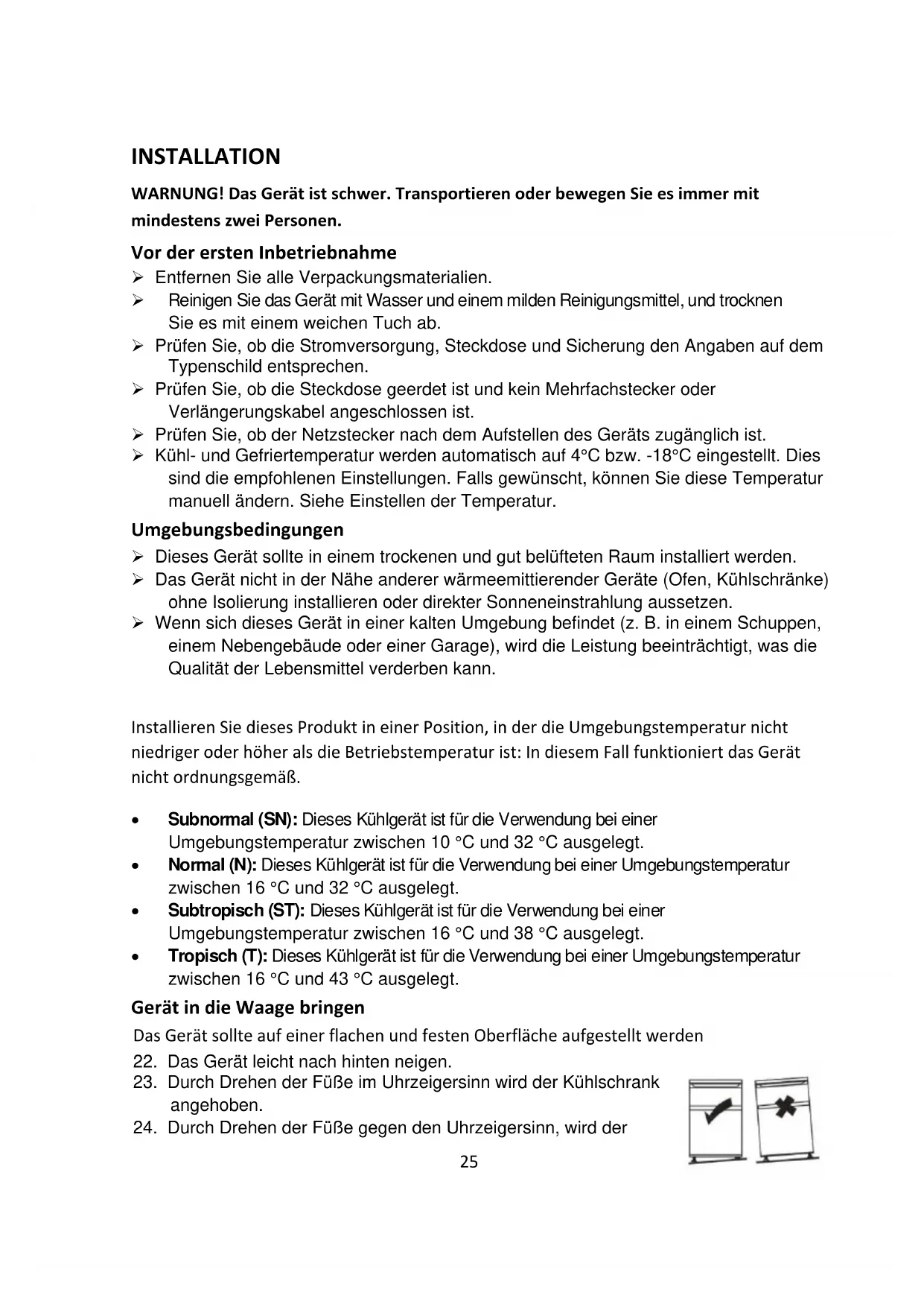 23. Durch Drehen der Füße im Uhrzeigersinn wird der Kühlschrank