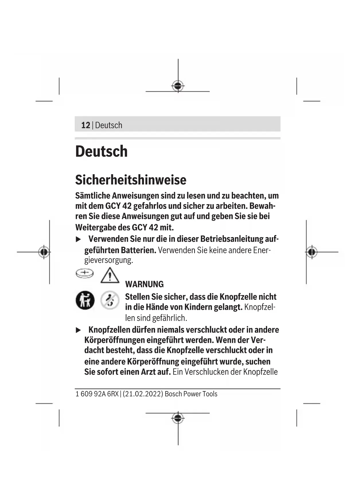 Bosch Power Tools 1 609 92A 6RX | (21.02.2022)12 | Deutsch Deutsch Sicherheitshinweise Sämtliche Anweisungen sind zu lesen und zu beachten, um mit dem GCY42 gefahrlos und sicher zu arbeiten. Bewah- ren Sie diese Anweisungen gut auf und geben Sie sie bei Weitergabe des GCY42 mit. u Verwenden Sie nur die in dieser Betriebsanleitung auf- geführten Batterien. Verwenden Sie keine andere Ener- gieversorgung. WARNUNG Stellen Sie sicher, dass die Knopfzelle nicht in die Hände von Kindern gelangt. Knopfzel- len sind gefährlich. u Knopfzellen dürfen niemals verschluckt oder in andere Körperöffnungen eingeführt werden. Wenn der Ver- dacht besteht, dass die Knopfzelle verschluckt oder in eine andere Körperöffnung eingeführt wurde, suchen Sie sofort einen Arzt auf. Ein Verschlucken der Knopfzelle 1 609 92A 6RX | (21.02.2022) Bosch Power ToolsDeutsch | 13 kann innerhalb von 2 Stunden zu ernsthaften inneren Verät- zungen und zum Tod führen. u Achten Sie beim Wechseln der Knopfzelle auf den sach- gemäßen Austausch der Knopfzelle. Es besteht Explosi- onsgefahr. u Verwenden Sie nur die in dieser Betriebsanleitung auf- geführten Knopfzellen. Verwenden Sie keine anderen Knopfzellen oder eine andere Energieversorgung. u Versuchen Sie nicht, die Knopfzelle wieder aufzuladen und schließen Sie die Knopfzelle nicht kurz. Die Knopf- zelle kann undicht werden, explodieren, brennen und Per- sonen verletzen. u Entfernen und entsorgen Sie entladene Knopfzellen ord- nungsgemäß. Entladene Knopfzellen können undicht wer- den und dadurch das Produkt beschädigen oder Personen verletzen. u Überhitzen Sie die Knopfzelle nicht und werfen Sie sie nicht ins Feuer. Die Knopfzelle kann undicht werden, ex- plodieren, brennen und Personen verletzen. u Beschädigen Sie die Knopfzelle nicht und nehmen Sie die Knopfzelle nicht auseinander. Die Knopfzelle kann un- Bosch Power Tools 1 609 92A 6RX | (21.02.2022)14 | Deutsch dicht werden, explodieren, brennen und Personen verlet- zen. u Bringen Sie eine beschädigte Knopfzelle nicht in Kon- takt mit Wasser. Austretendes Lithium kann mit Wasser Wasserstoff erzeugen und damit zu einem Brand, einer Ex- plosion oder zur Verletzung von Personen führen. Die Wortmarke Bluetooth® wie auch die Bildzeichen (Lo- gos) sind eingetragene Marken und Eigentum der Bluetooth SIG, Inc. Jegliche Verwendung dieser Wortmar- ke/Bildzeichen durch die Robert Bosch Power Tools GmbH erfolgt unter Lizenz. u Benutzen Sie das Bluetooth®-Modul nicht mehr, wenn sich die Abdeckung nicht mehr schließen lässt, entfernen Sie die Knopfzelle und lassen Sie es reparieren. Produkt- und Leistungsbeschreibung Bestimmungsgemäßer Gebrauch Das Bluetooth® Low Energy Module GCY42 ermöglicht die Personalisierung und Statusprüfung eines Elektrowerkzeugs sowie die Übertragung von Einstellungen und Daten basierend 1 609 92A 6RX | (21.02.2022) Bosch Power ToolsDeutsch | 15 auf Bluetooth®-Funktechnologie. Der Datenübertragung muss durch den Verwender zugestimmt werden. Informationen zu angebotenen Connectivity-Funktionen erhal- ten Sie in der Applikation (App) Bosch Toolbox oder in der Bedienungsanleitung des verwendeten Elektrowerkzeugs. Abgebildete Komponenten Die Nummerierung der abgebildeten Komponenten bezieht sich auf die Darstellungen auf den Grafikseiten. (1) Knopfzelle (2) Bluetooth® Low Energy Module GCY 42 (3) Platzhalter