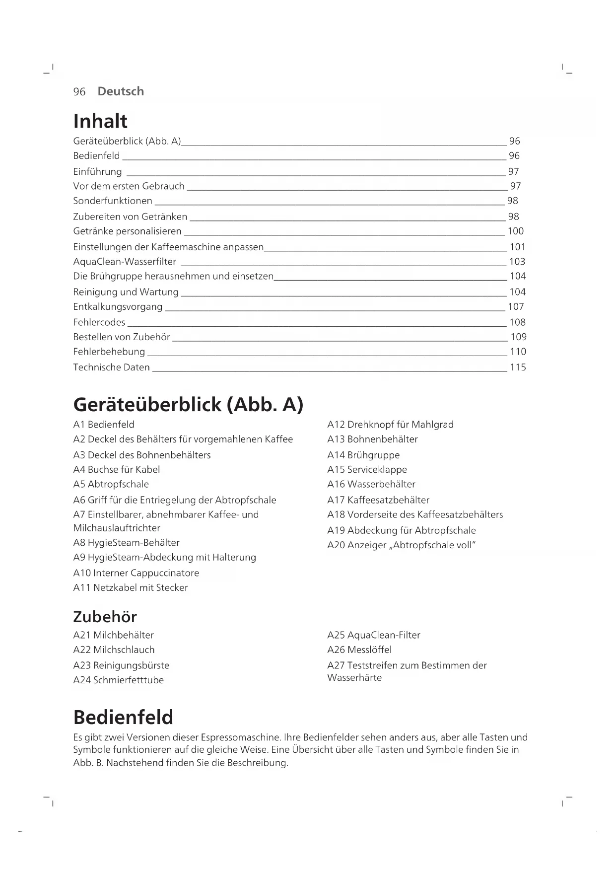 Deutsch Inhalt Geräteüberblick (Abb. A)___________________________________________________________________ 96 Bedienfeld _______________________________________________________________________________ 96 Einführung ______________________________________________________________________________ 97 Vor dem ersten Gebrauch __________________________________________________________________ 97 Sonderfunktionen ________________________________________________________________________ 98 Zubereiten von Getränken _________________________________________________________________ 98 Getränke personalisieren __________________________________________________________________ 100 Einstellungen der Kaffeemaschine anpassen__________________________________________________ 101 AquaClean-Wasserfilter ___________________________________________________________________ 103 Die Brühgruppe herausnehmen und einsetzen________________________________________________ 104 Reinigung und Wartung ___________________________________________________________________ 104 Entkalkungsvorgang ______________________________________________________________________ 107 Fehlercodes ______________________________________________________________________________ 108 Bestellen von Zubehör _____________________________________________________________________ 109 Fehlerbehebung __________________________________________________________________________ 110 Technische Daten _________________________________________________________________________ 115 Geräteüberblick (Abb. A) A1 Bedienfeld A2 Deckel des Behälters für vorgemahlenen Kaffee A3 Deckel des Bohnenbehälters A4 Buchse für Kabel A5 Abtropfschale A6 Griff für die Entriegelung der Abtropfschale A7 Einstellbarer, abnehmbarer Kaffee- und Milchauslauftrichter A8 HygieSteam-Behälter A9 HygieSteam-Abdeckung mit Halterung A10 Interner Cappuccinatore A11 Netzkabel mit Stecker A12 Drehknopf für Mahlgrad A13 Bohnenbehälter A14 Brühgruppe A15 Serviceklappe A16 Wasserbehälter A17 Kaffeesatzbehälter A18 Vorderseite des Kaffeesatzbehälters A19 Abdeckung für Abtropfschale A20 Anzeiger „Abtropfschale voll“ Zubehör A21 Milchbehälter A22 Milchschlauch A23 Reinigungsbürste A24 Schmierfetttube A25 AquaClean-Filter A26 Messlöffel A27 Teststreifen zum Bestimmen der Wasserhärte Bedienfeld Es gibt zwei Versionen dieser Espressomaschine. Ihre Bedienfelder sehen anders aus, aber alle Tasten und Symbole funktionieren auf die gleiche Weise. Eine Übersicht über alle Tasten und Symbole finden Sie in Abb. B. Nachstehend finden Sie die Beschreibung.97 Deutsch Blättern Sie mithilfe des Nach-oben- und Nach-unten-Pfeils durch die Anzeige, und drücken Sie zur Auswahl oder Bestätigung Ihrer Wahl die OK-Taste. B1 Ein-/Ausschalter B2 Symbole für One-Touch-Getränke B3 CoffeeMaestro-Symbol B4 Menü mit weiteren Getränken B5 Start/Stopp-Taste B6 Navigationssymbole (nach oben, nach unten, zurück, OK) B7 Display B8 Geräteeinstellungen B9 Reinigungsmenü B10 Persönliche Profile Einführung Herzlichen Glückwunsch zum Kauf eines Saeco Kaffeevollautomaten! Um den Online-Service von Saeco optimal nutzen zu können, registrieren Sie Ihr Produkt bitte unter www.saeco.com/MyCoffeeMachine. Hinweis: Die Maschine wurde mit Kaffee getestet. Zwar wurde die Maschine anschließend sorgfältig gereinigt, aber es ist möglich, dass noch ein Rest Kaffee in der Maschine ist. Wir garantieren aber, dass Ihre Maschine absolut neu ist. Vor dem ersten Gebrauch