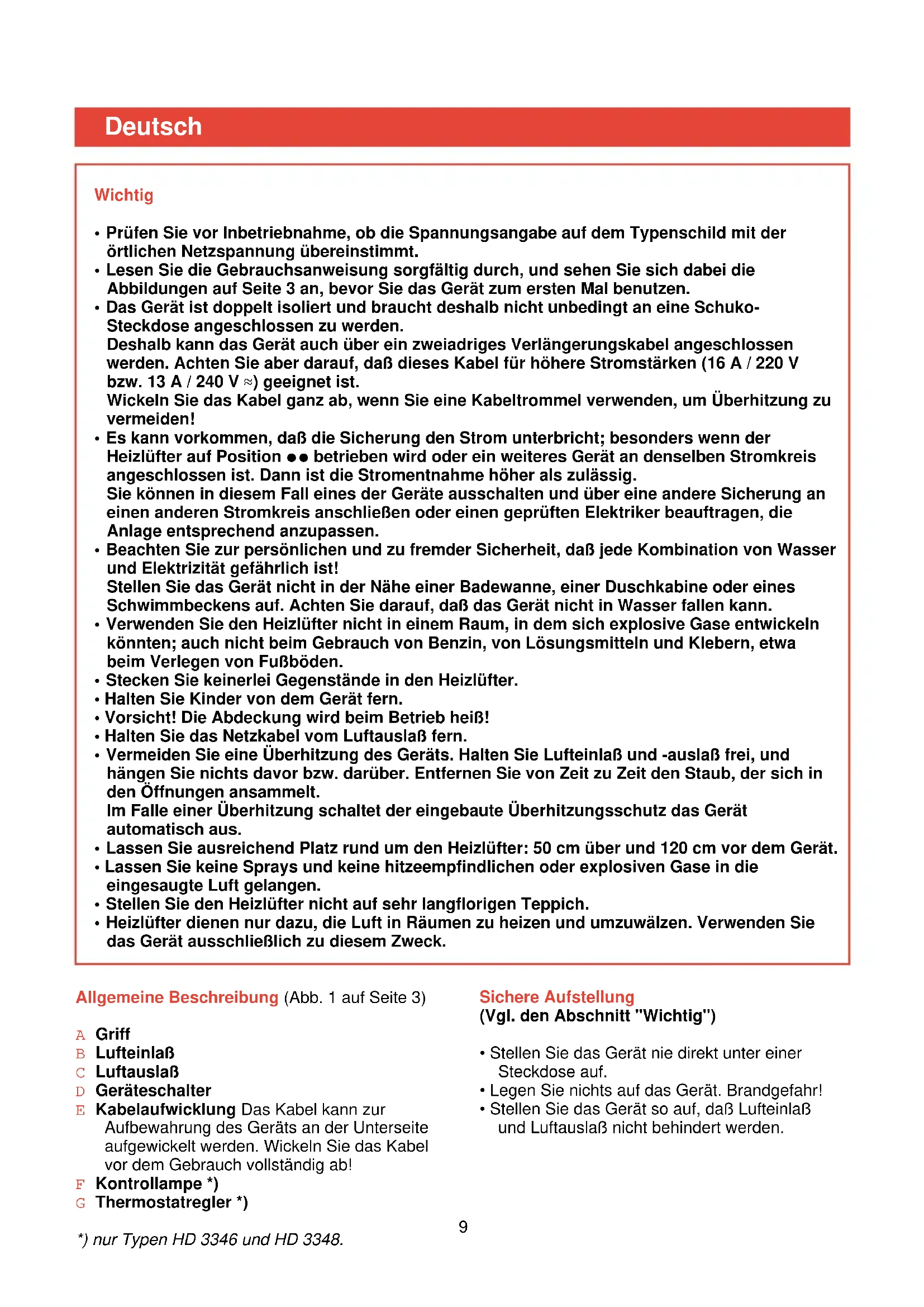 - Lassen Sie rund um das Gerät ausreichend Platz. Das Gerät ein- und ausschalten Mit dem Geräteschalter (D) können Sie die folgenden Funktionen einstellen: O = Aus. Der Ventilator und die beiden Heizelemente werden ausgeschaltet. “ = "Flüsterwind" (Nur Type HD 3348) In dieser Position arbeitet das Gerät fast lautlos. Trotzdem wird soviel Wärme abgegeben, daß sich eine Person in der Nähe des Geräts behaglich fühlt. 1 = "Warmluft" zum allmählichen Erwärmen. Der Ventilator und eines der beiden Heizelement werden eingeschaltet. 2= "Heißluft" zum schnellen Aufheizen. Der Ventilator und beide Heizelemente werden eingeschaltet. Thermostatische Temperaturregelung (Nur Typen HD 3346 und HD 3348) Ihr Heizlüfter ist mit einem Temperaturregler (G) versehen, der die Raumtemperatur über einen Thermostaten aufrechterhält. Der Thermostat mißt die Temperatur und schaltet die Heizelemente ein, wenn die Temperatur zu sinken beginnt, und schaltet sie wieder aus, wenn die eingestellte Temperatur erreicht ist. So stellen Sie die gewünschte Temperatur ein: - Schalten Sie das Gerät ein. - Drehen Sie den Temperaturregler (G) im Uhrzeigersinn auf die höchste Position. - Ist die gewünschte Temperatur erreicht, drehen Sie den Temperaturregler langsam entgegen dem Uhrzeigersinn, bis das Gerät ausgeschaltet wird. - Das Gerät wird von jetzt an immer dann eingeschaltet, wenn die Temperatur unter den eingestellten Wert sinkt. Der Temperaturregler kann bei eingeschaltetem Gerät verstellt werden. Die Kontrollampe - Wenn das Gerät an das Stromnetz angeschlossen und eingeschaltet ist, leuchtet