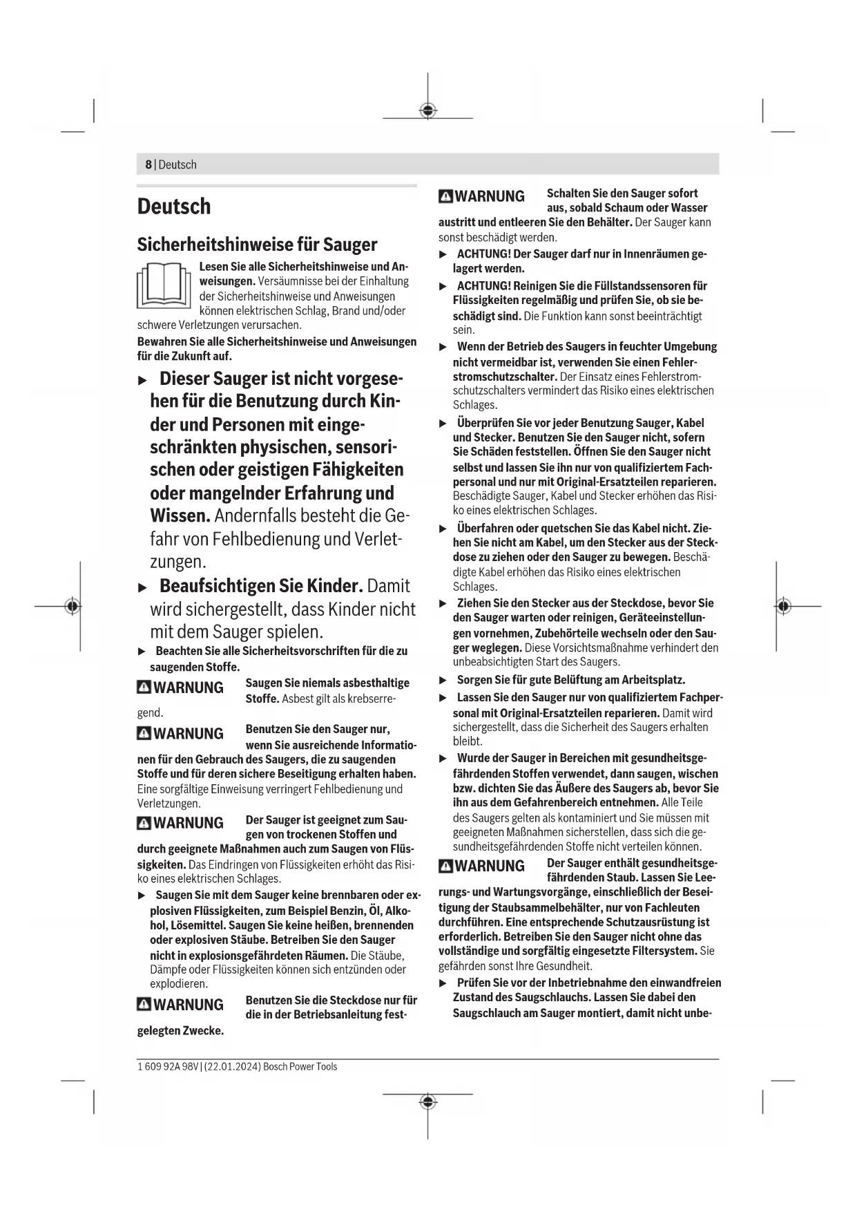 (28) (40) (24) (40) (29) (33) (22) (21) (20) (32) (17) (4) (25) Bosch Power Tools 1 609 92A 98V | (22.01.2024)8 | Deutsch Deutsch Sicherheitshinweise für Sauger Lesen Sie alle Sicherheitshinweise und An- weisungen. Versäumnisse bei der Einhaltung der Sicherheitshinweise und Anweisungen können elektrischen Schlag, Brand und/oder schwere Verletzungen verursachen. Bewahren Sie alle Sicherheitshinweise und Anweisungen für die Zukunft auf. u Dieser Sauger ist nicht vorgese- hen für die Benutzung durch Kin- der und Personen mit einge- schränkten physischen, sensori- schen oder geistigen Fähigkeiten oder mangelnder Erfahrung und Wissen. Andernfalls besteht die Ge- fahr von Fehlbedienung und Verlet- zungen. u Beaufsichtigen Sie Kinder. Damit wird sichergestellt, dass Kinder nicht mit dem Sauger spielen. u Beachten Sie alle Sicherheitsvorschriften für die zu saugenden Stoffe. WARNUNG Saugen Sie niemals asbesthaltige Stoffe. Asbest gilt als krebserre- gend. WARNUNG Benutzen Sie den Sauger nur, wenn Sie ausreichende Informatio- nen für den Gebrauch des Saugers, die zu saugenden Stoffe und für deren sichere Beseitigung erhalten haben. Eine sorgfältige Einweisung verringert Fehlbedienung und Verletzungen. WARNUNG Der Sauger ist geeignet zum Sau- gen von trockenen Stoffen und durch geeignete Maßnahmen auch zum Saugen von Flüs- sigkeiten. Das Eindringen von Flüssigkeiten erhöht das Risi- ko eines elektrischen Schlages. u Saugen Sie mit dem Sauger keine brennbaren oder ex- plosiven Flüssigkeiten, zum Beispiel Benzin, Öl, Alko- hol, Lösemittel. Saugen Sie keine heißen, brennenden oder explosiven Stäube. Betreiben Sie den Sauger nicht in explosionsgefährdeten Räumen. Die Stäube, Dämpfe oder Flüssigkeiten können sich entzünden oder explodieren. WARNUNG Benutzen Sie die Steckdose nur für die in der Betriebsanleitung fest- gelegten Zwecke. WARNUNG Schalten Sie den Sauger sofort aus, sobald Schaum oder Wasser austritt und entleeren Sie den Behälter. Der Sauger kann sonst beschädigt werden. u ACHTUNG! Der Sauger darf nur in Innenräumen ge- lagert werden. u ACHTUNG! Reinigen Sie die Füllstandssensoren für Flüssigkeiten regelmäßig und prüfen Sie, ob sie be- schädigt sind. Die Funktion kann sonst beeinträchtigt sein. u Wenn der Betrieb des Saugers in feuchter Umgebung nicht vermeidbar ist, verwenden Sie einen Fehler- stromschutzschalter. Der Einsatz eines Fehlerstrom- schutzschalters vermindert das Risiko eines elektrischen Schlages. u Überprüfen Sie vor jeder Benutzung Sauger, Kabel und Stecker. Benutzen Sie den Sauger nicht, sofern Sie Schäden feststellen. Öffnen Sie den Sauger nicht selbst und lassen Sie ihn nur von qualifiziertem Fach- personal und nur mit Original-Ersatzteilen reparieren. Beschädigte Sauger, Kabel und Stecker erhöhen das Risi- ko eines elektrischen Schlages. u Überfahren oder quetschen Sie das Kabel nicht. Zie- hen Sie nicht am Kabel, um den Stecker aus der Steck- dose zu ziehen oder den Sauger zu bewegen. Beschä- digte Kabel erhöhen das Risiko eines elektrischen Schlages. u Ziehen Sie den Stecker aus der Steckdose, bevor Sie den Sauger warten oder reinigen, Geräteeinstellun- gen vornehmen, Zubehörteile wechseln oder den Sau- ger weglegen. Diese Vorsichtsmaßnahme verhindert den unbeabsichtigten Start des Saugers. u Sorgen Sie für gute Belüftung am Arbeitsplatz.u Lassen Sie den Sauger nur von qualifiziertem Fachper- sonal mit Original-Ersatzteilen reparieren. Damit wird sichergestellt, dass die Sicherheit des Saugers erhalten bleibt. u Wurde der Sauger in Bereichen mit gesundheitsge- fährdenden Stoffen verwendet, dann saugen, wischen bzw. dichten Sie das Äußere des Saugers ab, bevor Sie ihn aus dem Gefahrenbereich entnehmen. Alle Teile des Saugers gelten als kontaminiert und Sie müssen mit geeigneten Maßnahmen sicherstellen, dass sich die ge- sundheitsgefährdenden Stoffe nicht verteilen können. WARNUNG Der Sauger enthält gesundheitsge- fährdenden Staub. Lassen Sie Lee- rungs- und Wartungsvorgänge, einschließlich der Besei- tigung der Staubsammelbehälter, nur von Fachleuten durchführen. Eine entsprechende Schutzausrüstung ist erforderlich. Betreiben Sie den Sauger nicht ohne das vollständige und sorgfältig eingesetzte Filtersystem. Sie gefährden sonst Ihre Gesundheit. u Prüfen Sie vor der Inbetriebnahme den einwandfreien Zustand des Saugschlauchs. Lassen Sie dabei den Saugschlauch am Sauger montiert, damit nicht unbe- 1 609 92A 98V | (22.01.2024) Bosch Power ToolsDeutsch | 9 absichtigt Staub austritt. Sie können sonst Staub einat- men. u Benutzen Sie den Sauger nicht als Sitzgelegenheit. Sie können den Sauger beschädigen. u Verwenden Sie das Netzkabel und den Saugschlauch sorgfältig. Sie können andere Personen damit gefähr- den. u Reinigen Sie den Sauger nicht mit direkt gerichtetem Wasserstrahl. Das Eindringen von Wasser in das Sauger- oberteil erhöht das Risiko eines elektrischen Schlages. u Schließen Sie den Sauger an ein ordnungsgemäß geer- detes Stromnetz an. Steckdose und Verlängerungskabel müssen einen funktionsfähigen Schutzleiter besitzen. Symbole Die nachfolgenden Symbole können für den Gebrauch Ihres Saugers von Bedeutung sein. Prägen Sie sich bitte die Sym- bole und ihre Bedeutung ein. Die richtige Interpretation der Symbole hilft Ihnen, den Sauger besser und sicherer zu ge- brauchen. Symbole und ihre Bedeutung WARNUNG! Lesen Sie alle Sicherheits- hinweise und Anweisungen. Versäum- nisse bei der Einhaltung der Sicherheits- hinweise und Anweisungen können elek- trischen Schlag, Brand und/oder schwe- re Verletzungen verursachen. Sauger der StaubklasseH nach IEC/ EN60335‑2‑69 zum Trockensaugen von gesundheitsgefährdenden Stäuben mit einem Expositions-Grenzwert <0,1mg/m