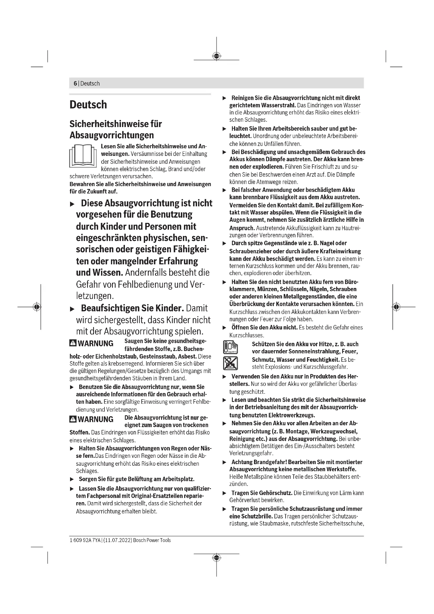 (24) (25) (16) (24) (24) (26) (25) (25) Bosch Power Tools 1 609 92A 7YA | (11.07.2022)6 | Deutsch Deutsch Sicherheitshinweise für Absaugvorrichtungen Lesen Sie alle Sicherheitshinweise und An- weisungen. Versäumnisse bei der Einhaltung der Sicherheitshinweise und Anweisungen können elektrischen Schlag, Brand und/oder schwere Verletzungen verursachen. Bewahren Sie alle Sicherheitshinweise und Anweisungen für die Zukunft auf. u Diese Absaugvorrichtung ist nicht vorgesehen für die Benutzung durch Kinder und Personen mit eingeschränkten physischen, sen- sorischen oder geistigen Fähigkei- ten oder mangelnder Erfahrung und Wissen. Andernfalls besteht die Gefahr von Fehlbedienung und Ver- letzungen. u Beaufsichtigen Sie Kinder. Damit wird sichergestellt, dass Kinder nicht mit der Absaugvorrichtung spielen. WARNUNG Saugen Sie keine gesundheitsge- fährdenden Stoffe, z.B. Buchen- holz- oder Eichenholzstaub, Gesteinsstaub, Asbest. Diese Stoffe gelten als krebserregend. Informieren Sie sich über die gültigen Regelungen/Gesetze bezüglich des Umgangs mit gesundheitsgefährdenden Stäuben in Ihrem Land. u Benutzen Sie die Absaugvorrichtung nur, wenn Sie ausreichende Informationen für den Gebrauch erhal- ten haben. Eine sorgfältige Einweisung verringert Fehlbe- dienung und Verletzungen. WARNUNG Die Absaugvorrichtung ist nur ge- eignet zum Saugen von trockenen Stoffen. Das Eindringen von Flüssigkeiten erhöht das Risiko eines elektrischen Schlages. u Halten Sie Absaugvorrichtungen von Regen oder Näs- se fern.Das Eindringen von Regen oder Nässe in die Ab- saugvorrichtung erhöht das Risiko eines elektrischen Schlages. u Sorgen Sie für gute Belüftung am Arbeitsplatz.u Lassen Sie die Absaugvorrichtung nur von qualifizier- tem Fachpersonal mit Original-Ersatzteilen reparie- ren. Damit wird sichergestellt, dass die Sicherheit der Absaugvorrichtung erhalten bleibt. u Reinigen Sie die Absaugvorrichtung nicht mit direkt gerichtetem Wasserstrahl. Das Eindringen von Wasser in die Absaugvorrichtung erhöht das Risiko eines elektri- schen Schlages. u Halten Sie Ihren Arbeitsbereich sauber und gut be- leuchtet. Unordnung oder unbeleuchtete Arbeitsberei- che können zu Unfällen führen. u Bei Beschädigung und unsachgemäßem Gebrauch des Akkus können Dämpfe austreten. Der Akku kann bren- nen oder explodieren. Führen Sie Frischluft zu und su- chen Sie bei Beschwerden einen Arzt auf. Die Dämpfe können die Atemwege reizen. u Bei falscher Anwendung oder beschädigtem Akku kann brennbare Flüssigkeit aus dem Akku austreten. Vermeiden Sie den Kontakt damit. Bei zufälligem Kon- takt mit Wasser abspülen. Wenn die Flüssigkeit in die Augen kommt, nehmen Sie zusätzlich ärztliche Hilfe in Anspruch. Austretende Akkuflüssigkeit kann zu Hautrei- zungen oder Verbrennungen führen. u Durch spitze Gegenstände wie z. B. Nagel oder Schraubenzieher oder durch äußere Krafteinwirkung kann der Akku beschädigt werden. Es kann zu einem in- ternen Kurzschluss kommen und der Akku brennen, rau- chen, explodieren oder überhitzen. u Halten Sie den nicht benutzten Akku fern von Büro- klammern, Münzen, Schlüsseln, Nägeln, Schrauben oder anderen kleinen Metallgegenständen, die eine Überbrückung der Kontakte verursachen könnten. Ein Kurzschluss zwischen den Akkukontakten kann Verbren- nungen oder Feuer zur Folge haben. u Öffnen Sie den Akku nicht. Es besteht die Gefahr eines Kurzschlusses. Schützen Sie den Akku vor Hitze, z. B. auch vor dauernder Sonneneinstrahlung, Feuer, Schmutz, Wasser und Feuchtigkeit. Es be- steht Explosions- und Kurzschlussgefahr. u Verwenden Sie den Akku nur in Produkten des Her- stellers. Nur so wird der Akku vor gefährlicher Überlas- tung geschützt. u Lesen und beachten Sie strikt die Sicherheitshinweise in der Betriebsanleitung des mit der Absaugvorrich- tung benutzten Elektrowerkzeugs. u Nehmen Sie den Akku vor allen Arbeiten an der Ab- saugvorrichtung (z.B. Montage, Werkzeugwechsel, Reinigung etc.) aus der Absaugvorrichtung. Bei unbe- absichtigtem Betätigen des Ein-/Ausschalters besteht Verletzungsgefahr. u Achtung Brandgefahr! Bearbeiten Sie mit montierter Absaugvorrichtung keine metallischen Werkstoffe. Heiße Metallspäne können Teile des Staubbehälters ent- zünden. u Tragen Sie Gehörschutz. Die Einwirkung von Lärm kann Gehörverlust bewirken. u Tragen Sie persönliche Schutzausrüstung und immer eine Schutzbrille. Das Tragen persönlicher Schutzaus- rüstung, wie Staubmaske, rutschfeste Sicherheitsschuhe, 1 609 92A 7YA | (11.07.2022) Bosch Power ToolsDeutsch | 7 Schutzhelm oder Gehörschutz, je nach Art und Einsatz des Elektrowerkzeuges, verringert das Risiko von Verlet- zungen. u Überprüfen Sie den Klemmring auf Verformungen, die die Befestigung der Absaugvorrichtung beeinträchtigen kön- nen. Wenn der Klemmring beschädigt ist, lassen Sie die Absaugvorrichtung vor dem Gebrauch reparieren. u Halten Sie das Elektrowerkzeug beim Arbeiten fest mit beiden Händen und sorgen Sie für einen sicheren Stand. Das Elektrowerkzeug wird mit zwei Händen siche- rer geführt. u Halten Sie gültige nationale und internationale Nor- men ein. Produkt- und Leistungsbeschreibung Lesen Sie alle Sicherheits- hinweise und Anweisun- gen. Versäumnisse bei der Einhaltung der Sicherheits- hinweise und Anweisungen können elektrischen Schlag, Brand und/oder schwere Ver- letzungen verursachen. Bitte beachten Sie die Abbildungen im vorderen Teil der Be- triebsanleitung. Bestimmungsgemäßer Gebrauch Die Absaugvorrichtung ist für das Absaugen von Staub beim Bohren in Beton oder Mauerwerk bestimmt. Die Absaugvorrichtung darf nur mit folgenden Bohrhämmern betrieben werden: Absaugvorrichtung zulässige Bohrhämmer GDE 18V-26 D mit Stabilisie- rungsbügel (11) GBH 2-26