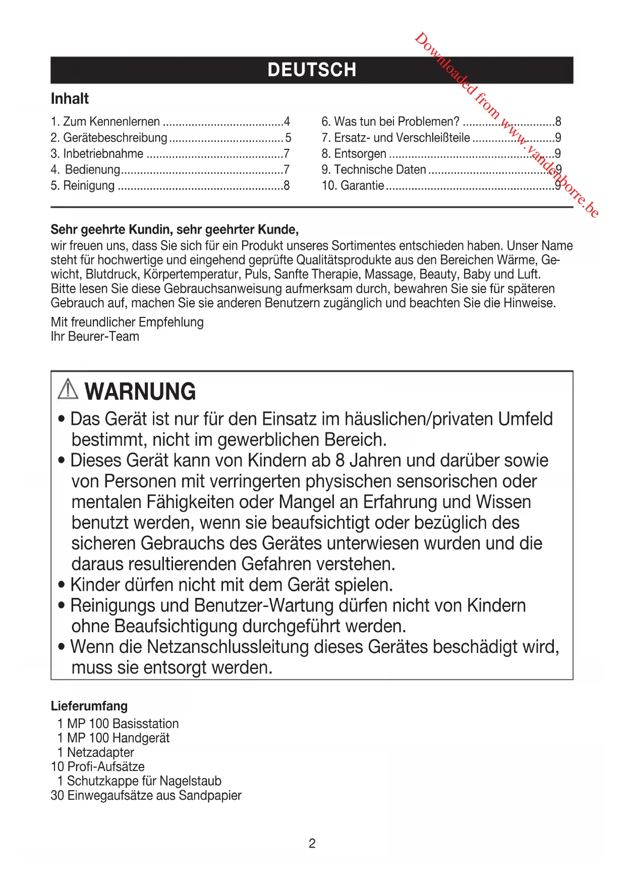 Mail: kd@beurer.de MP 100 Downloaded from www.vandenborre.be2 Sehr geehrte Kundin, sehr geehrter Kunde,wir freuen uns, dass Sie sich für ein Produkt unseres Sortimentes entschieden haben. Unser Name steht für hochwertige und eingehend geprüfte Qualitätsprodukte aus den Bereichen Wärme, Ge wicht, Blutdruck, Körpertemperatur, Puls, Sanfte Therapie, Massage, Beauty, Baby und Luft.Bitte lesen Sie diese Gebrauchsanweisung aufmerksam durch, bewahren Sie sie für späteren Gebrauch auf, machen Sie sie anderen Benutzern zugänglich und beachten Sie die Hinweise.Mit freundlicher EmpfehlungIhr Beurer-Team WARNUNG