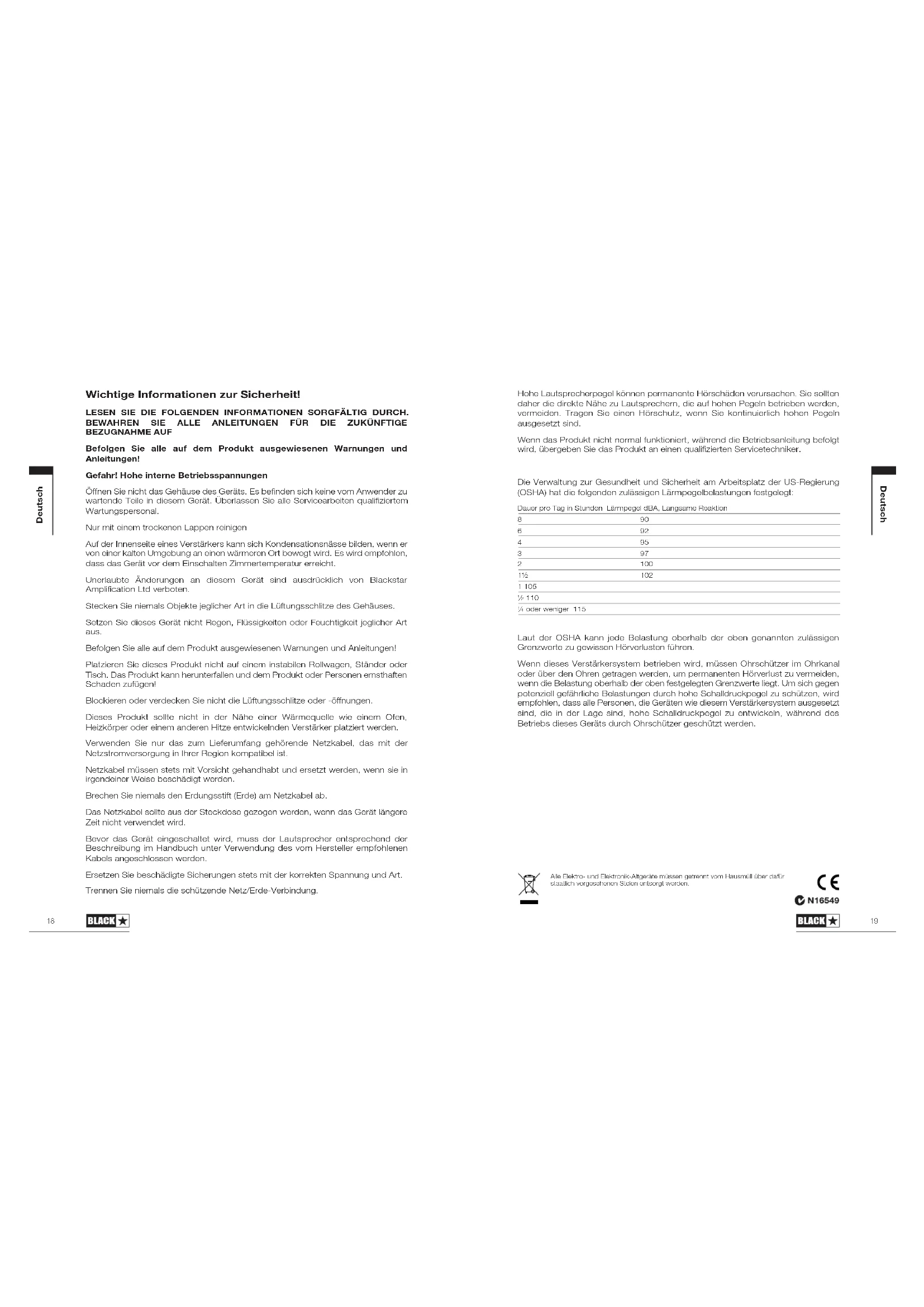 Cabinets Connected Impedance Selected 1 x 16 Ohm cabinet 16 Ohms 2 x 16 Ohm cabinets 8 Ohms 1 x 8 Ohm cabinet 8 Ohms 2 x 8 Ohm cabinets 4 Ohms 1 x 4 Ohm cabinet 4 OhmsHohe Lautsprecherpegel können permanente Hörschäden verursachen. Sie sollten daher die direkte Nähe zu Lautsprechern, die auf hohen Pegeln betrieben werden, vermeiden. Tragen Sie einen Hörschutz, wenn Sie kontinuierlich hohen Pegeln ausgesetzt sind. Wenn das Produkt nicht normal funktioniert, während die Betriebsanleitung befolgt wird, übergeben Sie das Produkt an einen qualifizierten Servicetechniker. Die Verwaltung zur Gesundheit und Sicherheit am Arbeitsplatz der US-Regierung (OSHA) hat die folgenden zulässigen Lärmpegelbelastungen festgelegt: Dauer pro Tag in Stunden Lärmpegel dBA, Langsame Reaktion