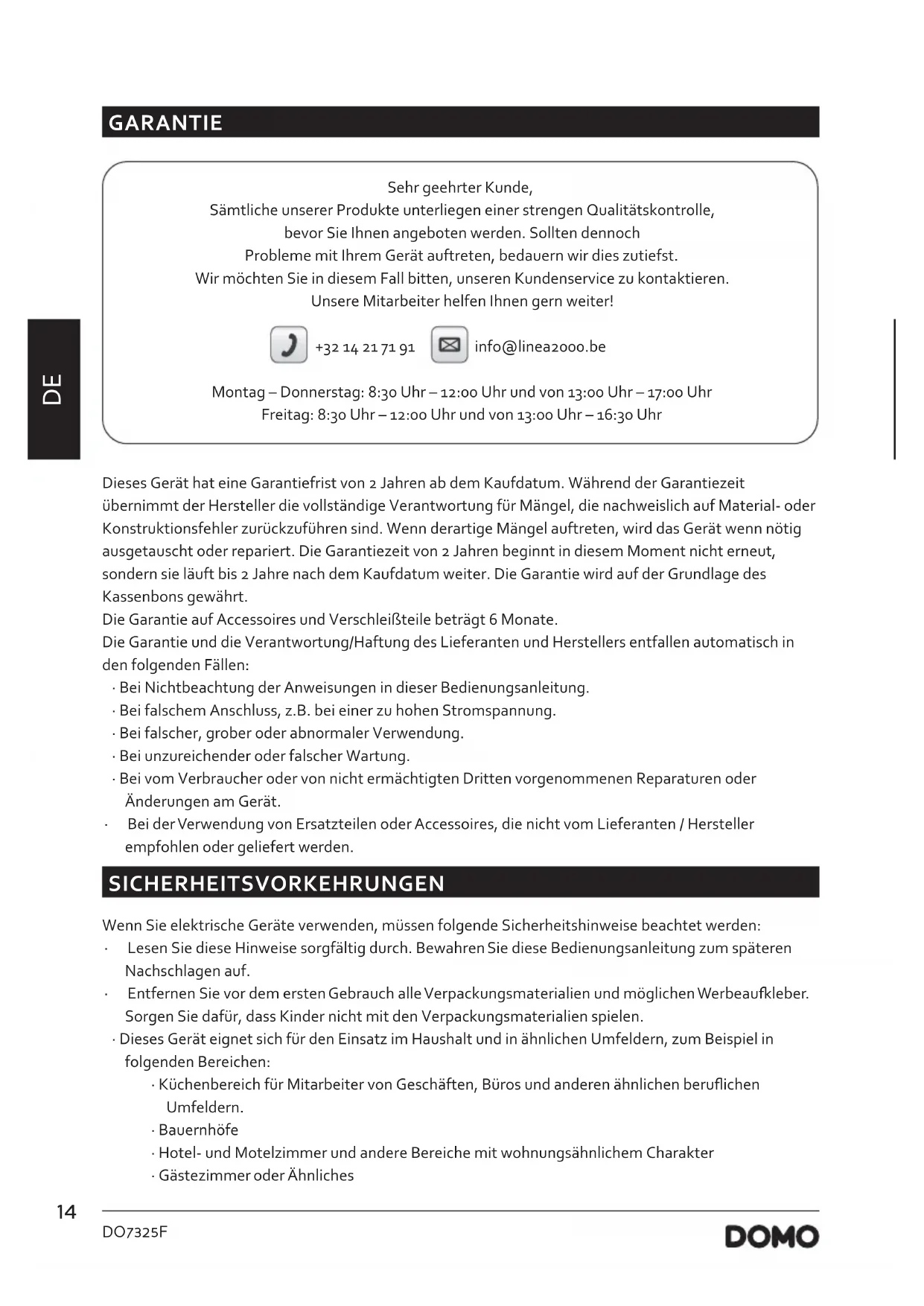 GARANTIE Sehr geehrter Kunde, Sämtliche unserer Produkte unterliegen einer strengen Qualitätskontrolle, bevor Sie Ihnen angeboten werden. Sollten dennoch Probleme mit Ihrem Gerät auftreten, bedauern wir dies zutiefst. Wir möchten Sie in diesem Fall bitten, unseren Kundenservice zu kontaktieren. Unsere Mitarbeiter helfen Ihnen gern weiter! +32 14 21 71 91 info@linea2000.be Montag – Donnerstag: 8:30 Uhr – 12:00 Uhr und von 13:00 Uhr – 17:00 Uhr Freitag: 8:30 Uhr – 12:00 Uhr und von 13:00 Uhr – 16:30 Uhr Dieses Gerät hat eine Garantiefrist von 2 Jahren ab dem Kaufdatum. Während der Garantiezeit übernimmt der Hersteller die vollständige Verantwortung für Mängel, die nachweislich auf Material- oder Konstruktionsfehler zurückzuführen sind. Wenn derartige Mängel auftreten, wird das Gerät wenn nötig ausgetauscht oder repariert. Die Garantiezeit von 2 Jahren beginnt in diesem Moment nicht erneut, sondern sie läuft bis 2 Jahre nach dem Kaufdatum weiter. Die Garantie wird auf der Grundlage des Kassenbons gewährt. Die Garantie auf Accessoires und Verschleißteile beträgt 6 Monate. Die Garantie und die Verantwortung/Haftung des Lieferanten und Herstellers entfallen automatisch in den folgenden Fällen: