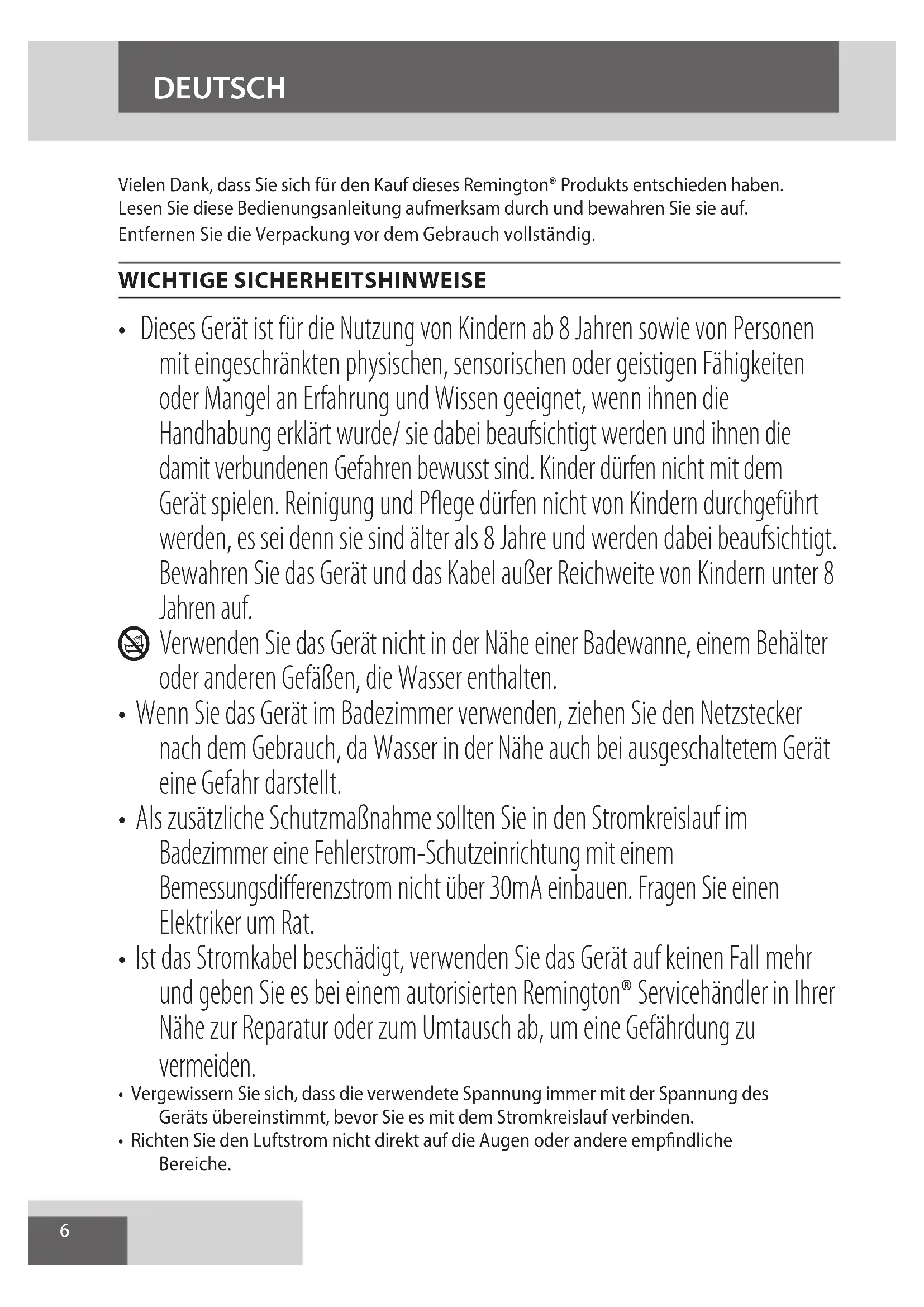 AE6 DEUTSCH Vielen Dank, dass Sie sich für den Kauf dieses Remington® Produkts entschieden haben. Lesen Sie diese Bedienungsanleitung aufmerksam durch und bewahren Sie sie auf. Entfernen Sie die Verpackung vor dem Gebrauch vollständig. WICHTIGE SICHERHEITSHINWEISE