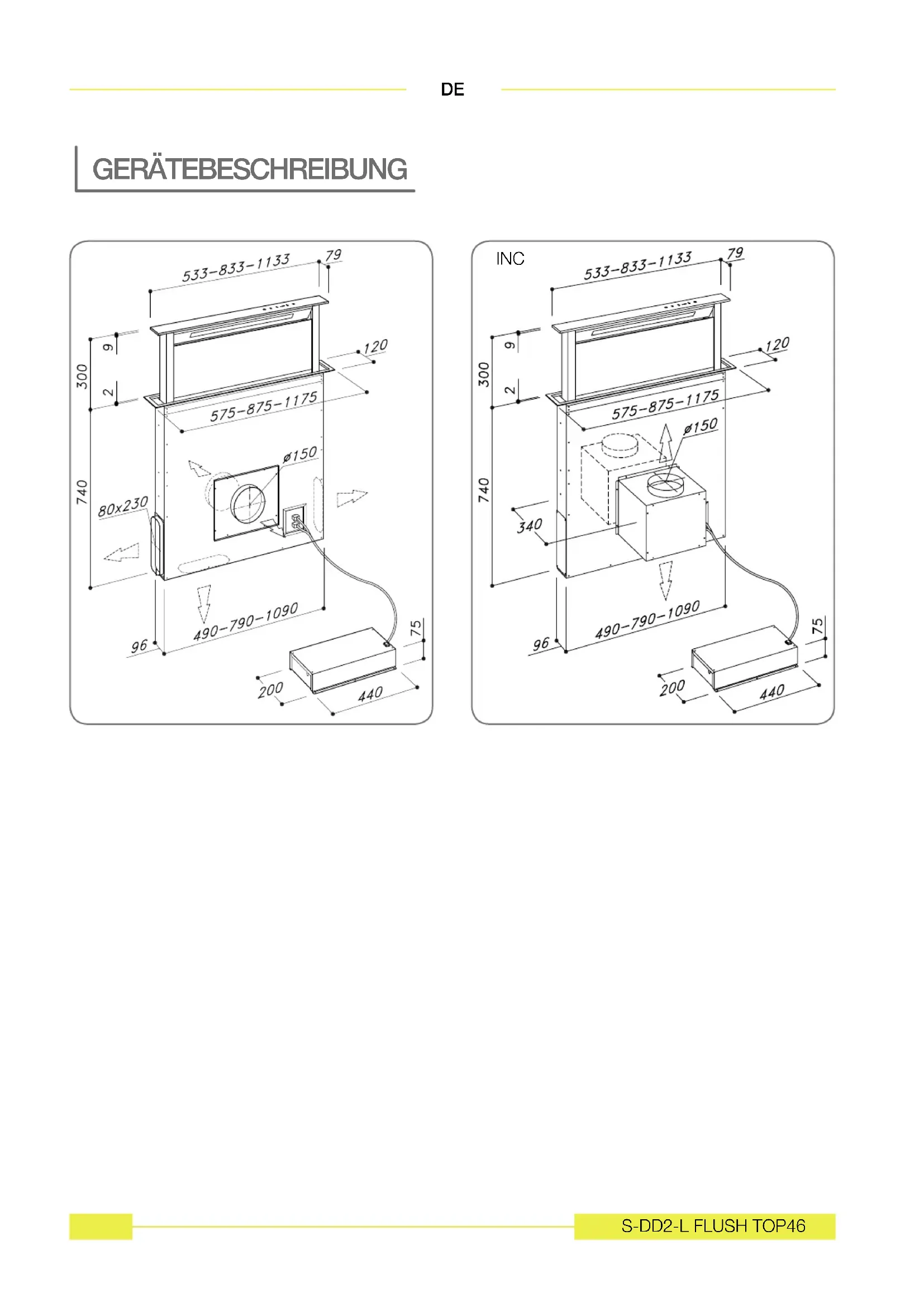 Der Downdraft ist mit Sicherheitsschalter verse- hen, die den Betrieb des Geräts unterbrechen, wenn der vordere Filterschutz entfernt wird. In der Absicht unsere Produkte ständig zu ver- bessern, behalten wir uns das Recht vor, an den technischen, funktionellen und ästhetischen Ei- genschaften alle Veränderungen vorzunehmen, die sich aus ihrer Weiterentwicklung ergeben. Bei Ausführungen mit externem Motor muss für den normalen Betrieb des Downdrafts (versenk- baren Klappe) ein Absauggerät (externer Motor) des gleichen Herstellers verwendet werden. Die angesaugte Luft darf nicht in ein Rohr geführt werden, das gleichzeitig auch als Rauchabzug für Geräte dient, die nicht mit Strom betrieben werden (Zentralheizungen usw.). Zur Ableitung der Luft müssen die Vorschriften der zuständi- gen Behörden eingehalten werden. WARNUNG Bewahren Sie die vorliegende Bedienungs- anleitung mit dem Gerät auf. Sollte das Gerät verkauft oder abgegeben werden, vergewissern Sie sich, dass die mit der vor- liegenden Bedienungsanleitung geschieht. Wir danken Ihnen dafür, dass Sie die Hin- weise vor der Installation und Inbetriebnah- me des Gerätes beachten. Dies dient Ihrer Sicherheit und der Sicherheit anderer.S-DD2-L FLUSH TOP 45