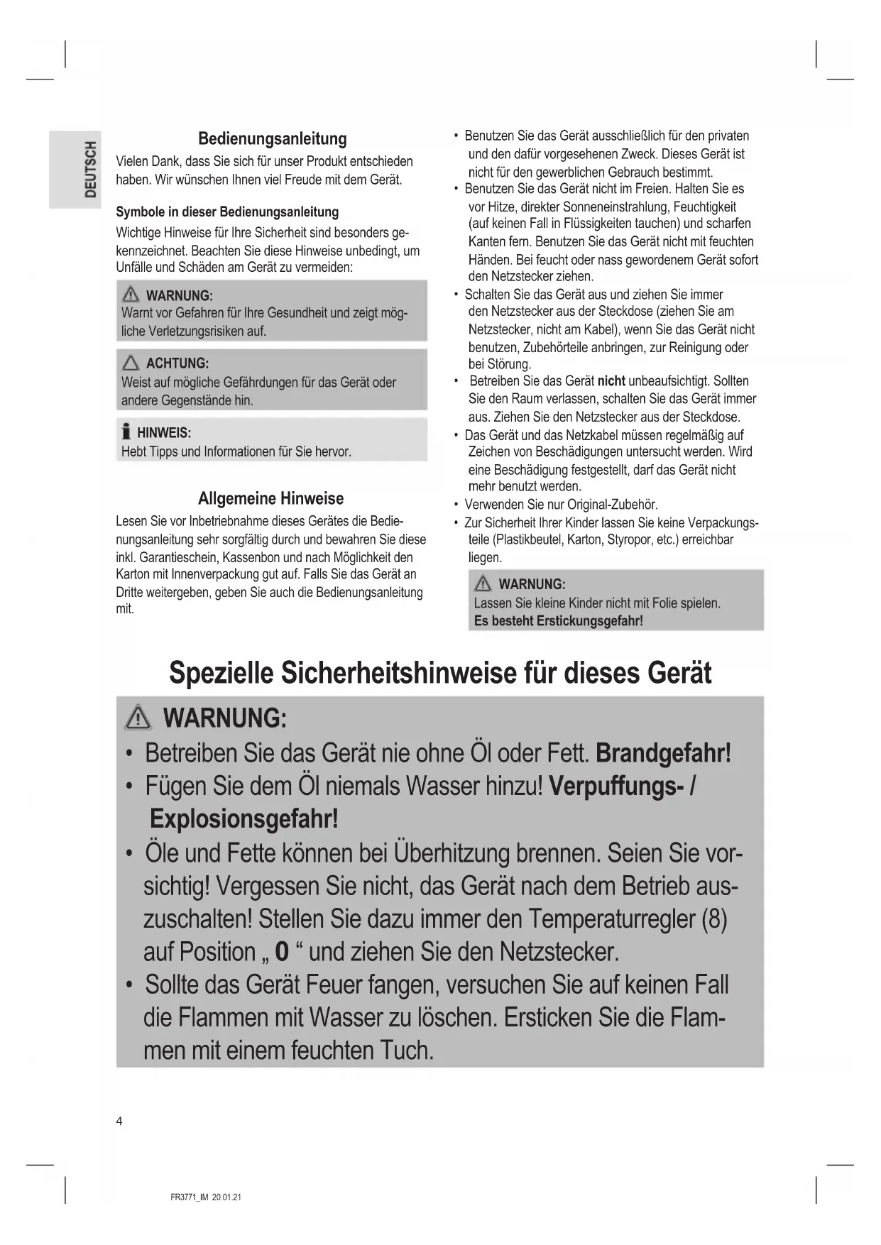 - Sollte das Gerät Feuer fangen, versuchen Sie auf keinen Fall die Flammen mit Wasser zu löschen. Ersticken Sie die Flam- men mit einem feuchten Tuch.5 FR3771_IM 20.01.21 WARNUNG:
