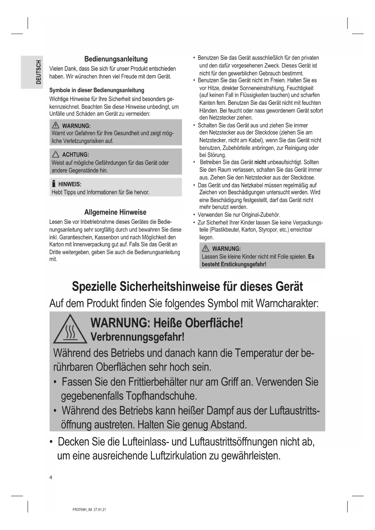 - Lagern Sie das Gerät immer außerhalb der Reichweite von Kindern an einem gut belüfteten und trockenen Ort. Störungsbehebung Tritt ein Problem auf, liegt es oft nur an einer Kleinigkeit. Bevor Sie sich an unseren Service wenden, beachten Sie bitte folgende Hinweise: Problem Mögliche Ursache Abhilfe Das Gerät ist ohne Funktion. Das Gerät hat keine Stromversorgung. Überprüfen Sie die Steckdose mit einem anderen Gerät. Setzen Sie den Netzstecker richtig ein. Kontrollieren Sie die Haussicherung. Sie haben keine Garzeit eingestellt. Wählen Sie eine gewünschte Garzeit. Die Nahrungsmittel sind noch nicht fertig gegart. Der Frittierbehälter ist überfüllt. Reduzieren Sie die Menge der Nahrungsmittel. Kleinere Mengen werden gleichmäßiger gegart. Die Temperatur ist zu niedrig eingestellt. Stellen Sie die Temperatur mit dem Temperaturreg- ler höher ein (siehe „Tabelle der Garzeiten“). Die Garzeit ist zu kurz eingestellt. Stellen Sie die Zeit mit der Zeitschaltuhr länger ein (siehe „Tabelle der Garzeiten“). Die Nahrungsmittel sind ungleichmäßig gegart. Wenn Nahrungsmittel übereinander liegen, ist keine ausreichende Luftzirkulation gegeben. Die Nahrungsmittel müssen nach der Hälfte der Zubereitungszeit geschüttelt werden. Die Nahrungsmittel sind nicht knusprig. Es wurden Nahrungsmittel verwendet, die nur für eine herkömmliche Fritteuse geeignet sind. Verwenden Sie ofenfertige Nahrungsmittel oder bestreichen Sie sie mit etwas Öl. Rauch tritt aus dem Gerät. Sie bereiten sehr fetthaltige Nahrungsmittel zu. Durch Fettspritzer im Inneren des Gerätes kann es zur Rauchentwicklung kommen. Sorgen Sie für aus- reichende Belüftung. Im Frittierbehälter benden sich noch Fettrück- stände vom vorherigen Gebrauch. Reinigen Sie den Frittierbehälter nach jedem Ge- brauch wie im Kapitel „Reinigung“ beschrieben.9 FR3769H_IM 27.01.21 Technische Daten Modell: ................................................................... FR 3769 H Spannungsversorgung: ......................220 - 240 V~, 50 - 60 Hz Leistungsaufnahme:....................................................1000 W Schutzklasse: ......................................................................... Nettogewicht: ...........................................................ca. 2,5 kg Technische und gestalterische Änderungen im Zuge stetiger Produktentwicklungen vorbehalten. Hinweis zur Richtlinienkonformität Hiermit erklärt der Hersteller, dass sich das Gerät FR 3769 H in Übereinstimmung mit den folgenden Anforderungen bendet: