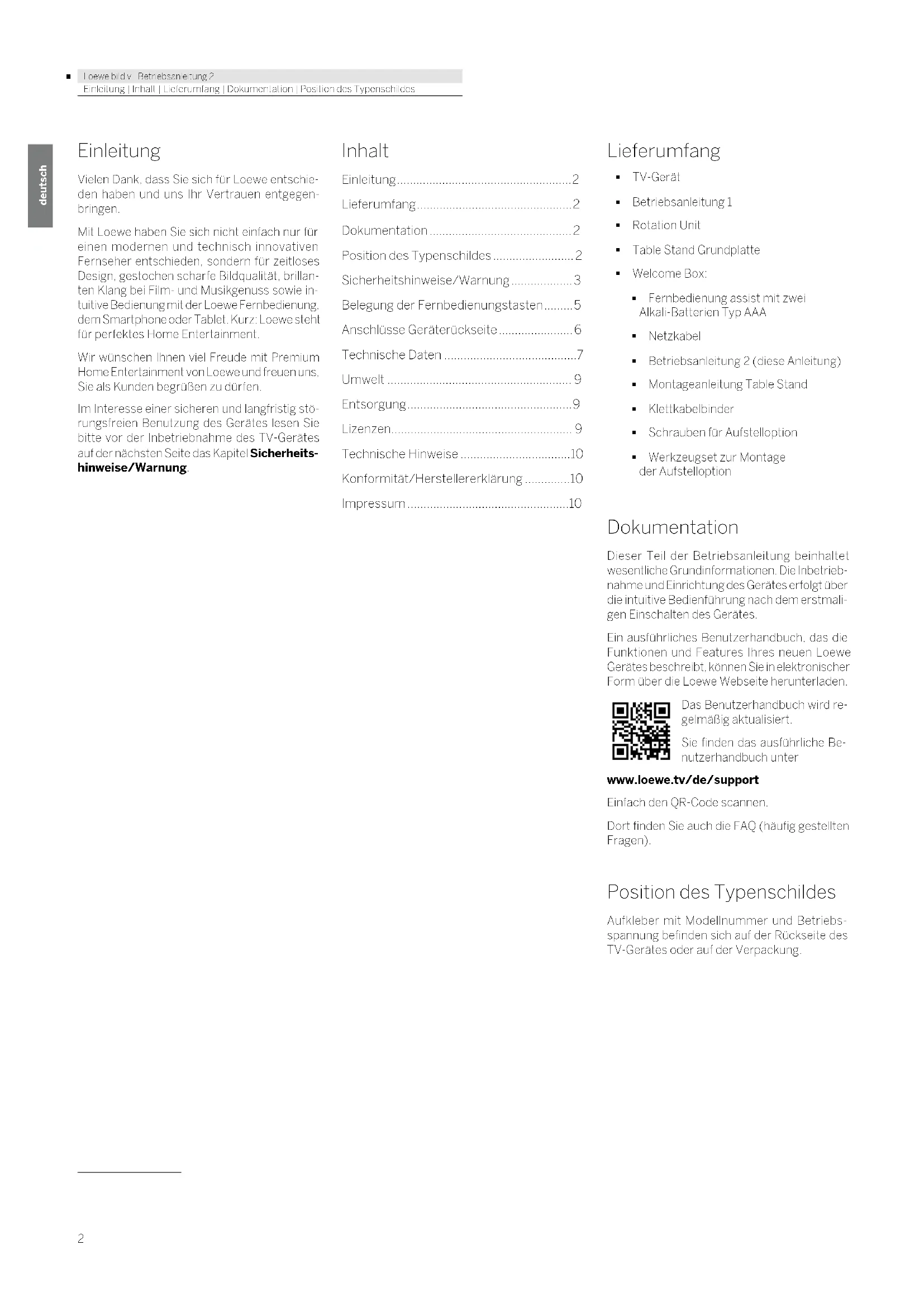 - Impressum Lieferumfang TV-Gerät Betriebsanleitung 1 Rotation Unit Table Stand Grundplatte Welcome Box: Fernbedienung assist mit zwei Alkali-Batterien Typ AAA Netzkabel Betriebsanleitung 2 (diese Anleitung) Montageanleitung Table Stand Klettkabelbinder Schrauben für Aufstelloption Werkzeugset zur Montage der Aufstelloption Dokumentation Dieser Teil der Betriebsanleitung beinhaltet wesentliche Grundinformationen. Die Inbetrieb- nahme und Einrichtung des Gerätes erfolgt über die intuitive Bedienführung nach dem erstmali- gen Einschalten des Gerätes. Ein ausführliches Benutzerhandbuch, das die Funktionen und Features Ihres neuen Loewe Gerätes beschreibt, können Sie in elektronischer Form über die Loewe Webseite herunterladen. Das Benutzerhandbuch wird re- gelmäßig aktualisiert. Sie finden das ausführliche Be- nutzerhandbuch unter www.loewe.tv/de/support Einfach den QR-Code scannen. Dort finden Sie auch die FAQ (häufig gestellten Fragen). Position des Typenschildes Aufkleber mit Modellnummer und Betriebs- spannung befinden sich auf der Rückseite des TV-Gerätes oder auf der Verpackung. Loewe bild v | Betriebsanleitung 2 deutsch p. 10
