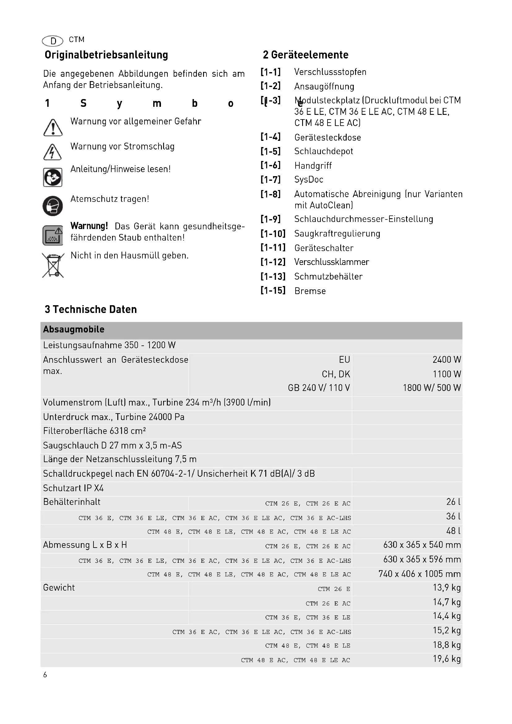 Originalbetriebsanleitung Die angegebenen Abbildungen befinden sich am Anfang der Betriebsanleitung. 1Symbole 2 Geräteelemente 3 Technische Daten Warnung vor allgemeiner Gefahr Warnung vor Stromschlag Anleitung/Hinweise lesen! Atemschutz tragen! Warnung! Das Gerät kann gesundheitsge- fährdenden Staub enthalten! Nicht in den Hausmüll geben. [1-1] Verschlussstopfen [1-2] Ansaugöffnung [1-3] Modulsteckplatz (Druckluftmodul bei CTM 36 E LE, CTM 36 E LE AC, CTM 48 E LE, CTM 48 E LE AC) [1-4] Gerätesteckdose [1-5] Schlauchdepot [1-6] Handgriff [1-7] SysDoc [1-8] Automatische Abreinigung (nur Varianten mit AutoClean) [1-9] Schlauchdurchmesser-Einstellung [1-10] Saugkraftregulierung [1-11] Geräteschalter [1-12] Verschlussklammer [1-13] Schmutzbehälter [1-15] Bremse Absaugmobile Leistungsaufnahme 350 - 1200 W Anschlusswert an Gerätesteckdose max.